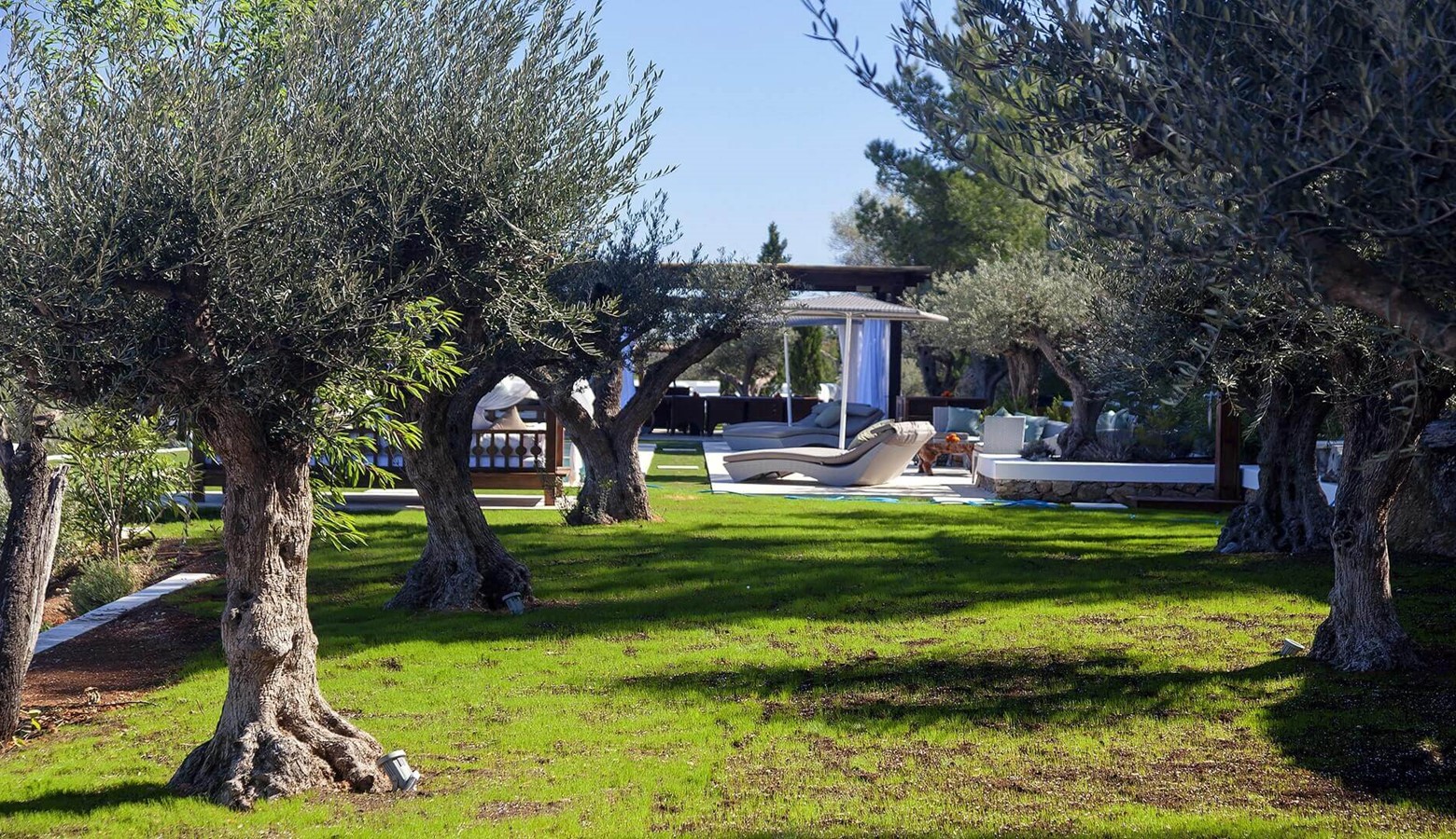 Large dining table, seating area and chillout beds and parasols. To one side of the villa is a backdrop of mature trees and to the other side beautiful rural views