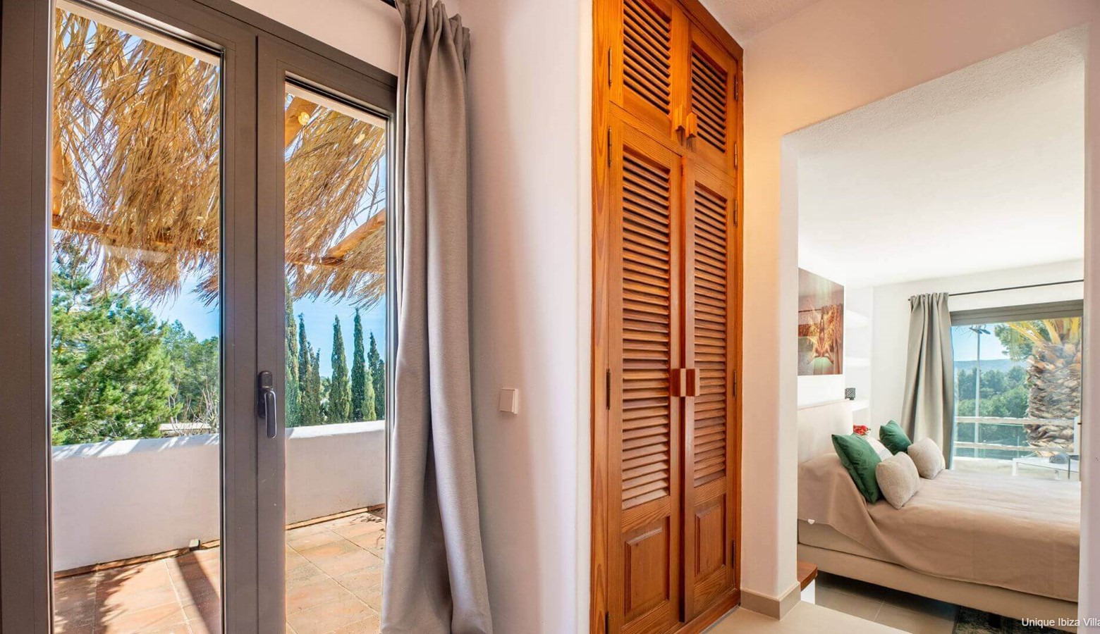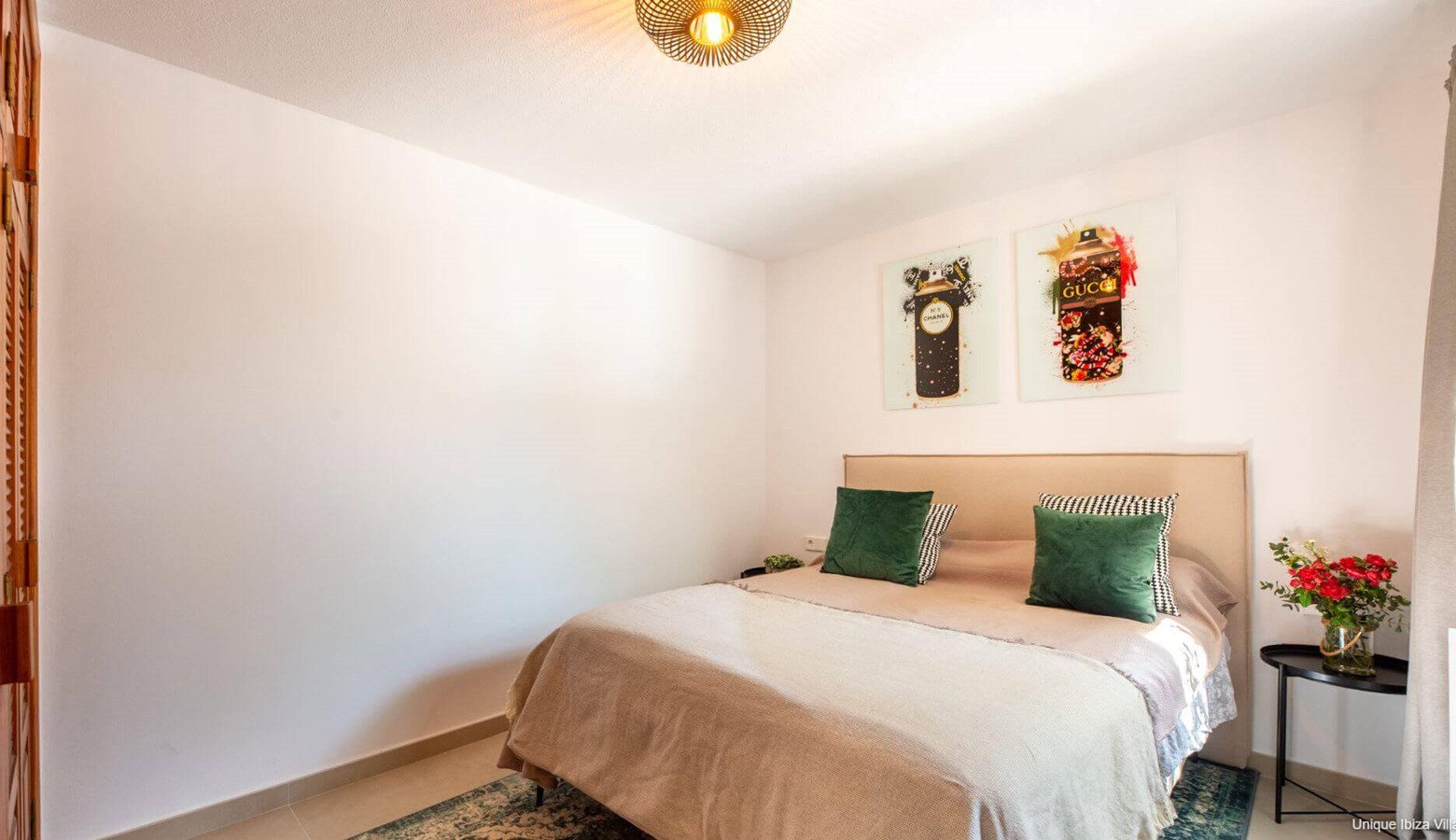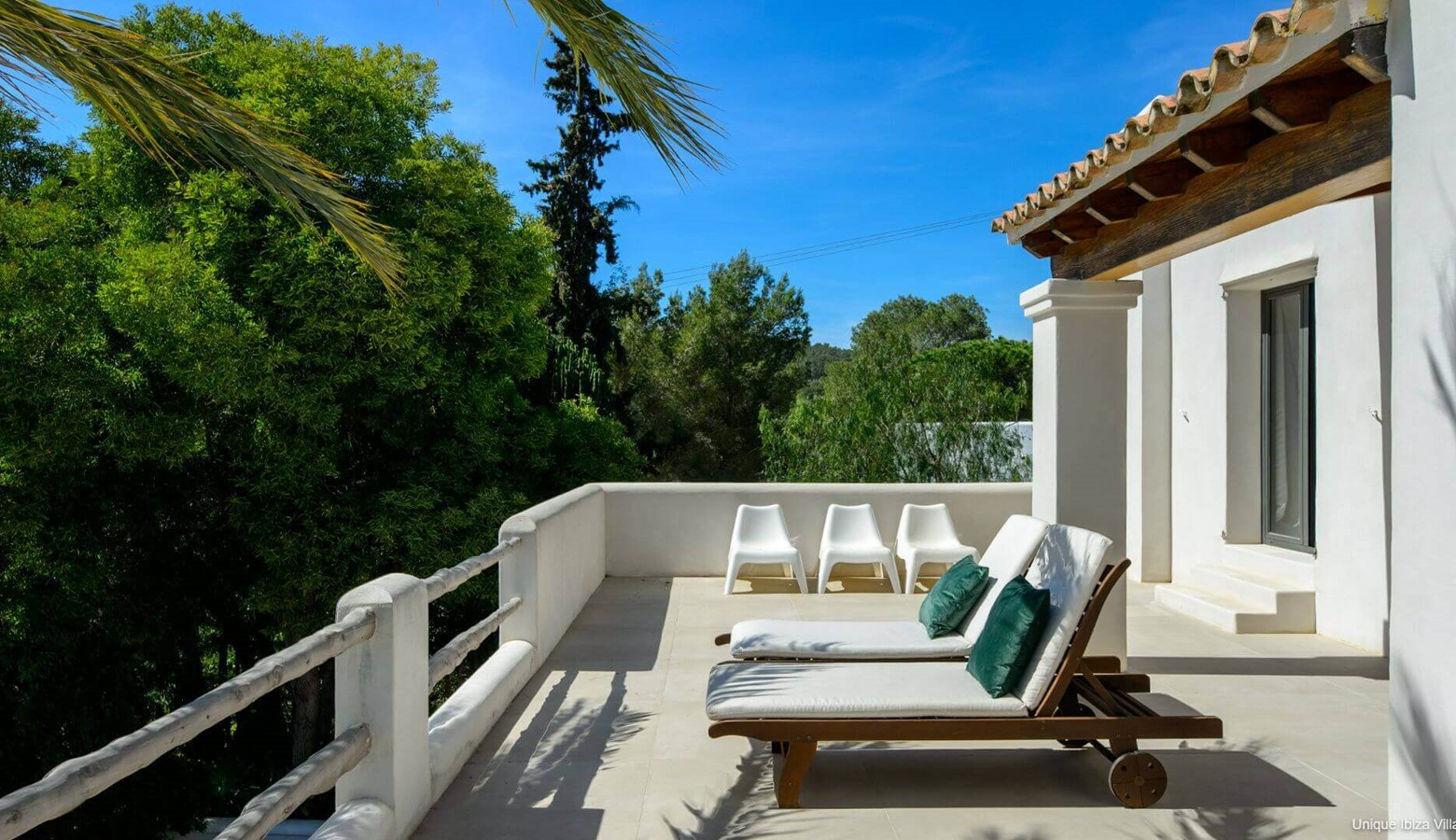 On the first floor are 2 bedrooms of similar size that share a terrace furnished with loungers with distant sea views and views to the old town of Ibiza (Dalt Vila)