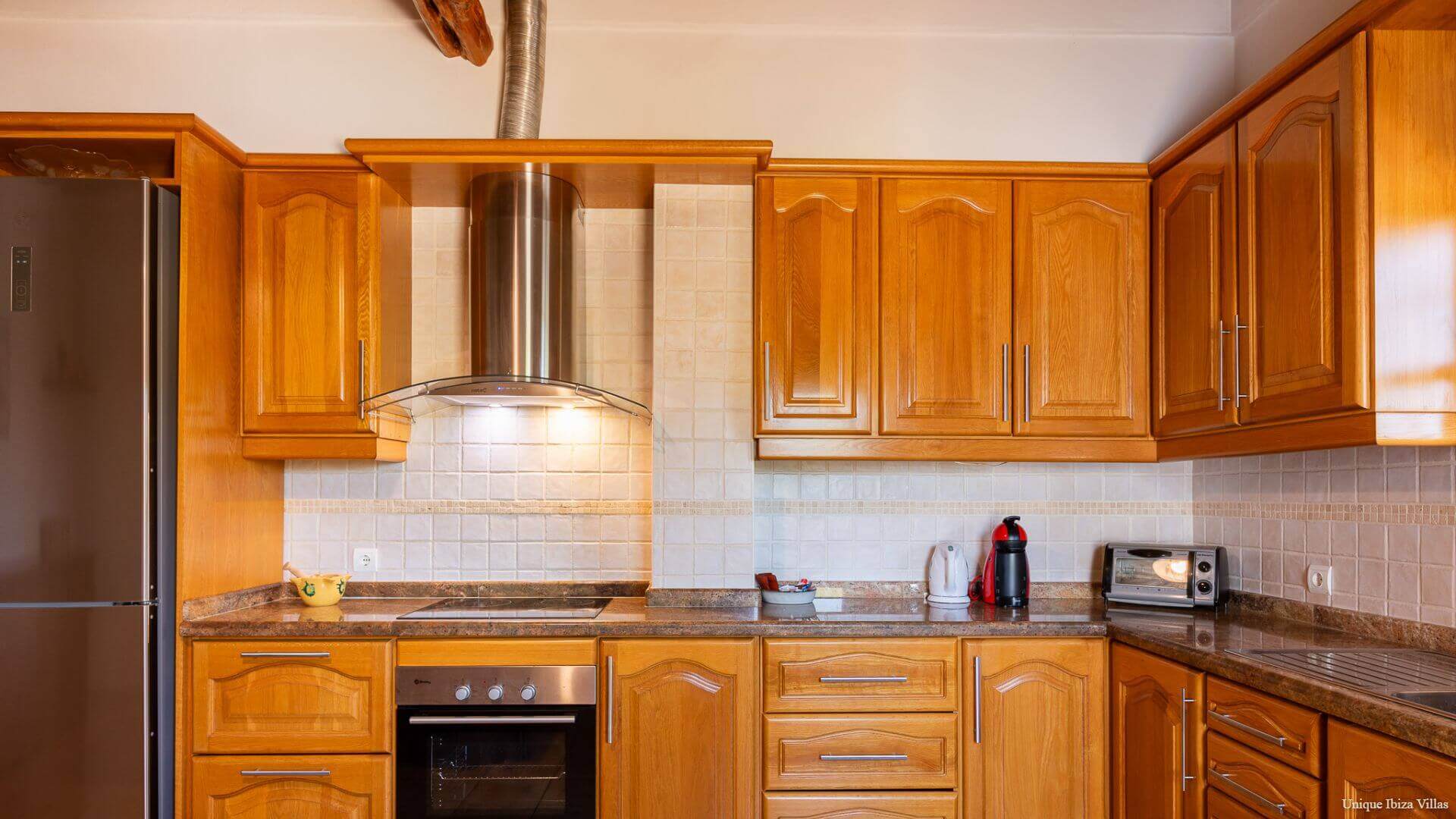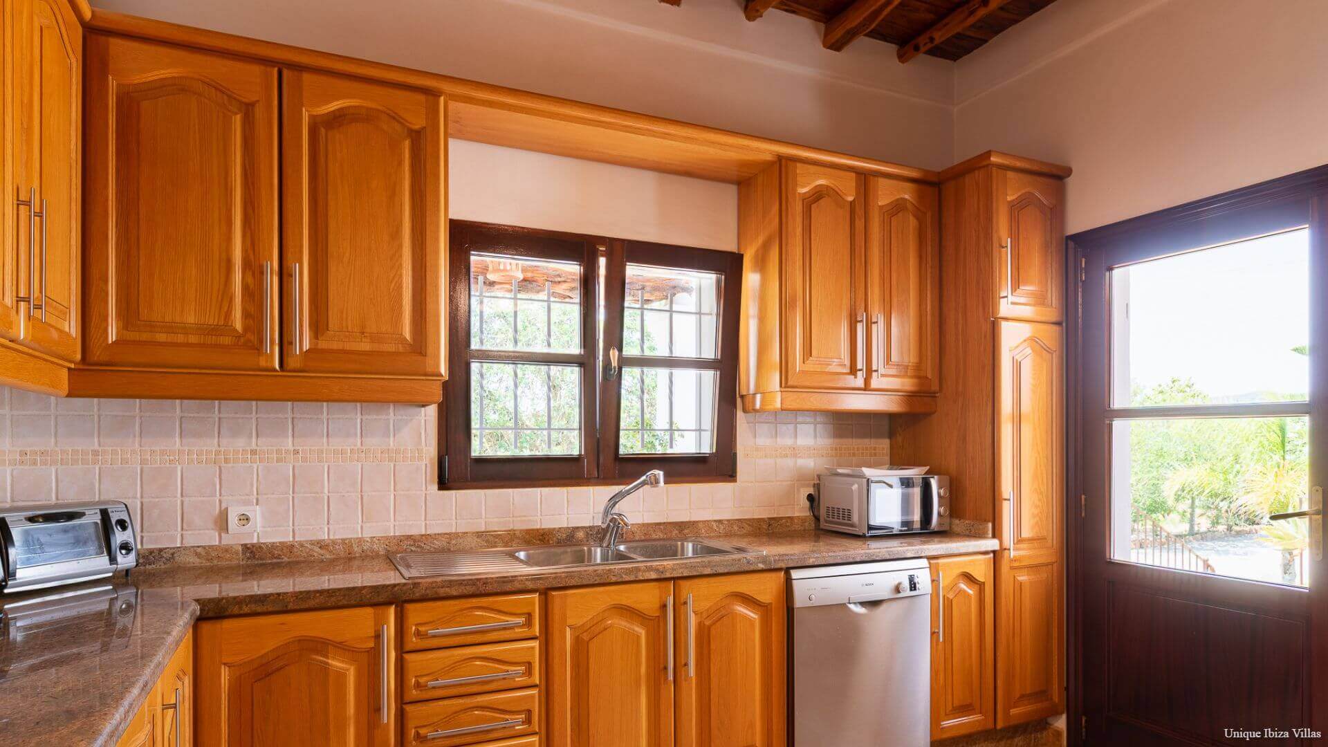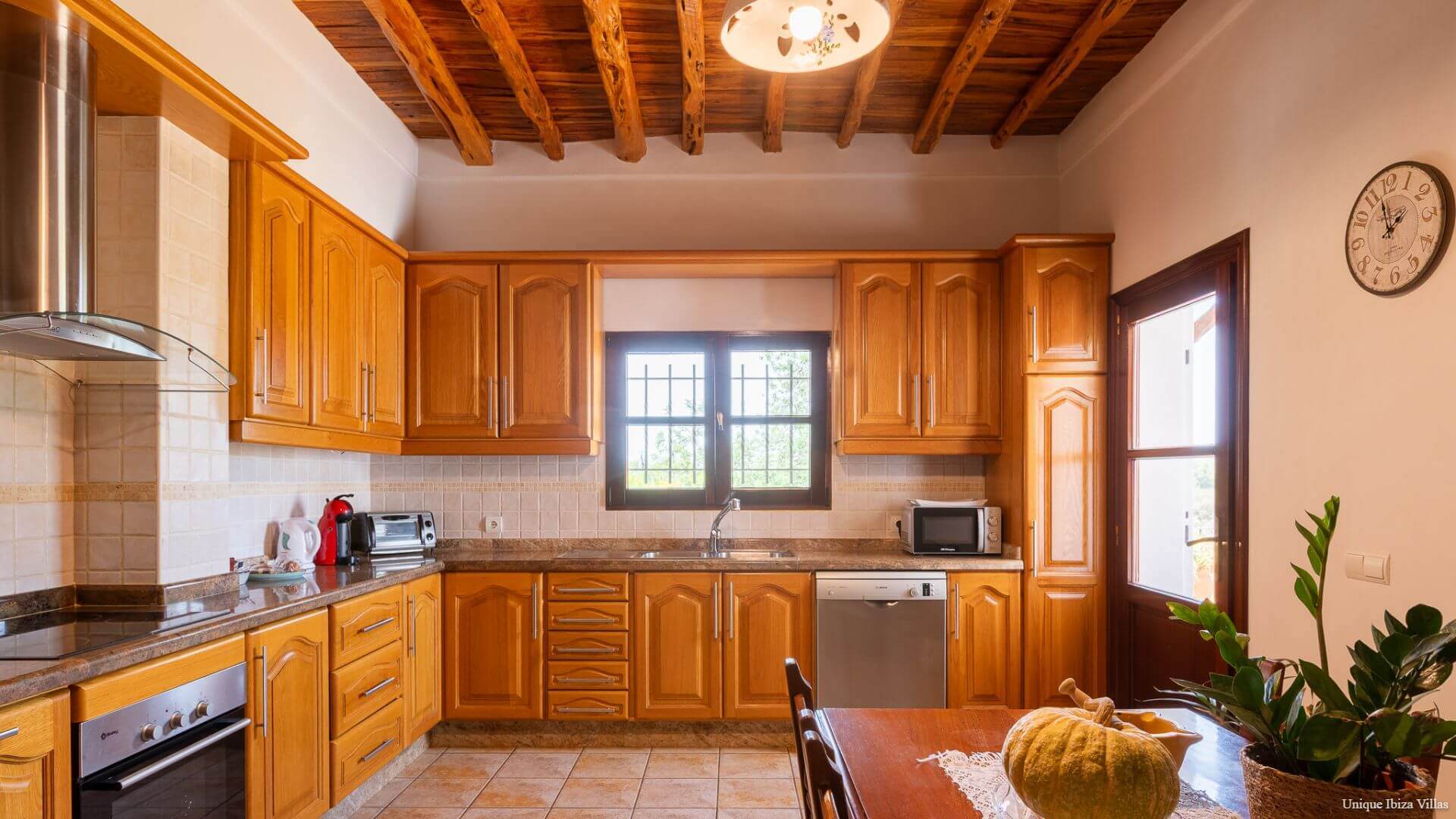 The fully equipped kitchen has a traditional Sabina wood ceiling and breakfast table