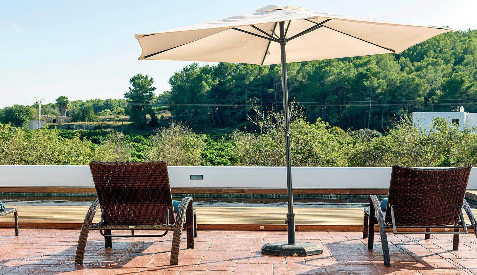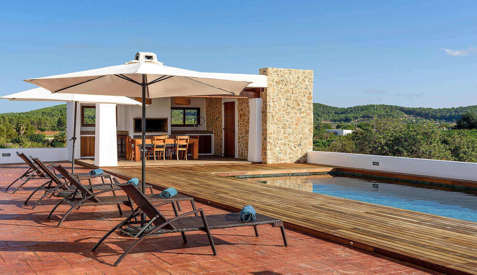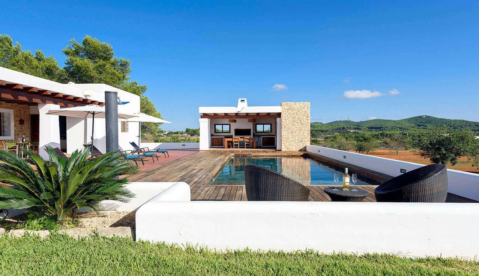 Villa Dalt S'Era is a high-end villa sleeping 5 (6 on request) in the heart of Ibiza which is ideal for families and couples. Built in 2013 this lovely villa has modern decor, a very well equipped kitchen, spacious living room and very nice bathrooms! The location is ideal; rural with a large 15,000 square metre plot and views across the lush fields to the hills beyond and very close to Santa Gertrudis village which is 2.1 kilometres away (reached partly via an unmade and slightly bumpy road as you would expect in rural Ibiza) and where you will find a great selection of restaurants and bars in the quaint and traditional village square. There are also some very nice boutique shops to tempt you! Access to the rest of the island is really easy and most points can be reached within a 20 minute drive.