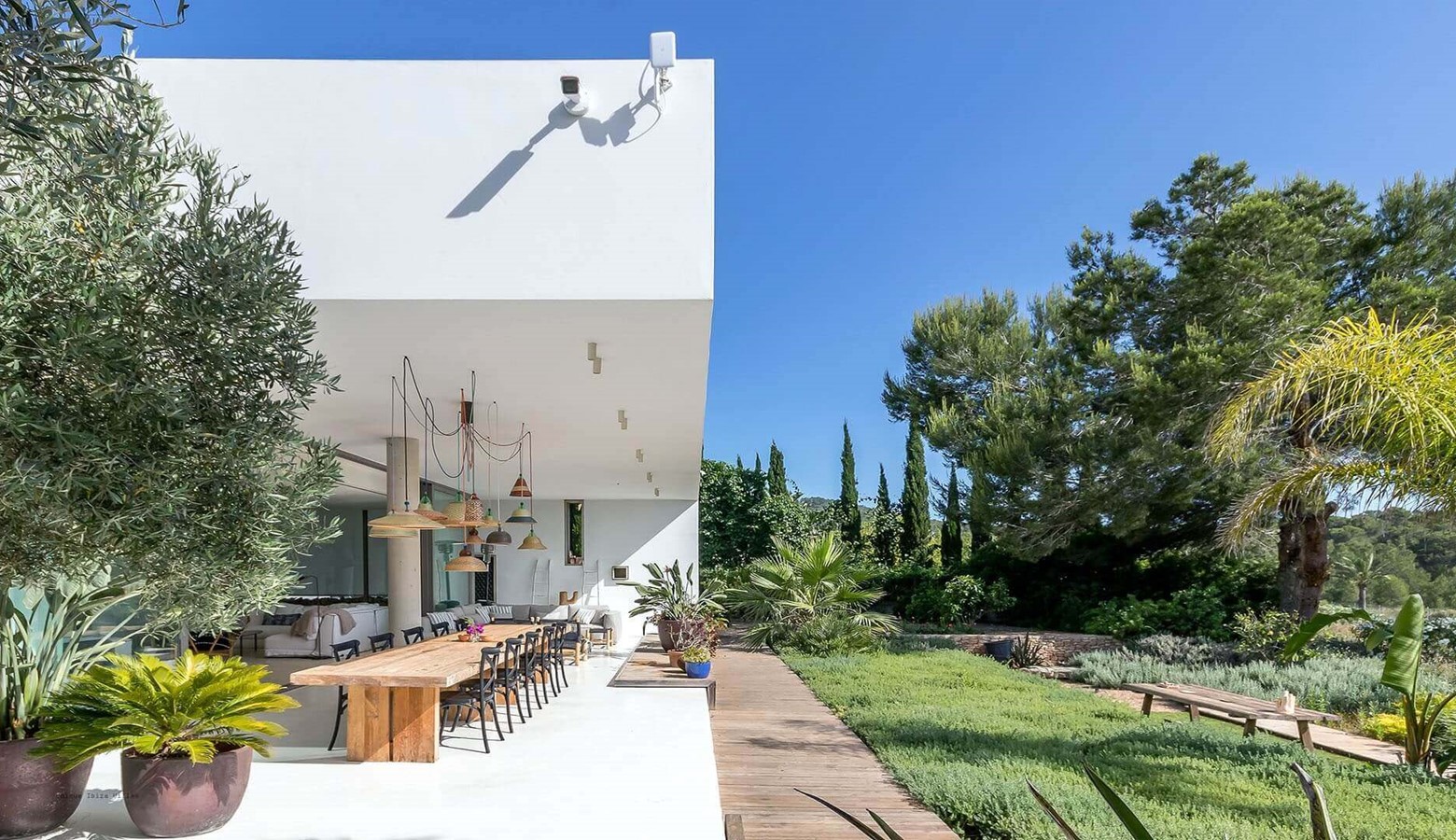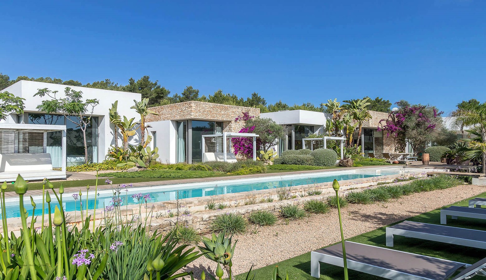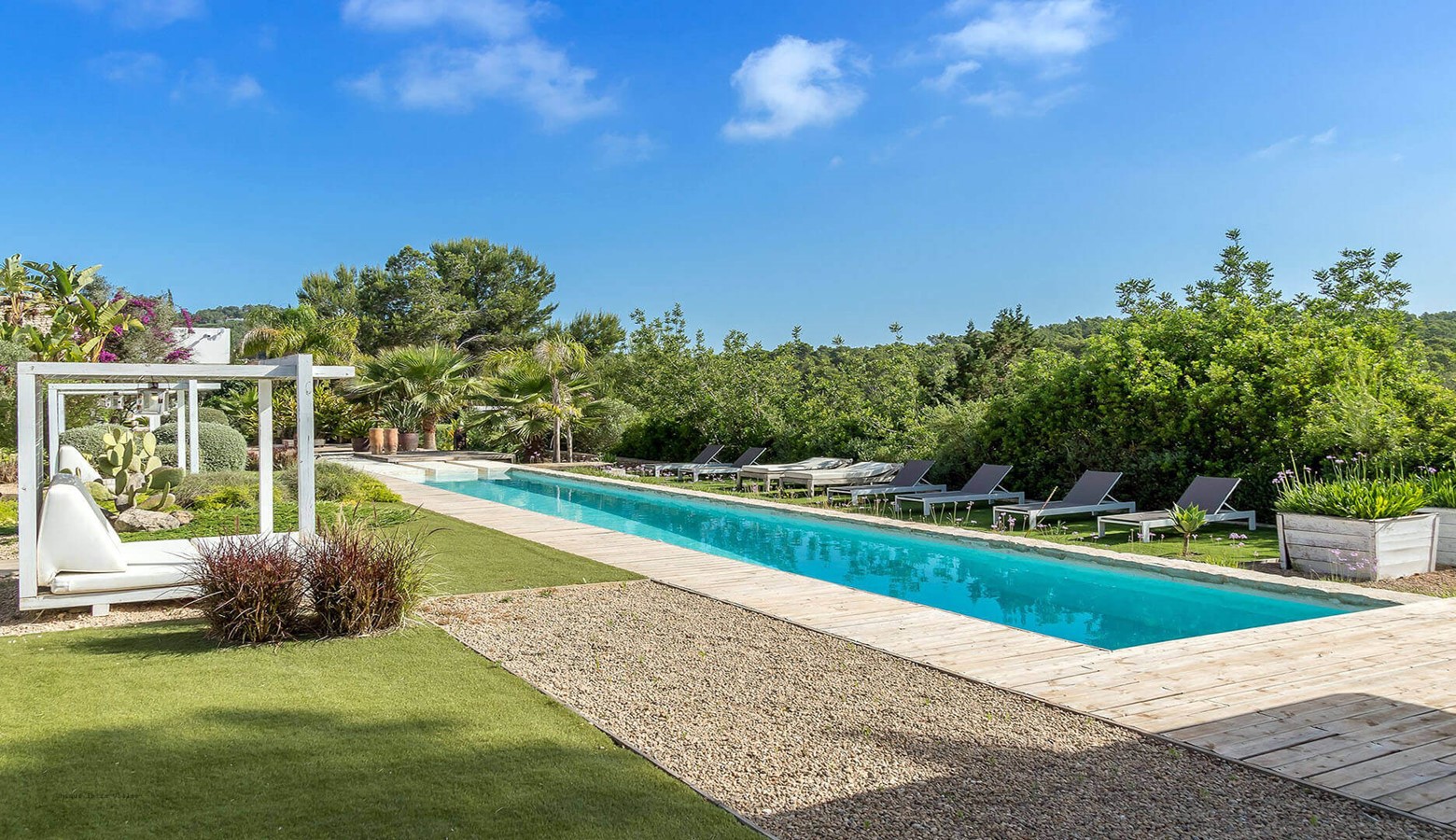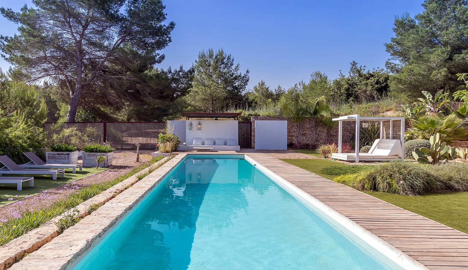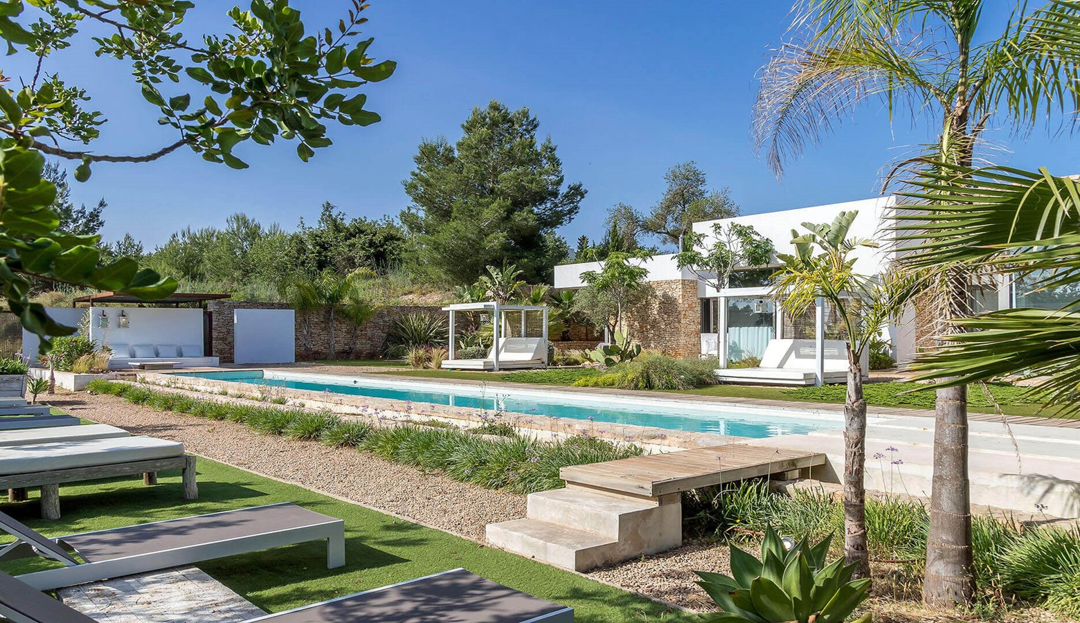 Villa Greenacres is a high-end modern villa in the countryside of Ibiza near the villages of Santa Gertrudis and San Lorenzo (Sant Llorenc de Balafia) with an indoor heated pool to complement the outdoor pool