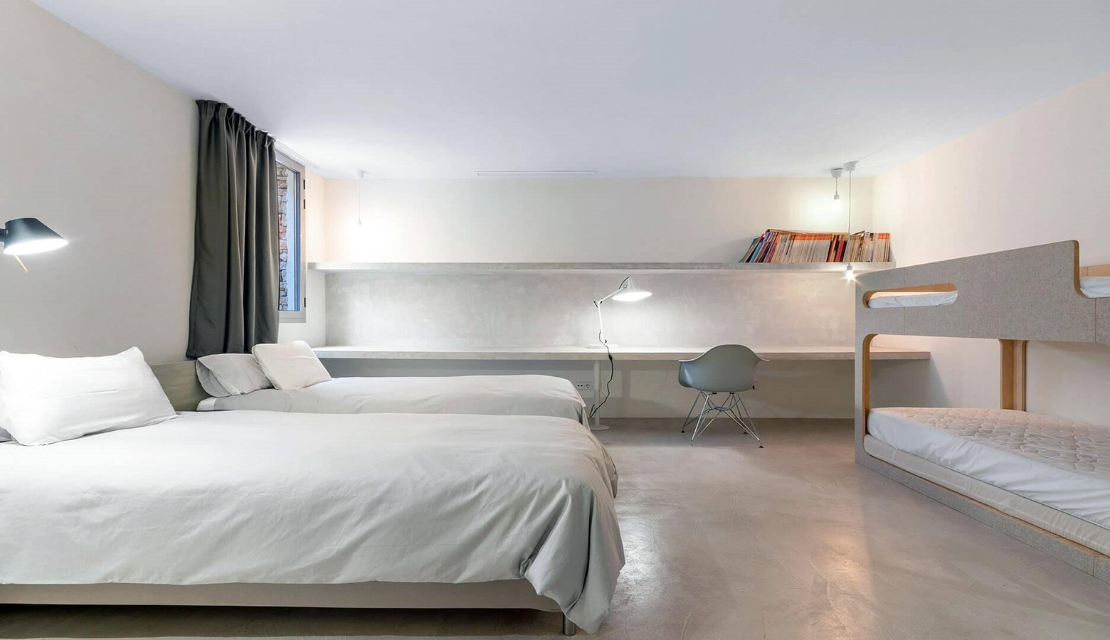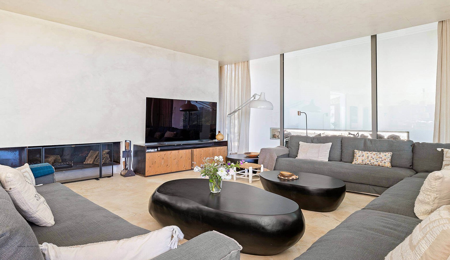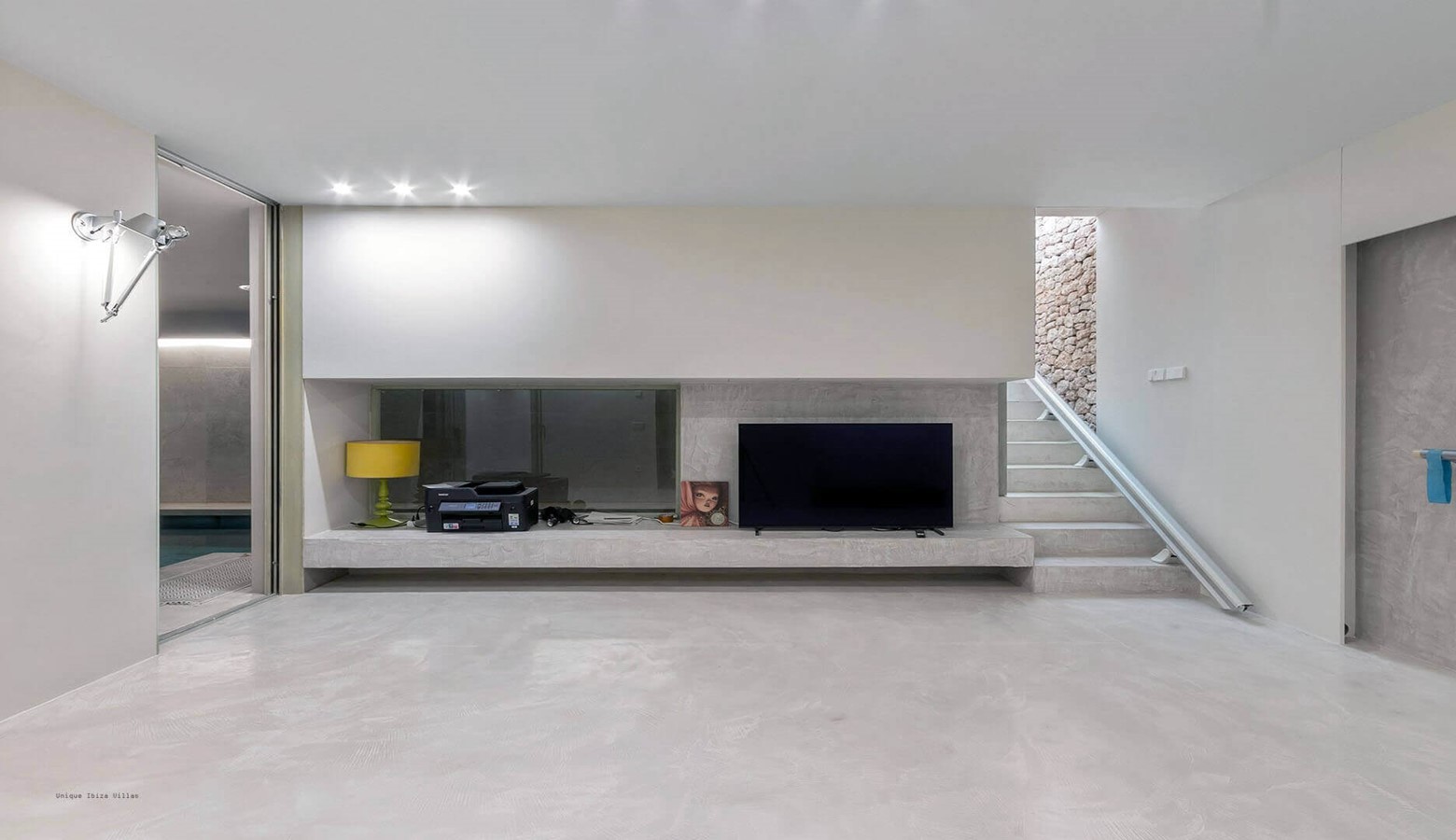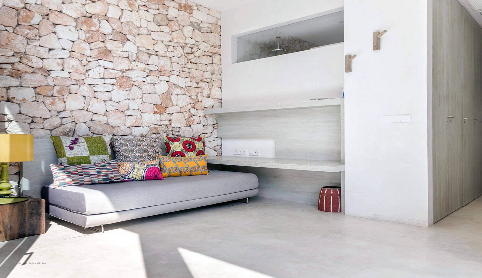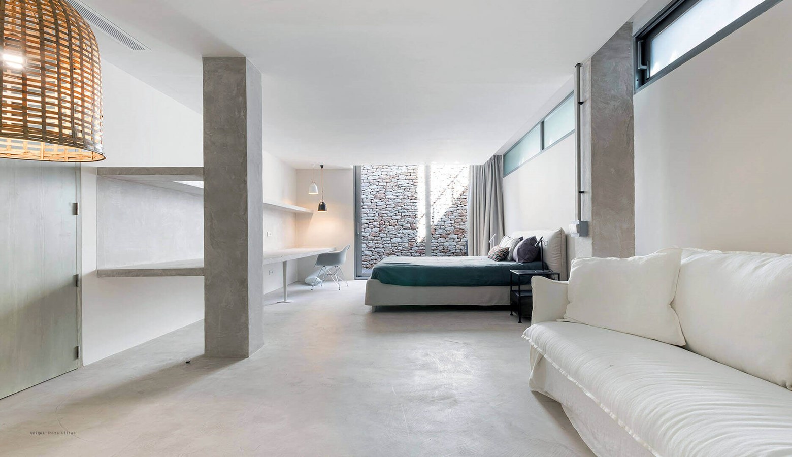 Polished concrete floors and walls fused with a nod to the elegant traditional fincas with stone feature walls