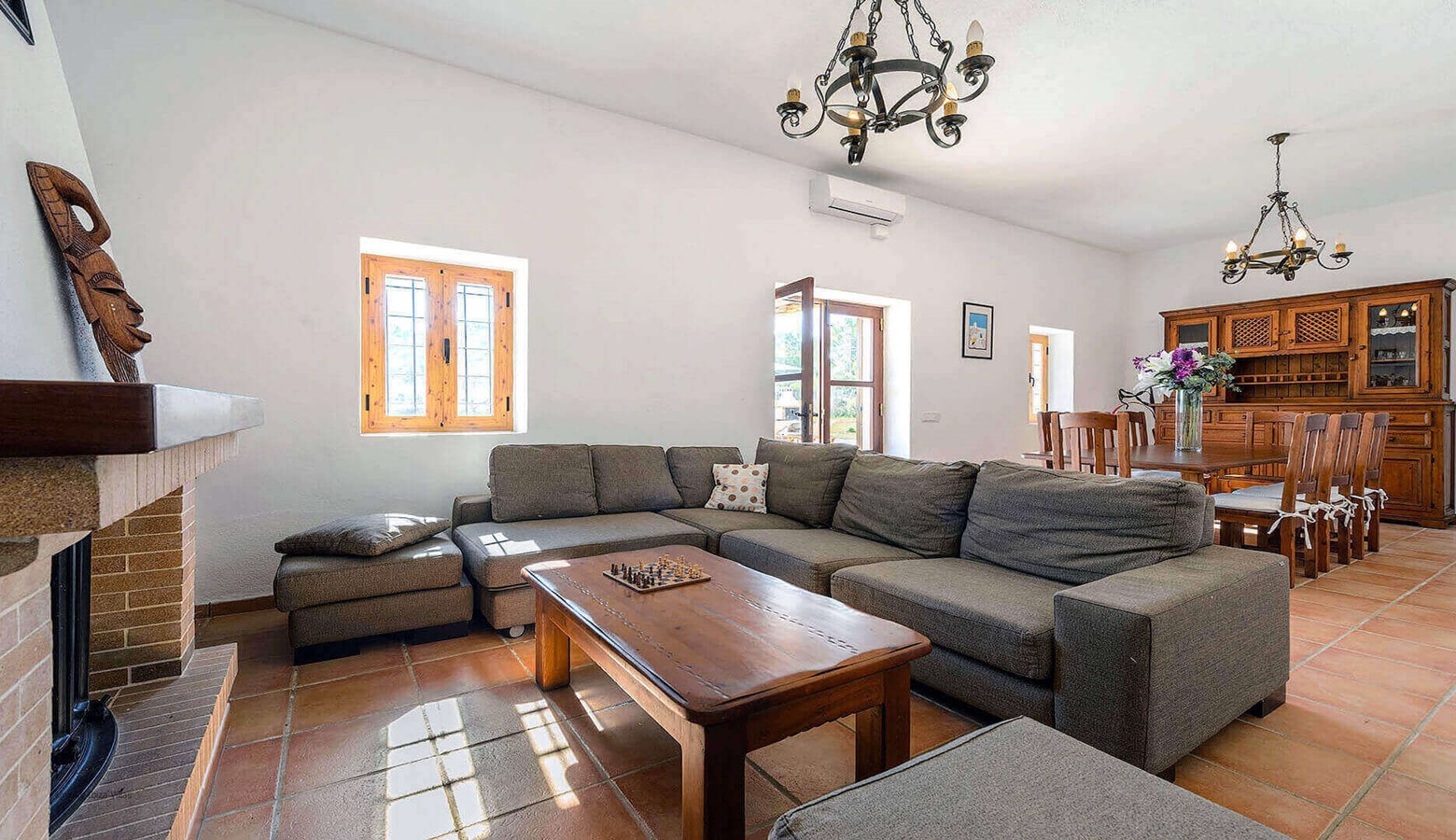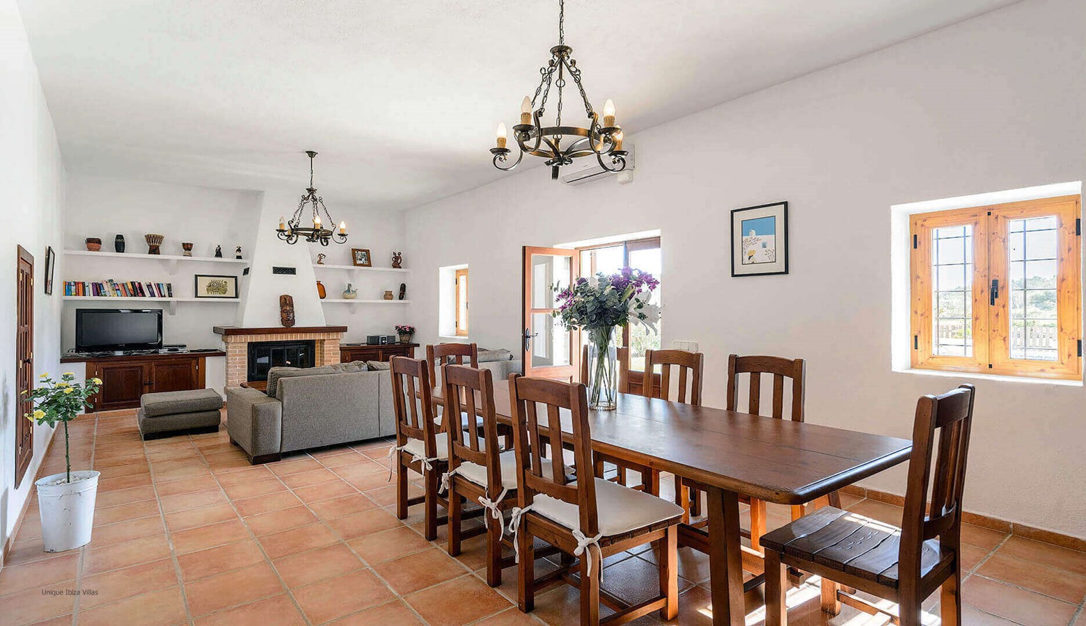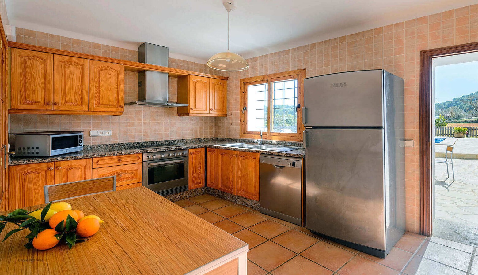 The fully equipped kitchen has a large fridge freezer and a door that leads to the terrace at the front of the villa. Living and dining room with air conditioning, TV, DVD and large wooden doors that also leads to the terrace at the front of the villa