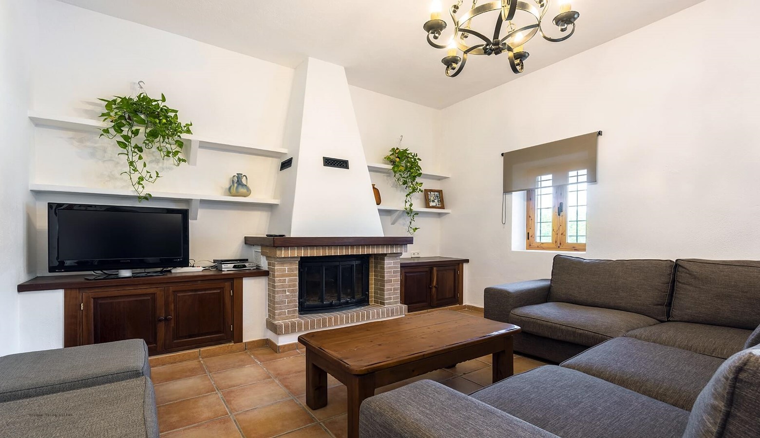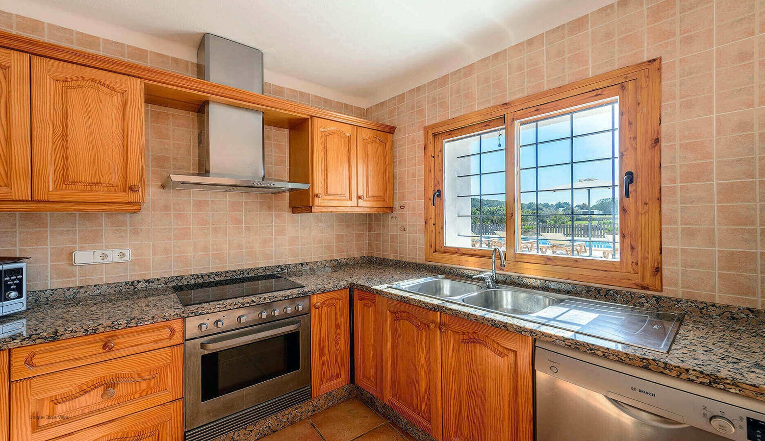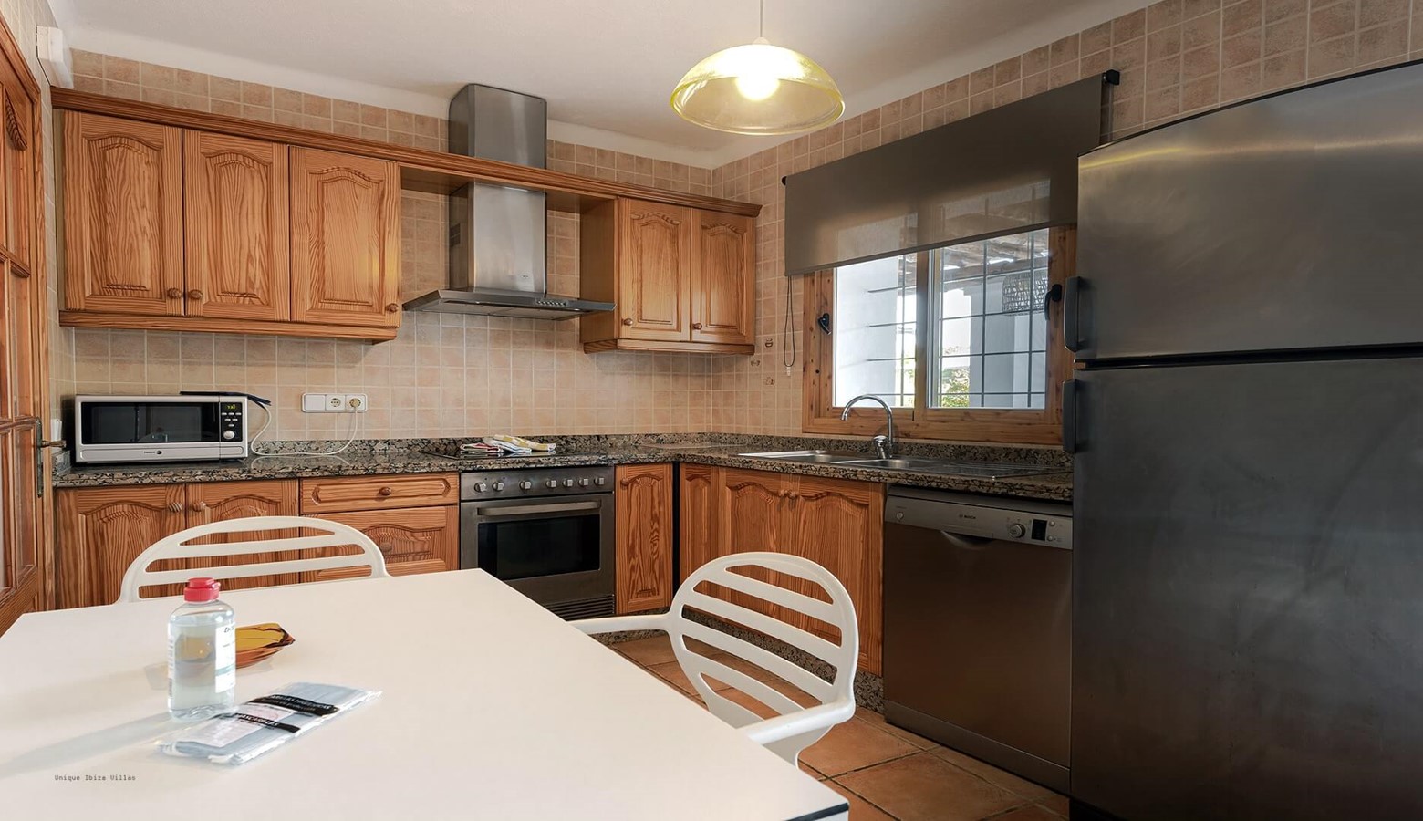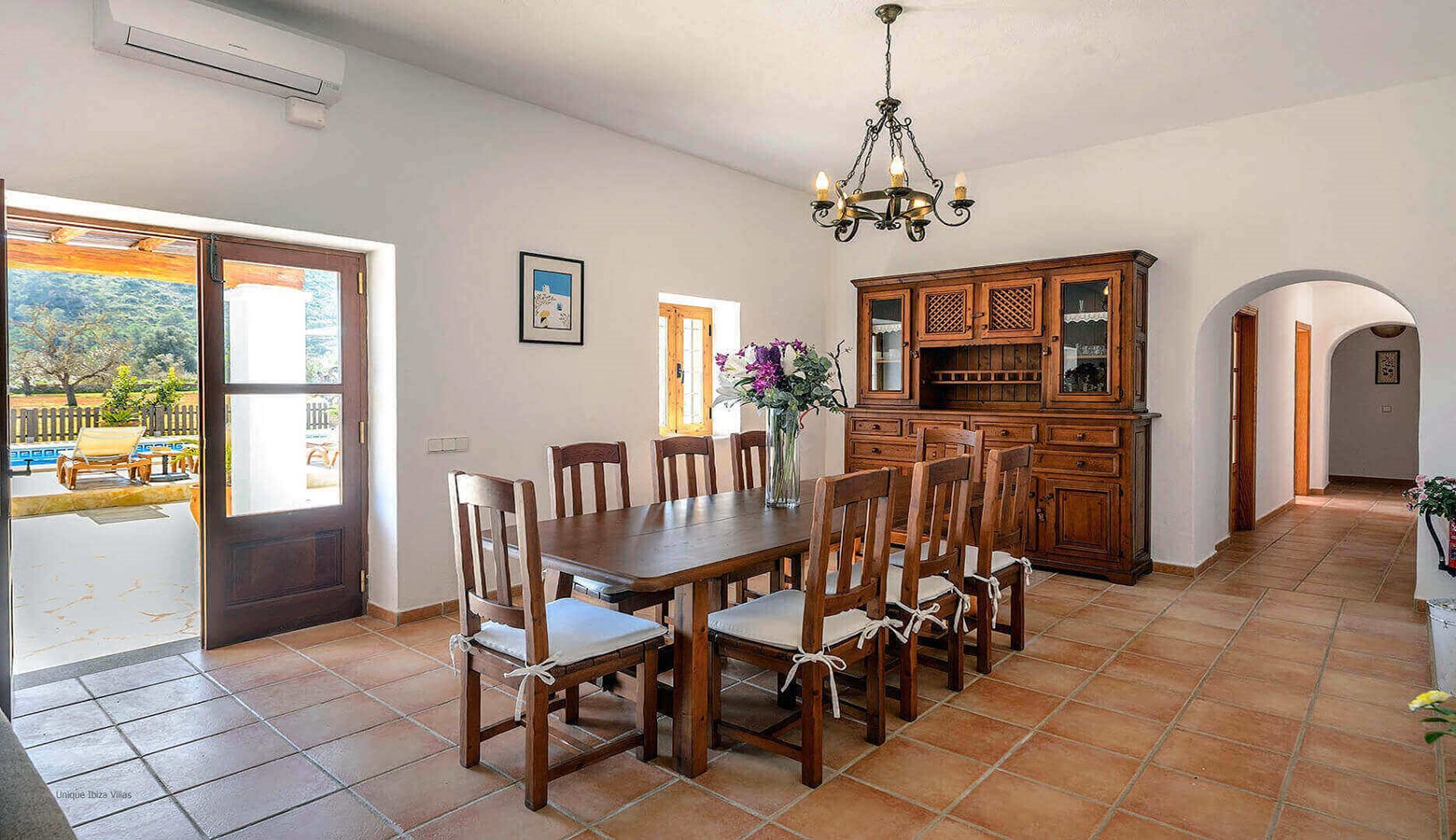 The fully equipped kitchen has a large fridge freezer and a door that leads to the terrace at the front of the villa. Living and dining room with air conditioning, TV, DVD and large wooden doors that also leads to the terrace at the front of the villa
