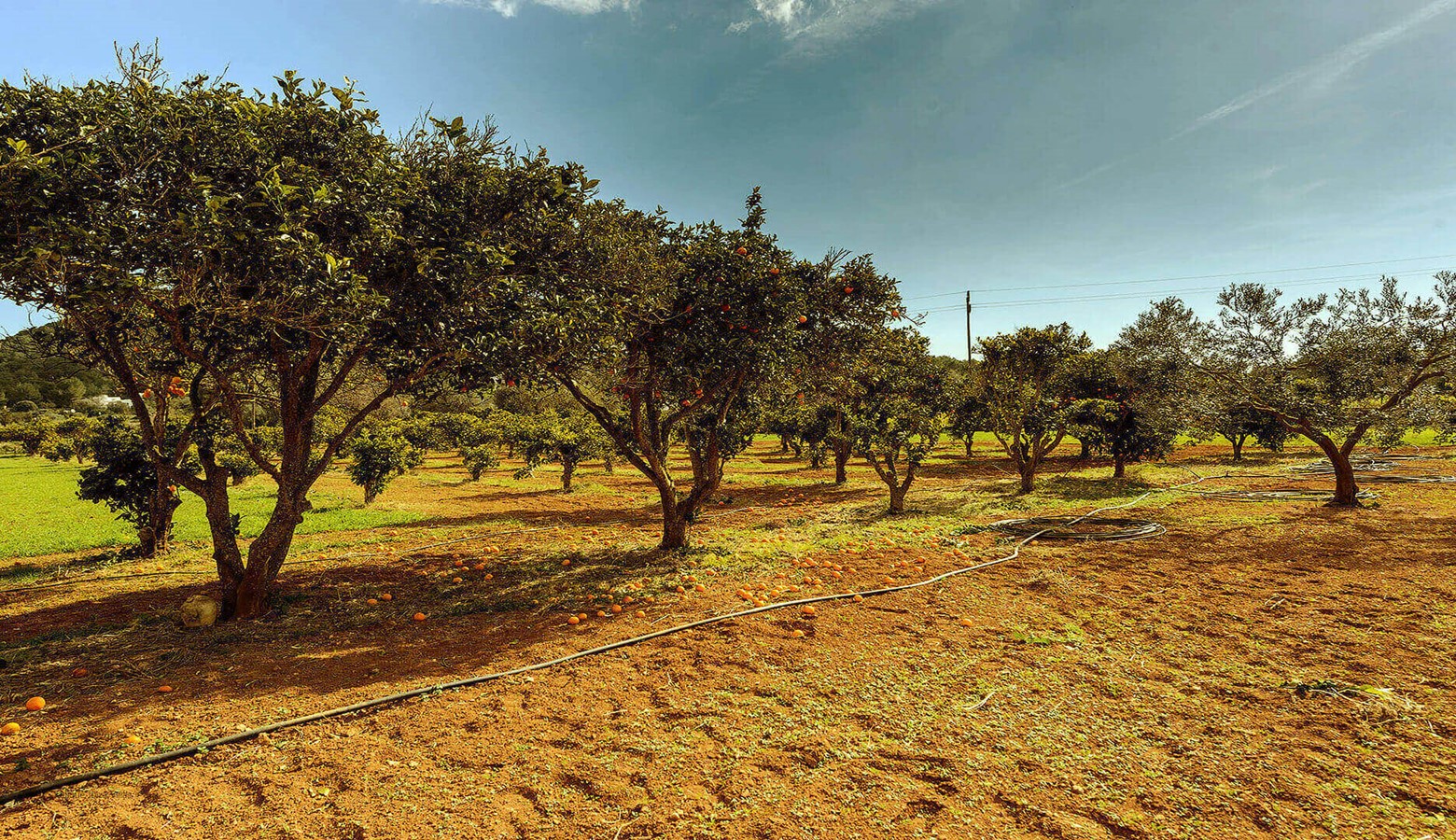 The villa is set in a semi-rural area with gardens or orange trees