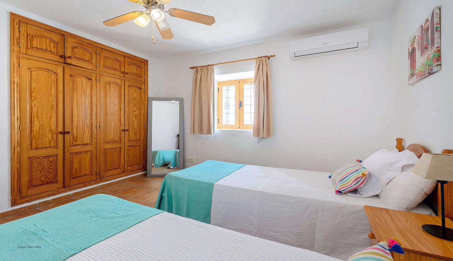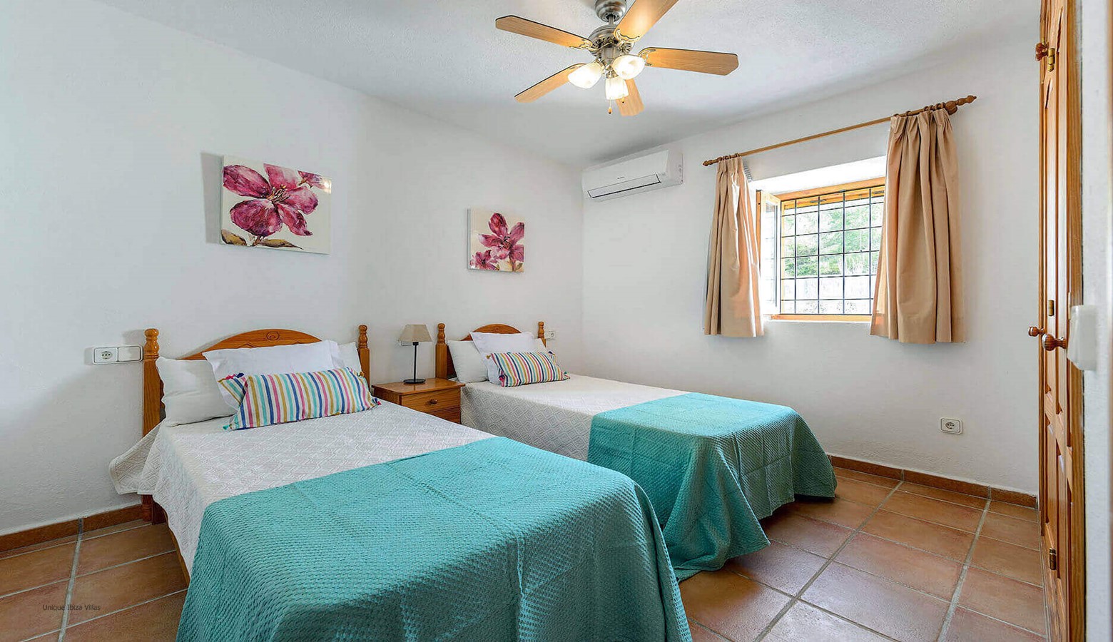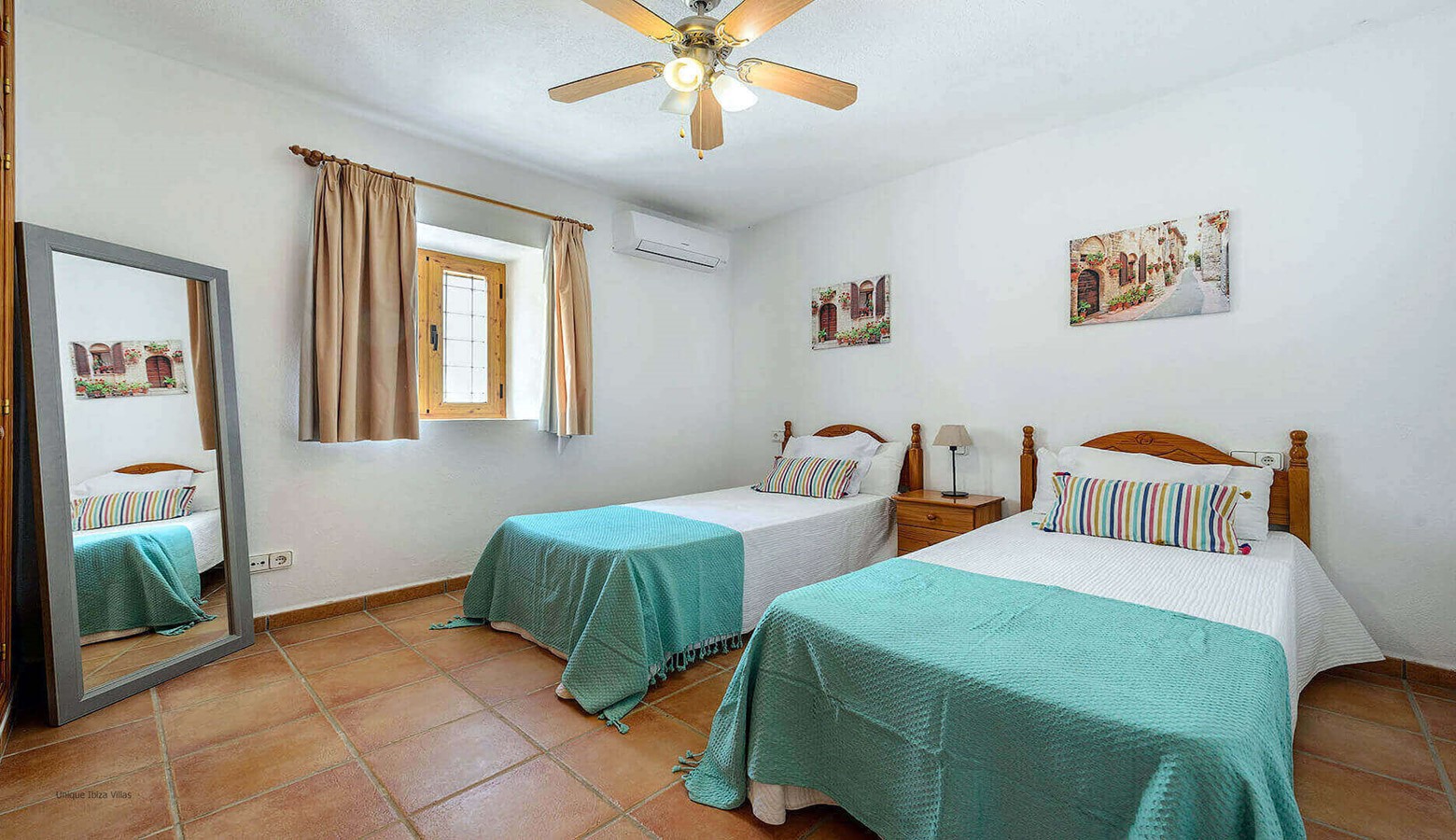 The villa has 3 bedrooms split over 2 floors, and all bedrooms have air conditioning