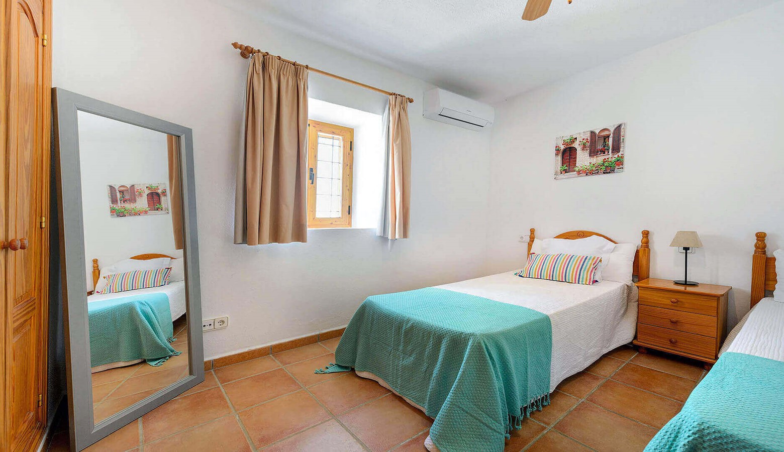 On the ground floor are 2 bedrooms both with twin beds and air conditioning