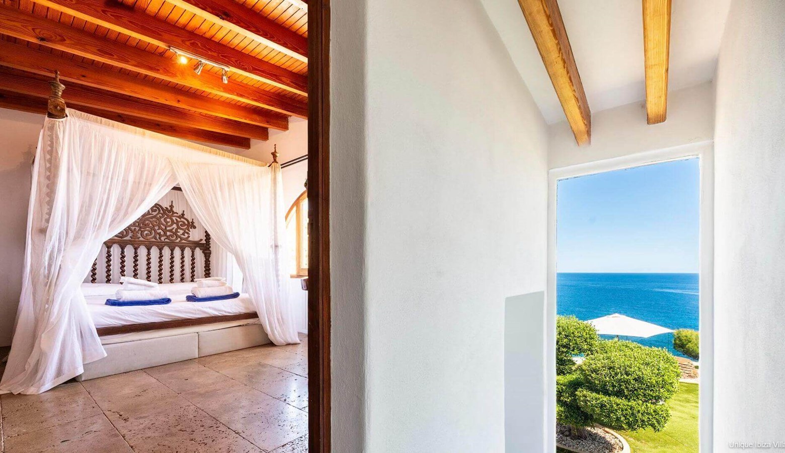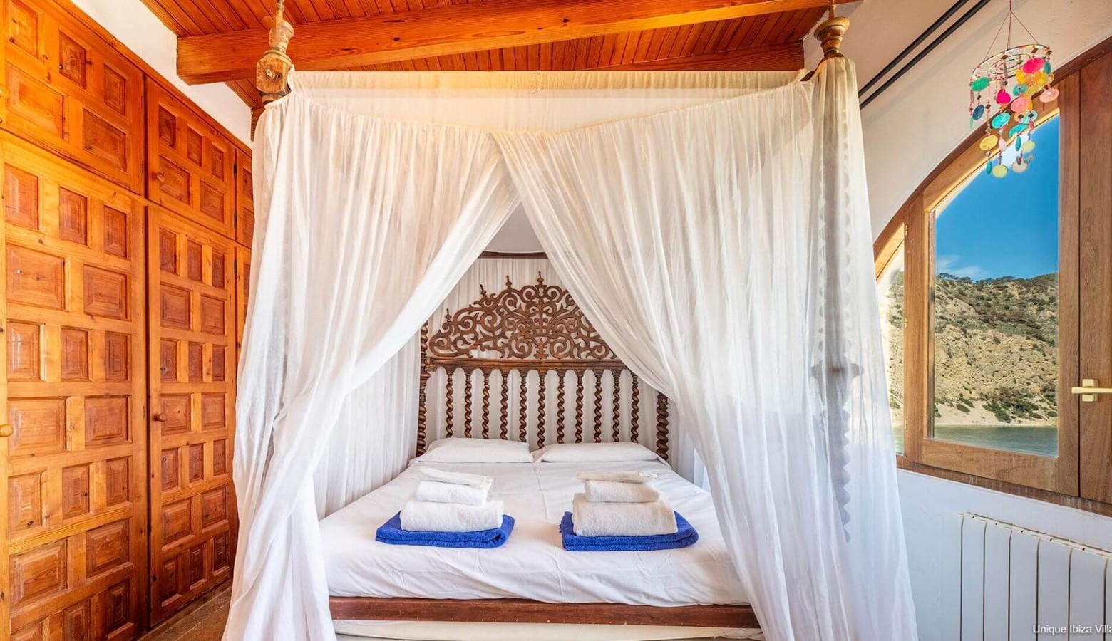 Bedroom with 4 poster double bed, air conditioning, partial sea view and bathroom shared with the neighboring bedroom