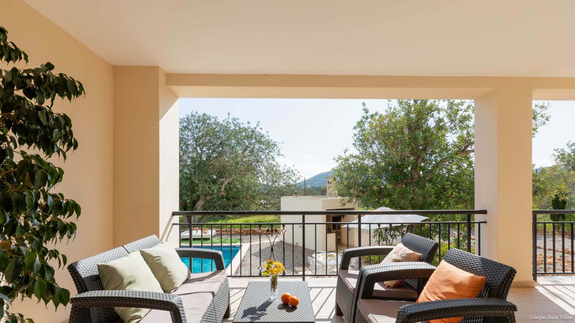 Shaded terrace with dining table and chairs for 6 and a seating area with a sofa