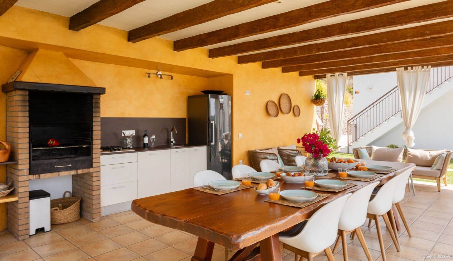The outside dining area has traditional Sabina wood ceilings and a table for 10