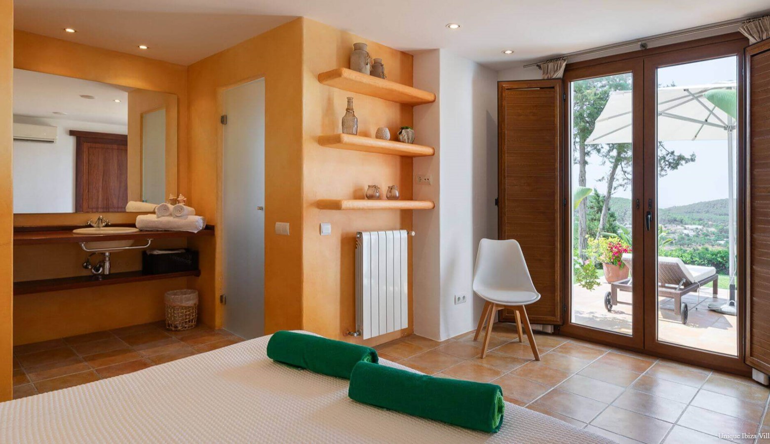 A bedroom with a double bed, air conditioning, en suite bathroom and a terrace with loungers