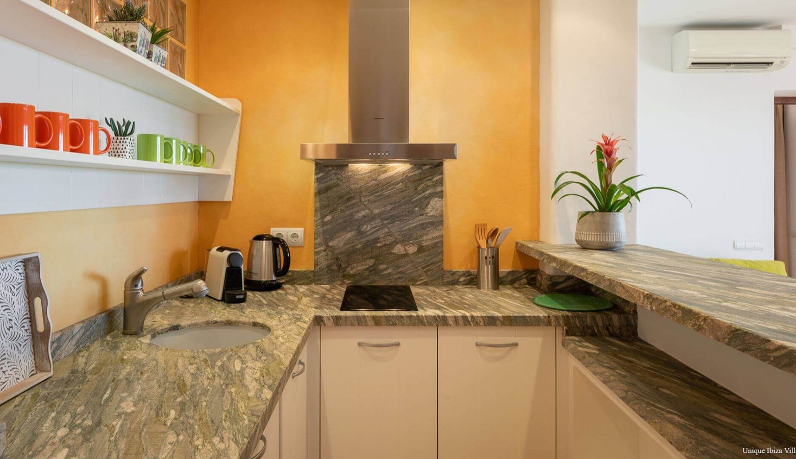 The main living area has air conditioning and leads to the fully equipped modern kitchen which includes a wine fridge. From the kitchen you access to: