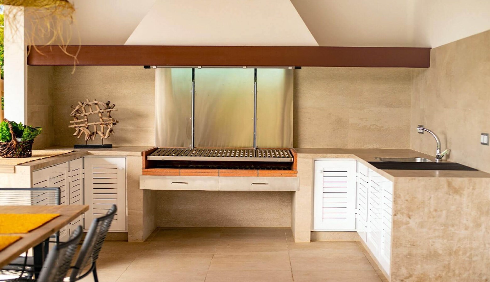 Shaded dining area with brick built charcoal BBQ