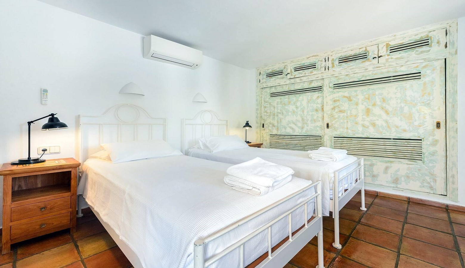 Bedroom with twin beds and air conditioning. A bathroom is located