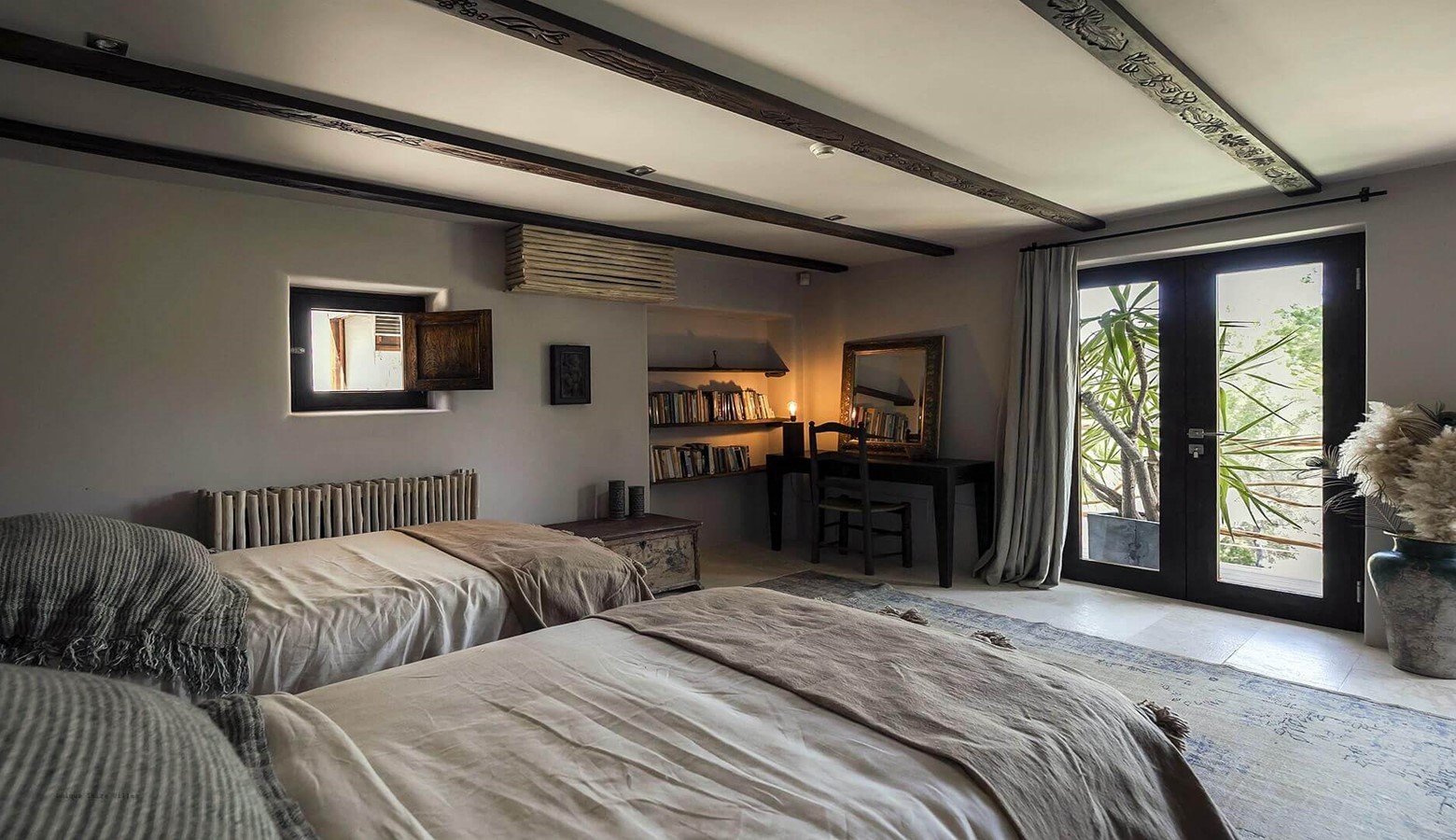 Bedroom in the main house with bed that can be set up as either a double or twin beds, air conditioning, en suite bathroom and private terrace