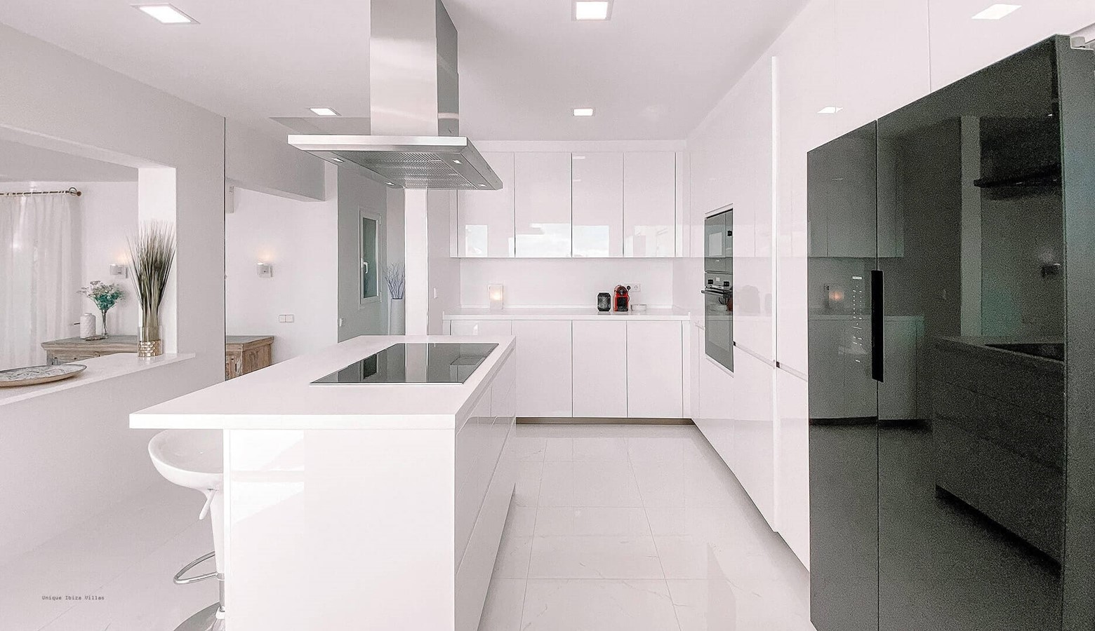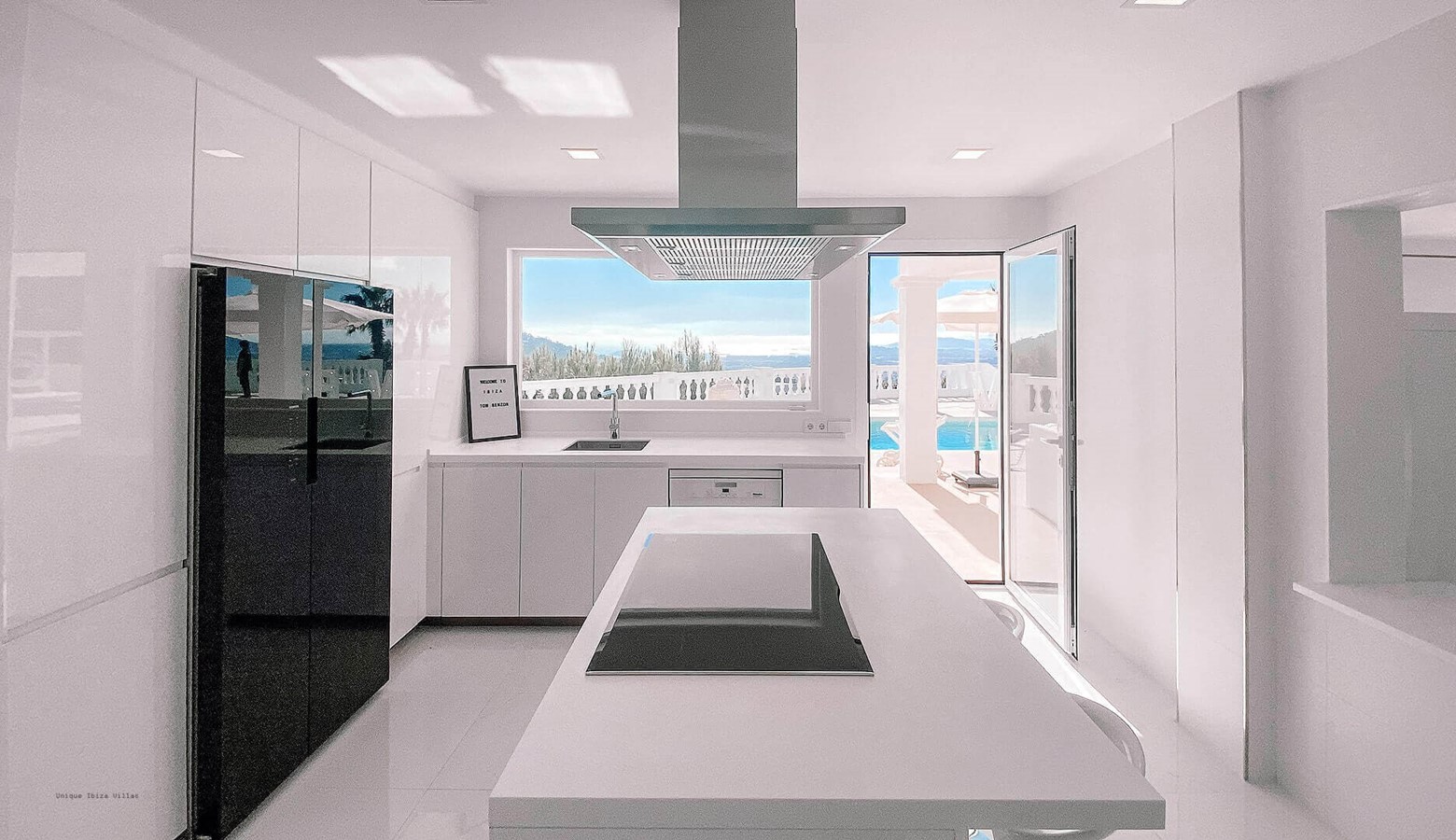 There is a fully equipped modern white kitchen with large fridge freezer; a living room on the upper level with balcony; and the living and dining room on the lower floor with floor to ceiling windows and doors lead to the terrace and pool with panoramic views to the hills and down to Ibiza Town.