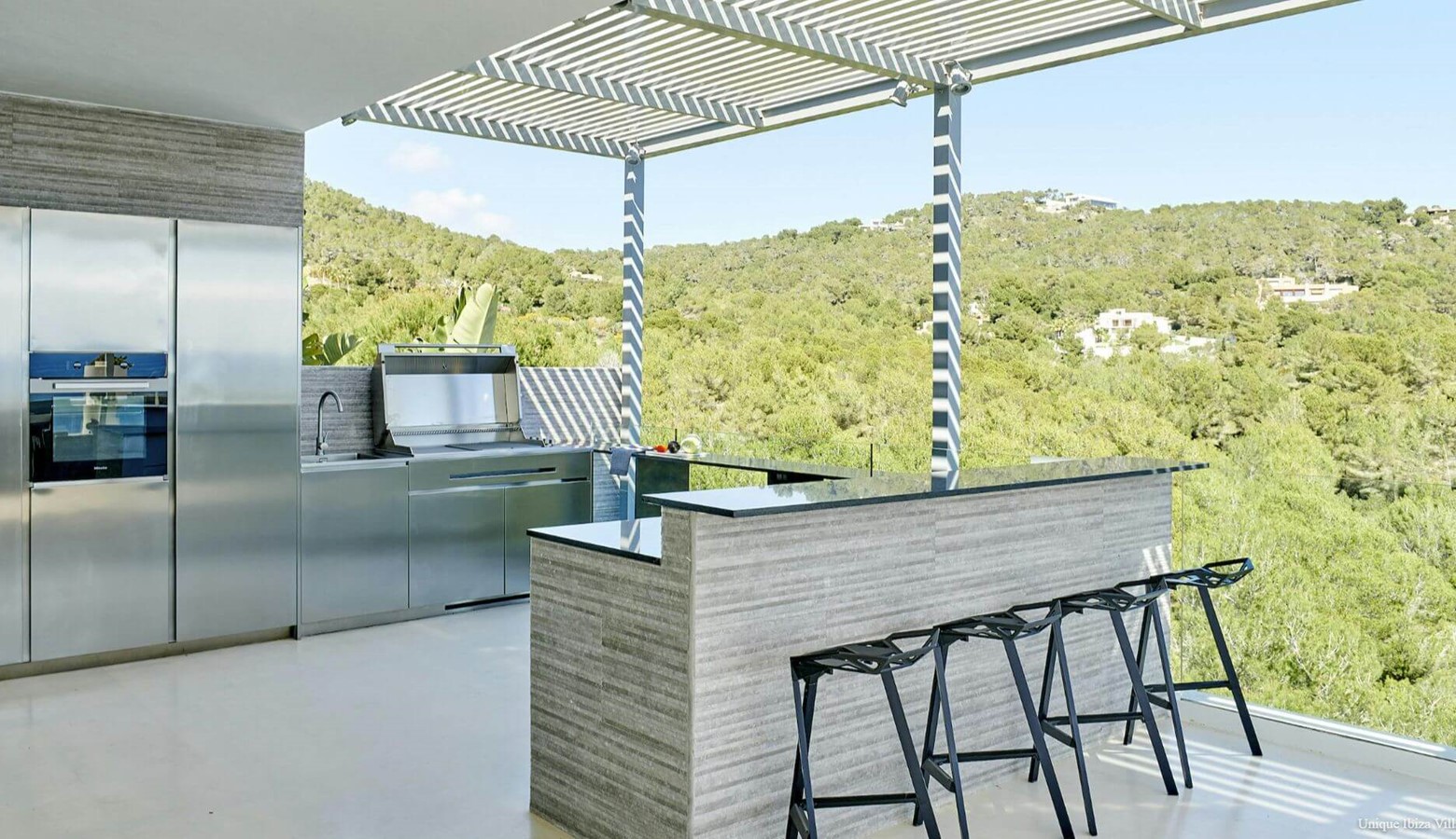 Outdoor kitchen with BBQ and shaded dining are for 12 with sea views