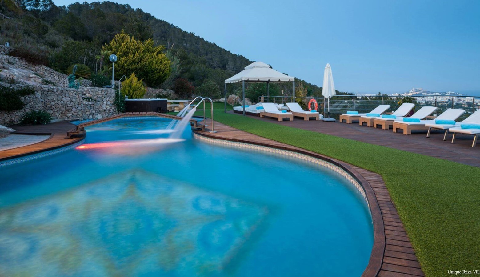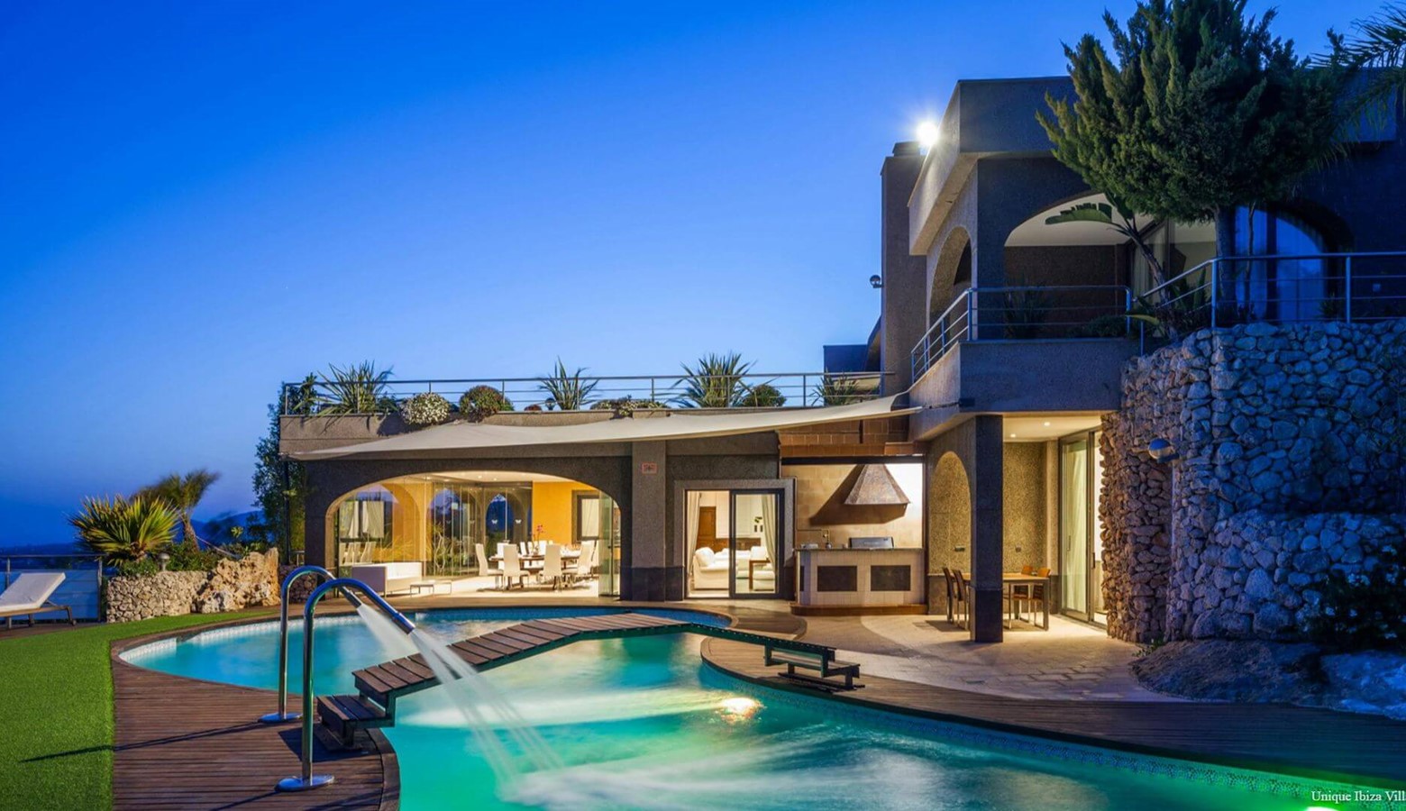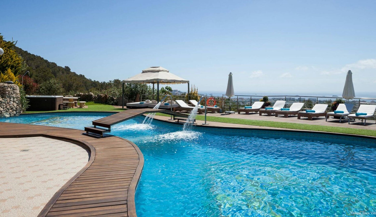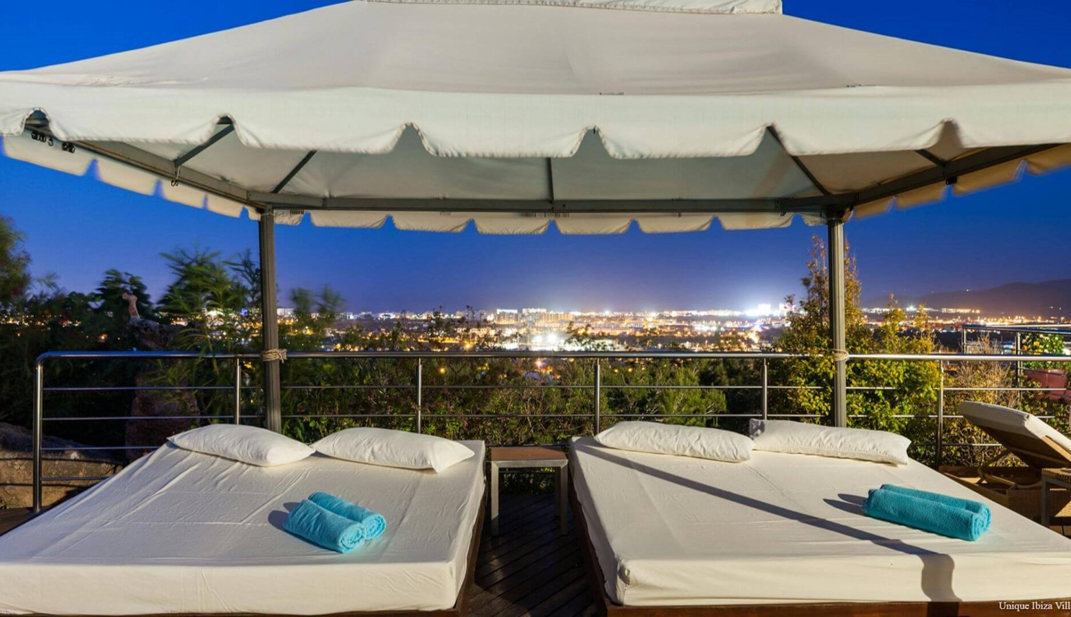 Villa Fuente de Ibiza is situated on the hillside near Ibiza Town and Playa den Bossa with wonderful panoramic sea views. This private high-end uniquely styled villa sleeps 12 and is located close to the Sa Carroca area which is located between Ibiza Town & Playa den Bossa. From the pool area and most of the bedrooms you can enjoy panoramic sea views, down to Playa den Bossa and across to the historic Dalt Vila (old Ibiza Town).