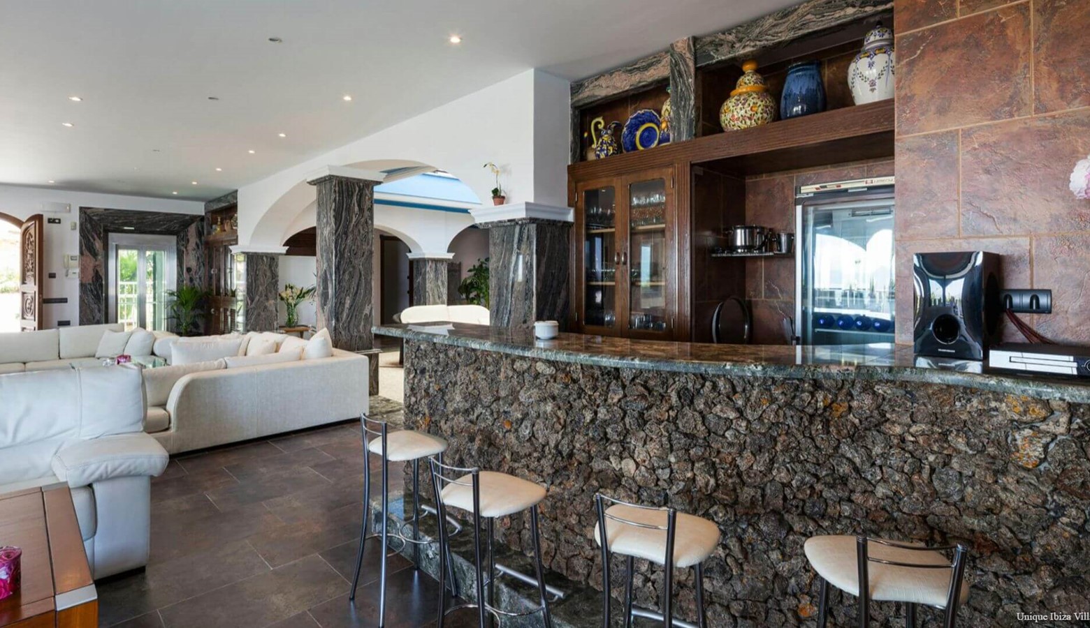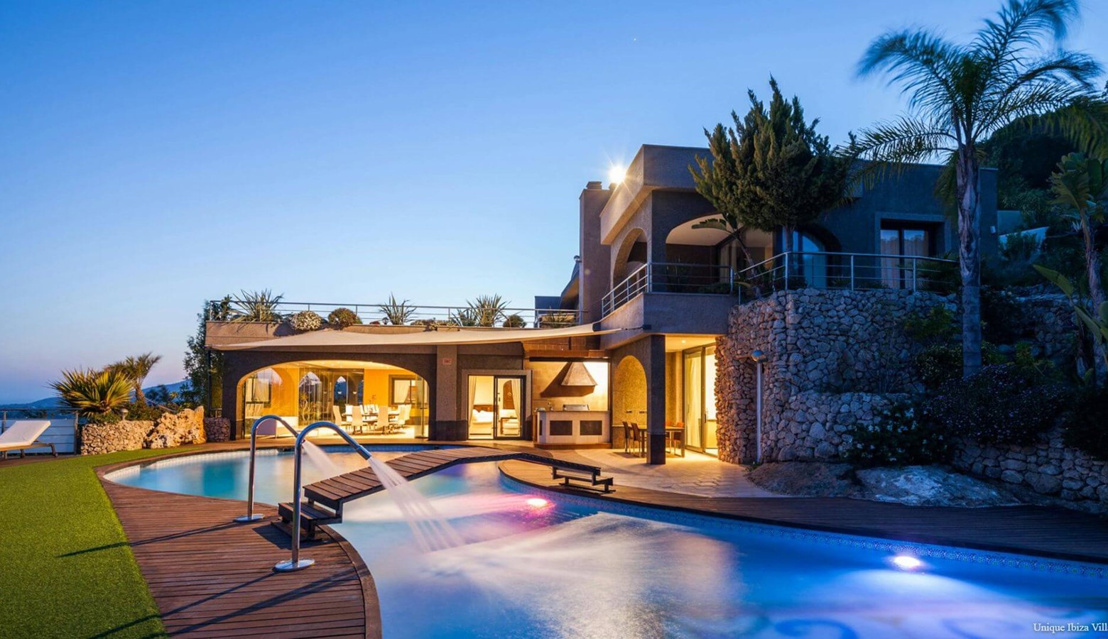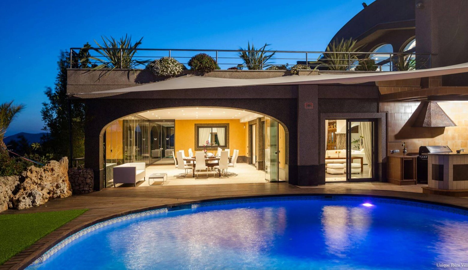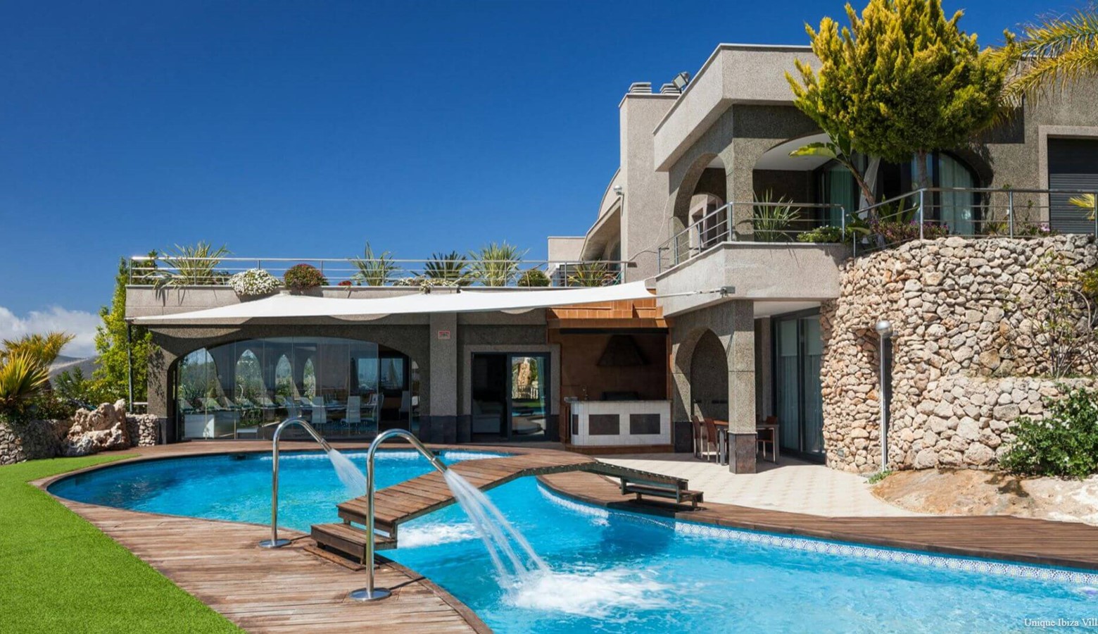 Villa Fuente de Ibiza is situated on the hillside near Ibiza Town and Playa den Bossa with wonderful panoramic sea views. This private high-end uniquely styled villa sleeps 12 and is located close to the Sa Carroca area which is located between Ibiza Town & Playa den Bossa. From the pool area and most of the bedrooms you can enjoy panoramic sea views, down to Playa den Bossa and across to the historic Dalt Vila (old Ibiza Town).