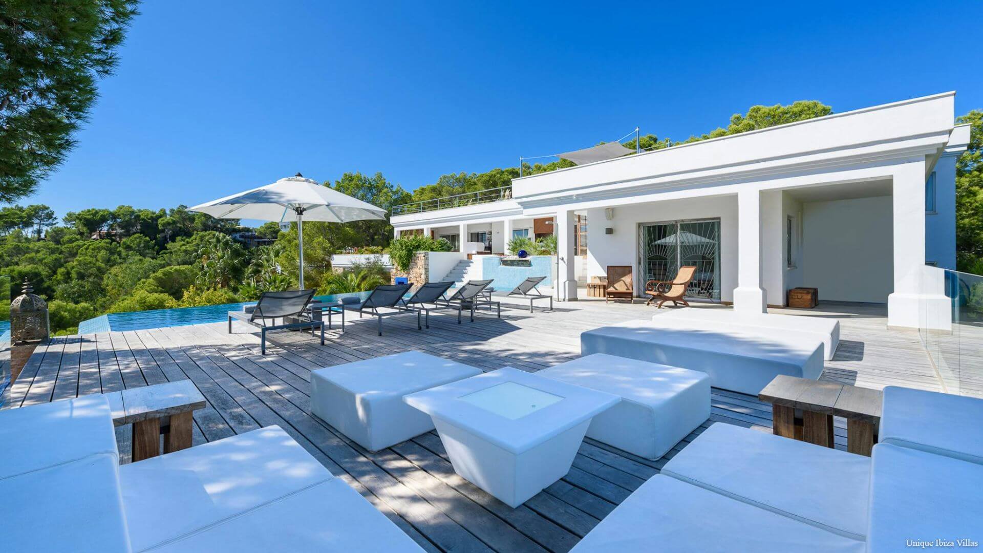 Casa Blanca Jondal is a modern 4 bedroom villa located overlooking the Bay of Cala Jondal; famous for being home to some of the most popular beach clubs and restaurants in Ibiza including Tropicana and Blue Marlin