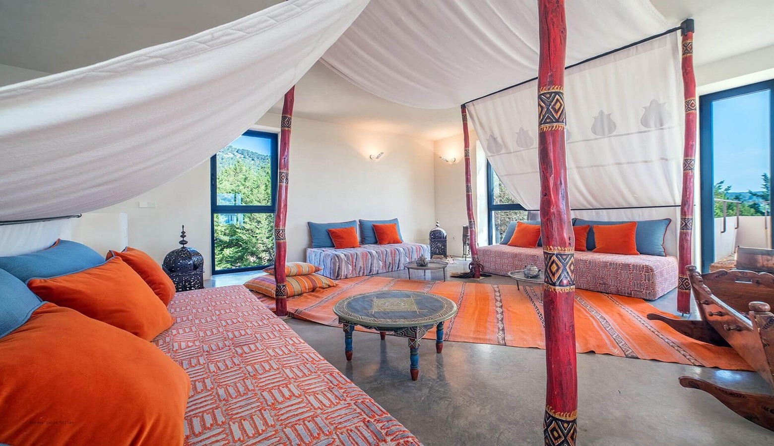 Double height living area with open plan kitchen & dining area. Floor to ceiling windows with mezzanine level and Moroccan style chill out area
