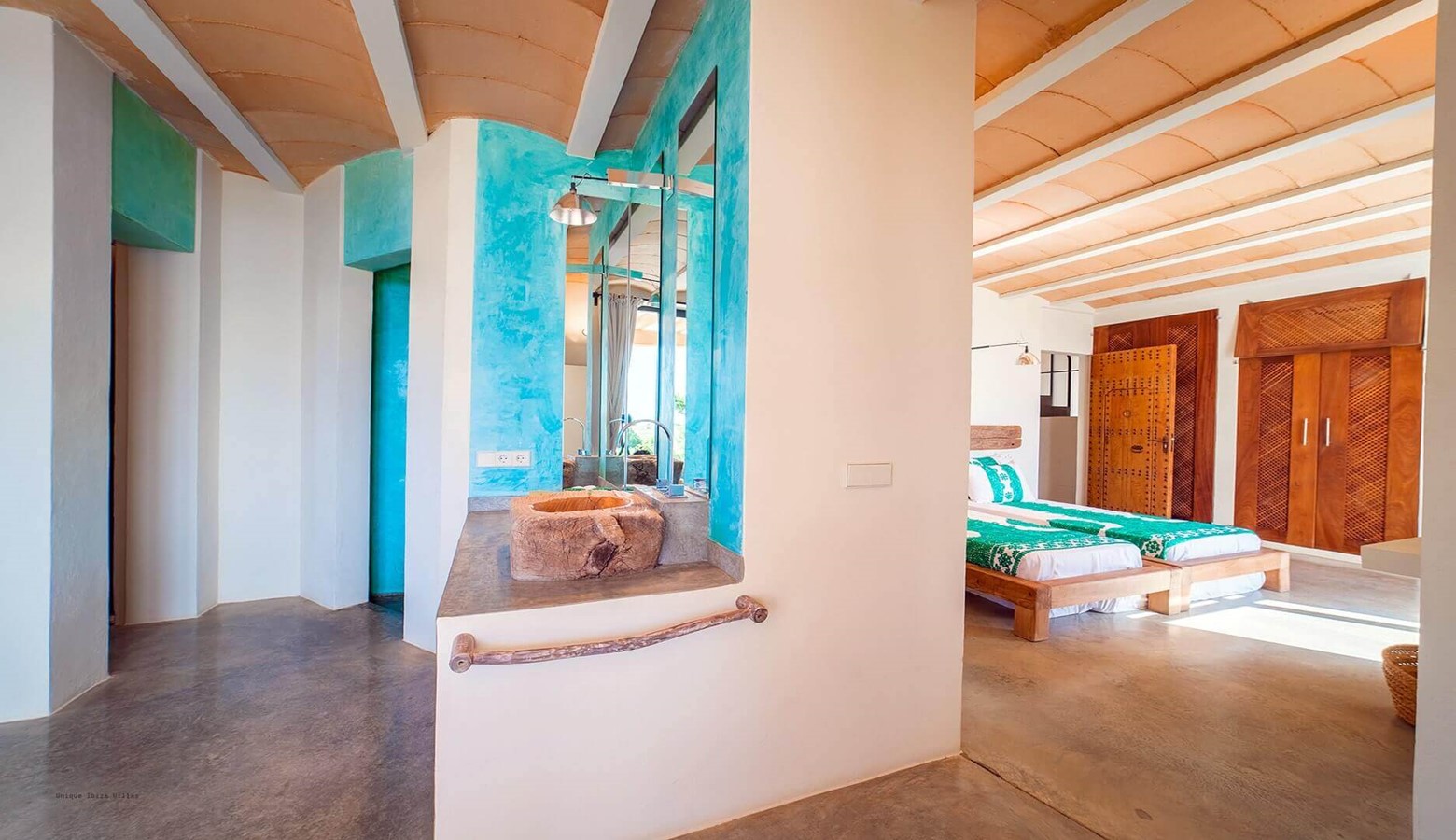 On the first floor is the master bedroom with double bed, air conditioning and large terrace with sea views. Open plan bathroom with Moroccan style bath big enough for at least 2 and separate shower
