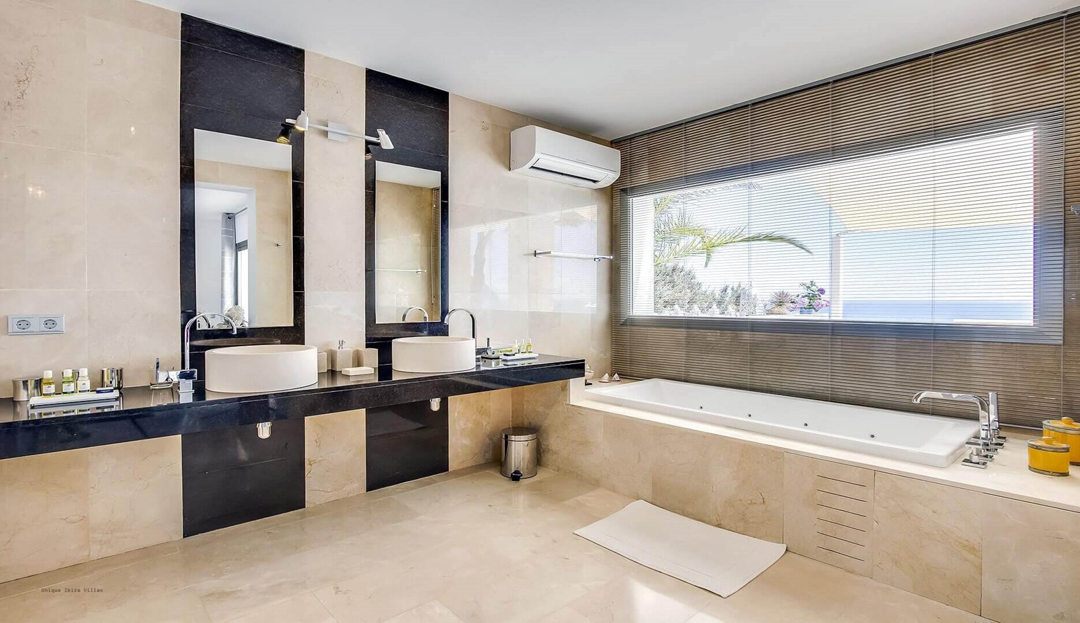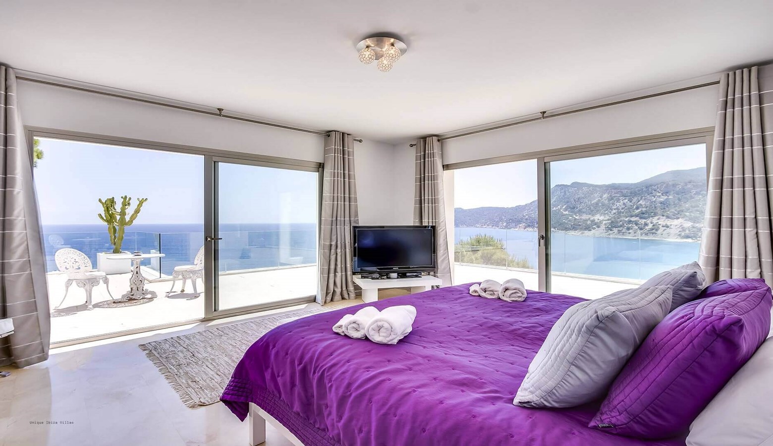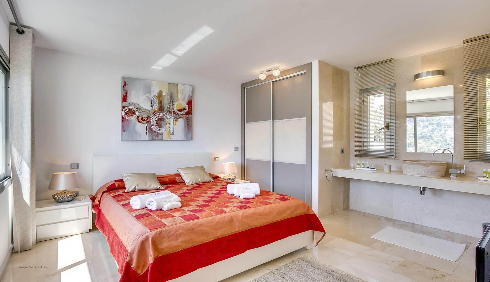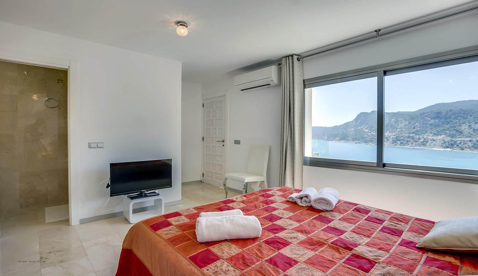 The Master bedroom with 40 m2 of space, double bed, air conditioning, en suite bathroom with shower and Jacuzzi bath and private entrance with sea views