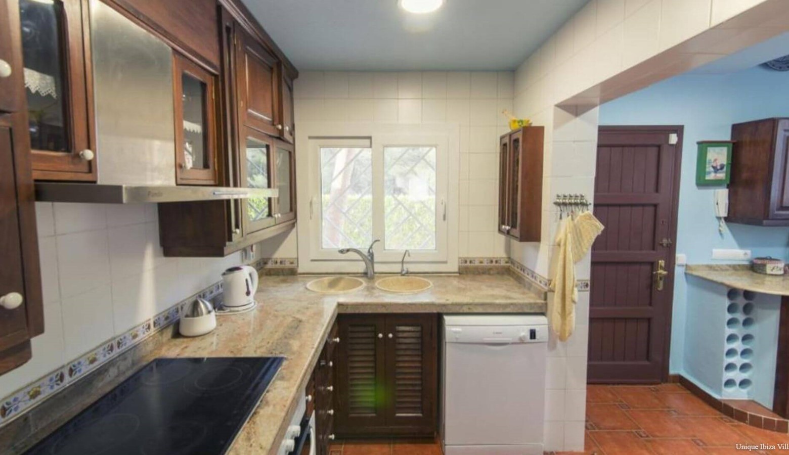 Fully equipped kitchen (washing machine is located in the garage) and living/dining room which leads to the outside dining area, gardens and swimming pool