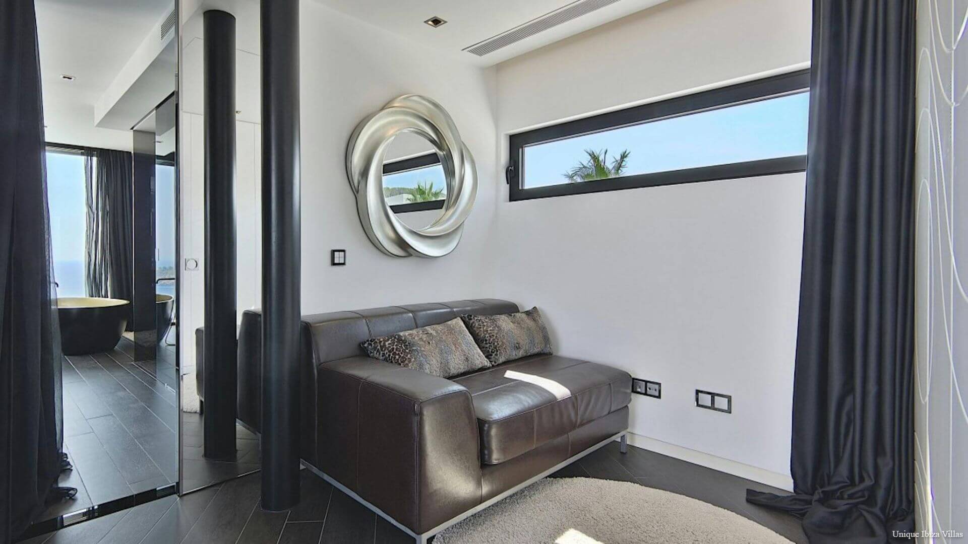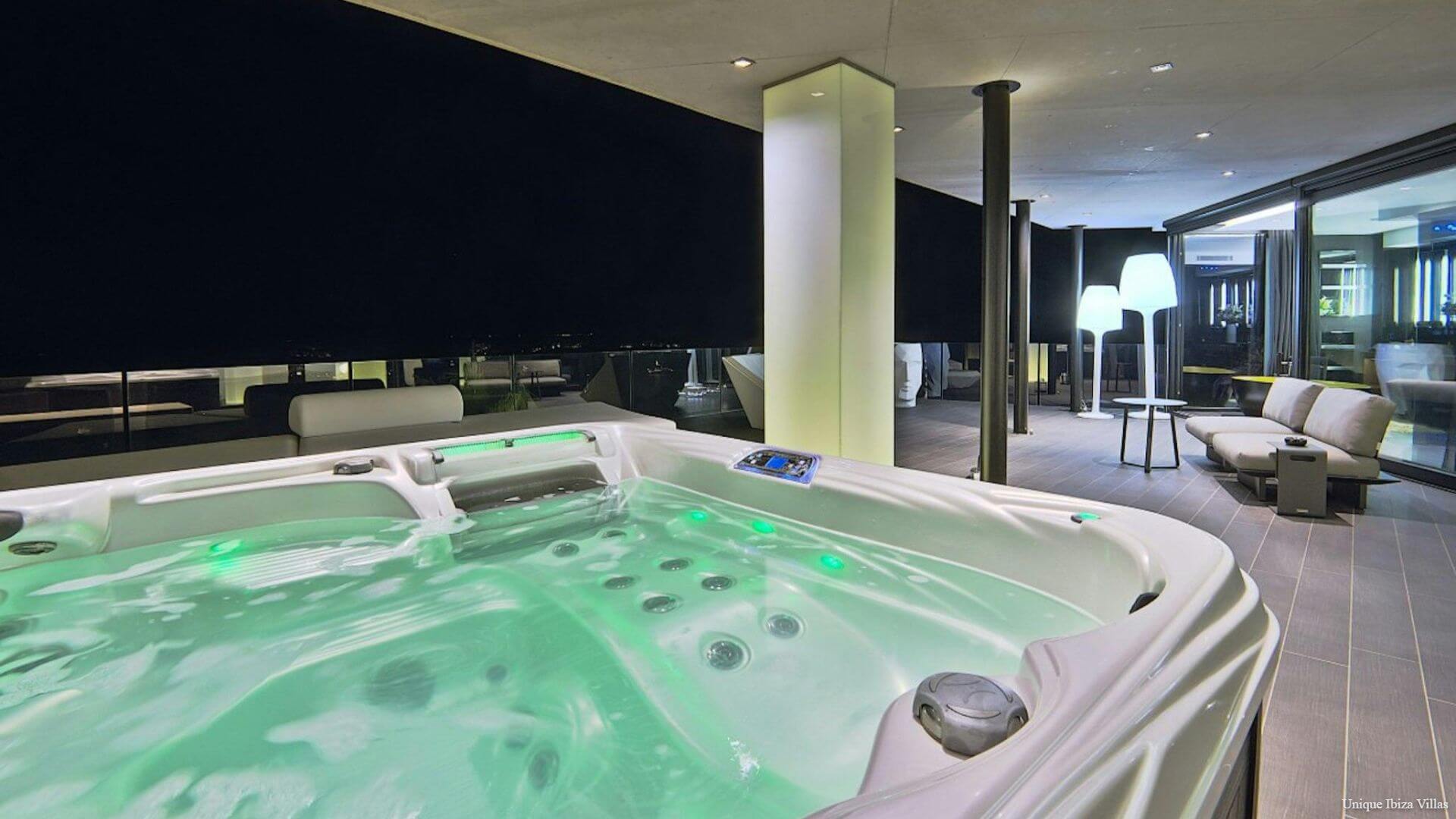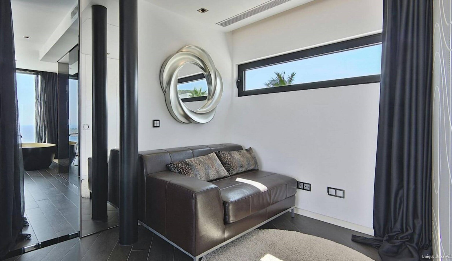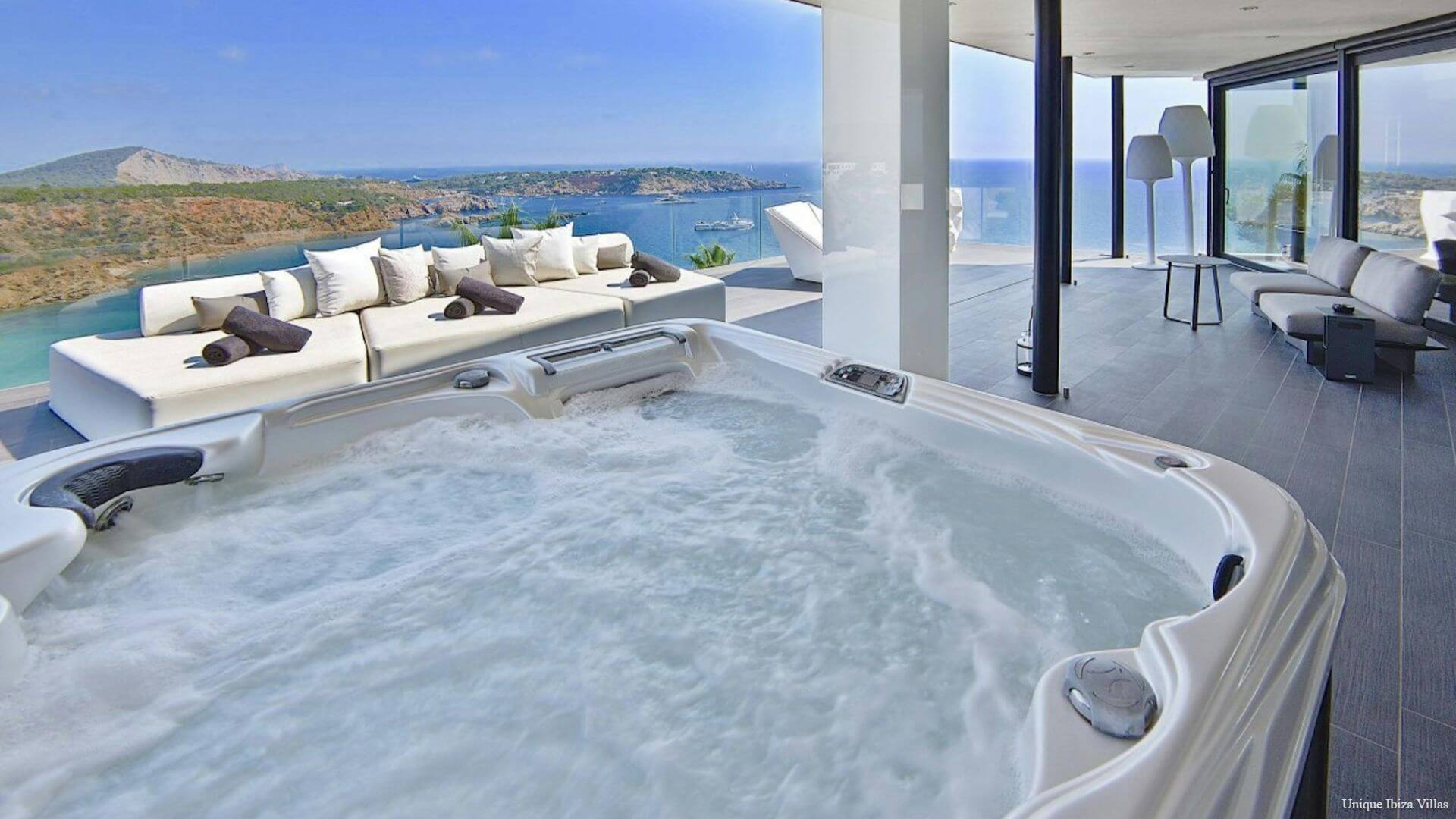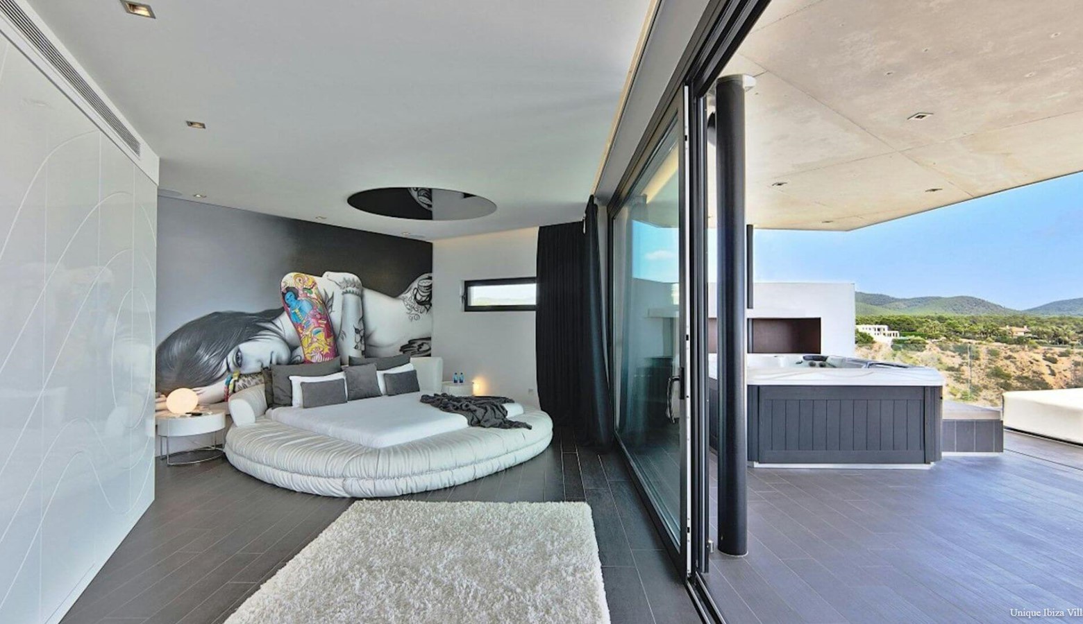 Master suite with Circular king size bed, open plan free standing bathtub, large terrace with sea views large daybeds and hot tub/jacuzzi