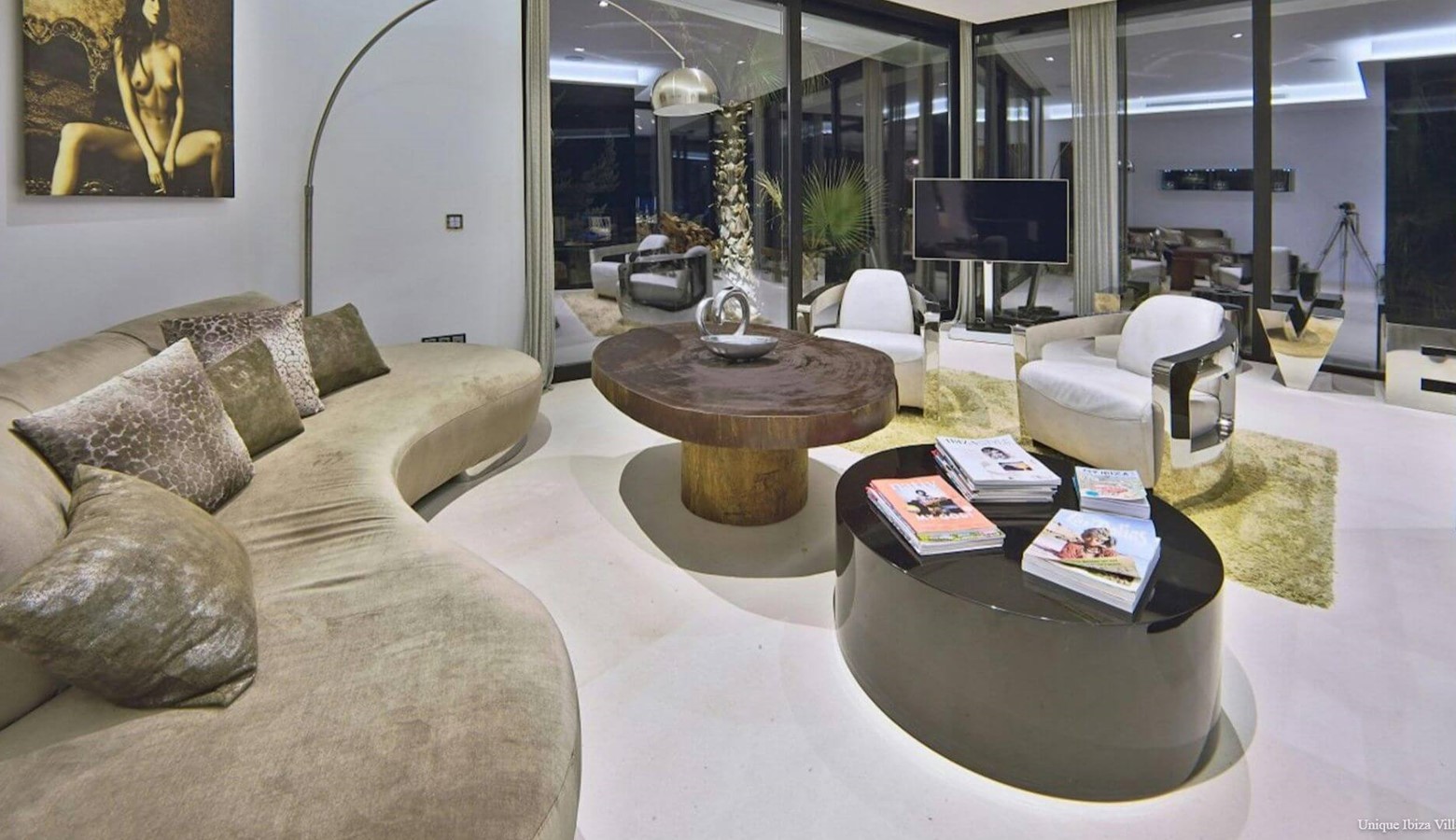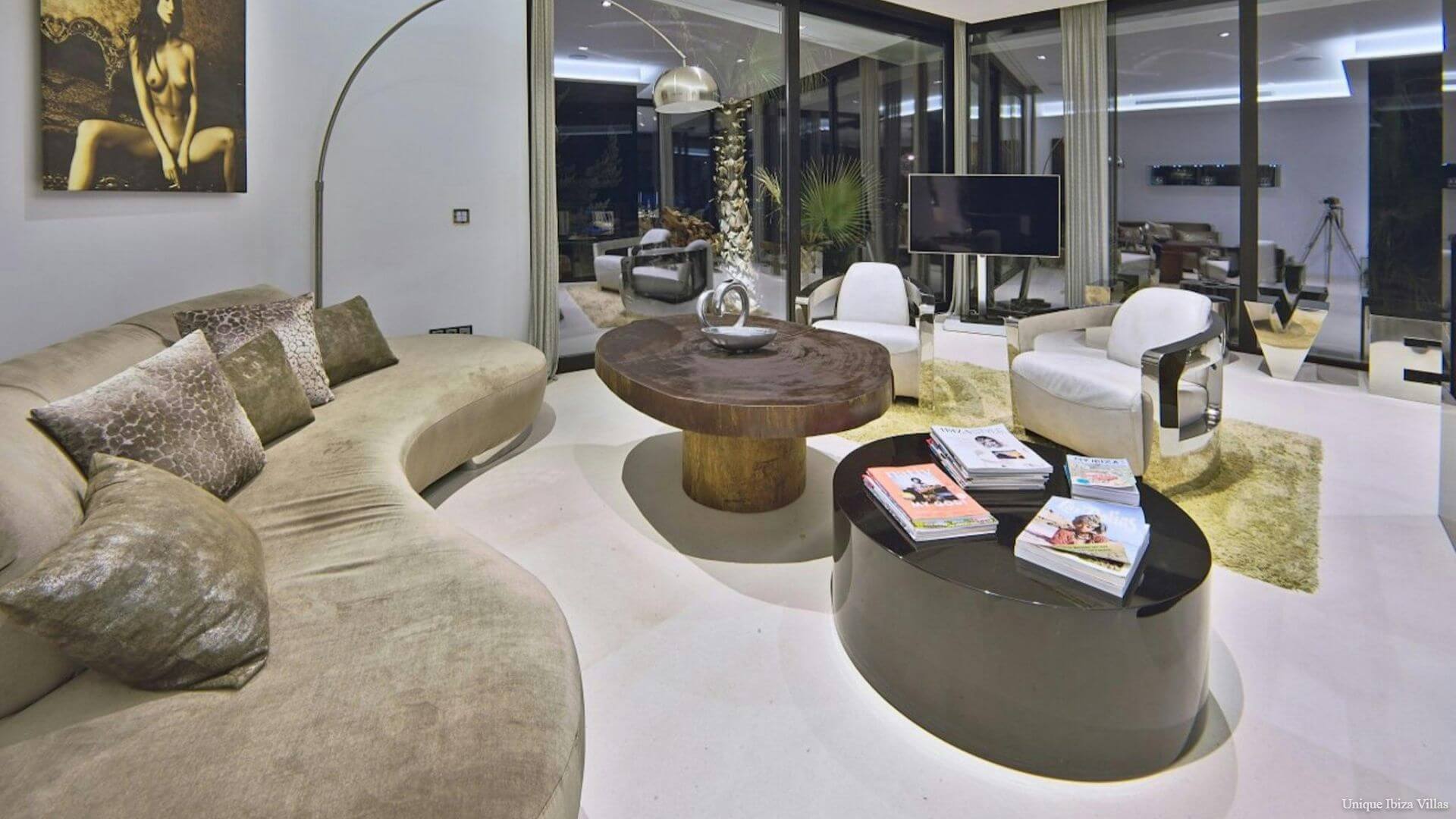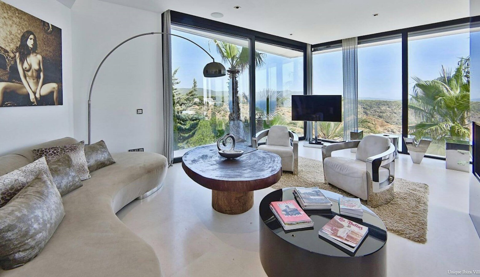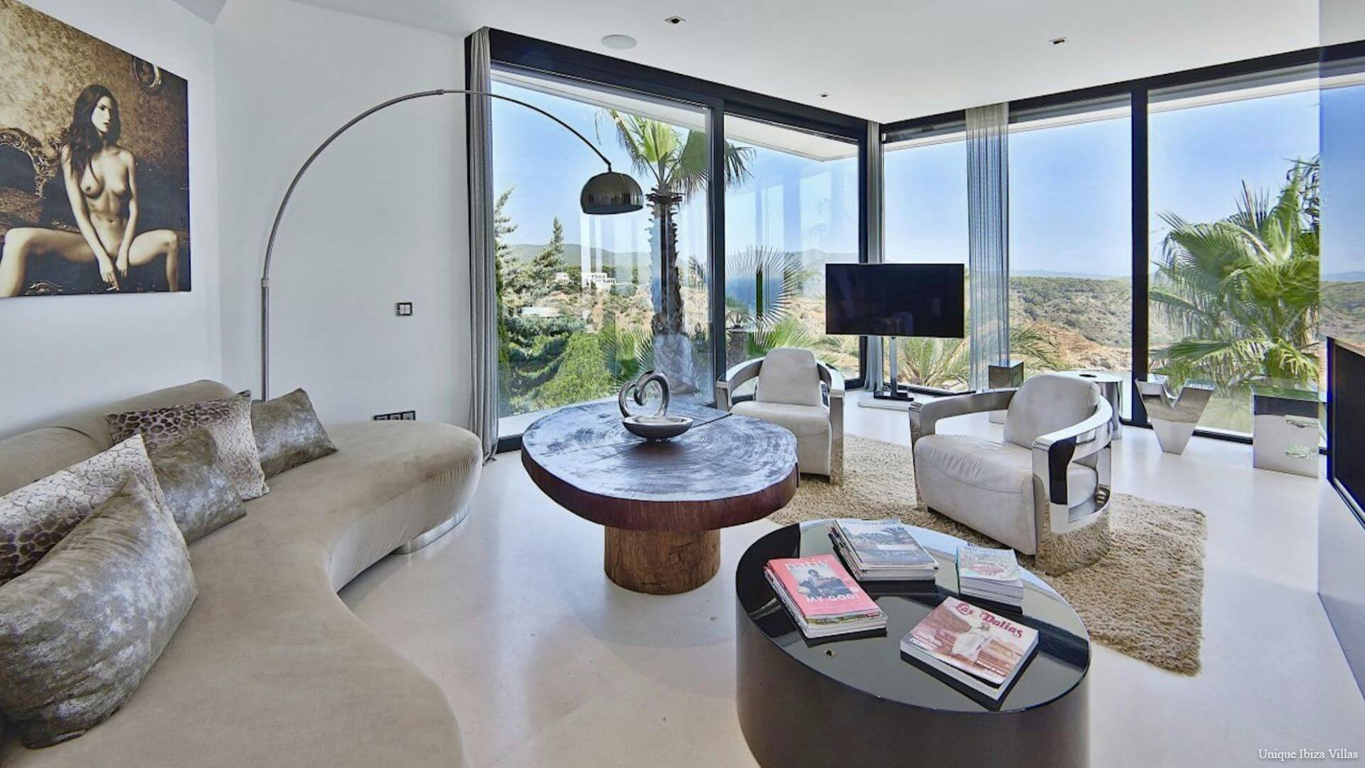 Open plan living with contemporary décor and floor to ceiling glass windows with sea view
