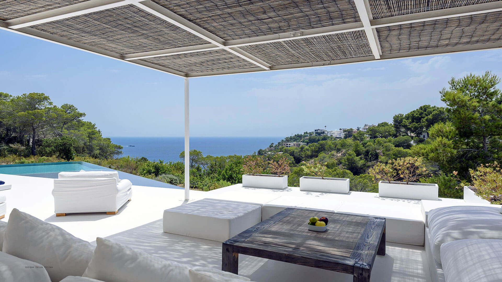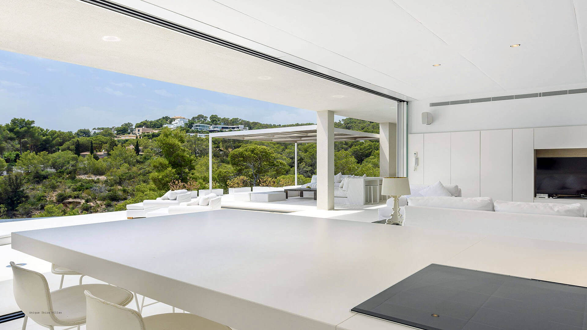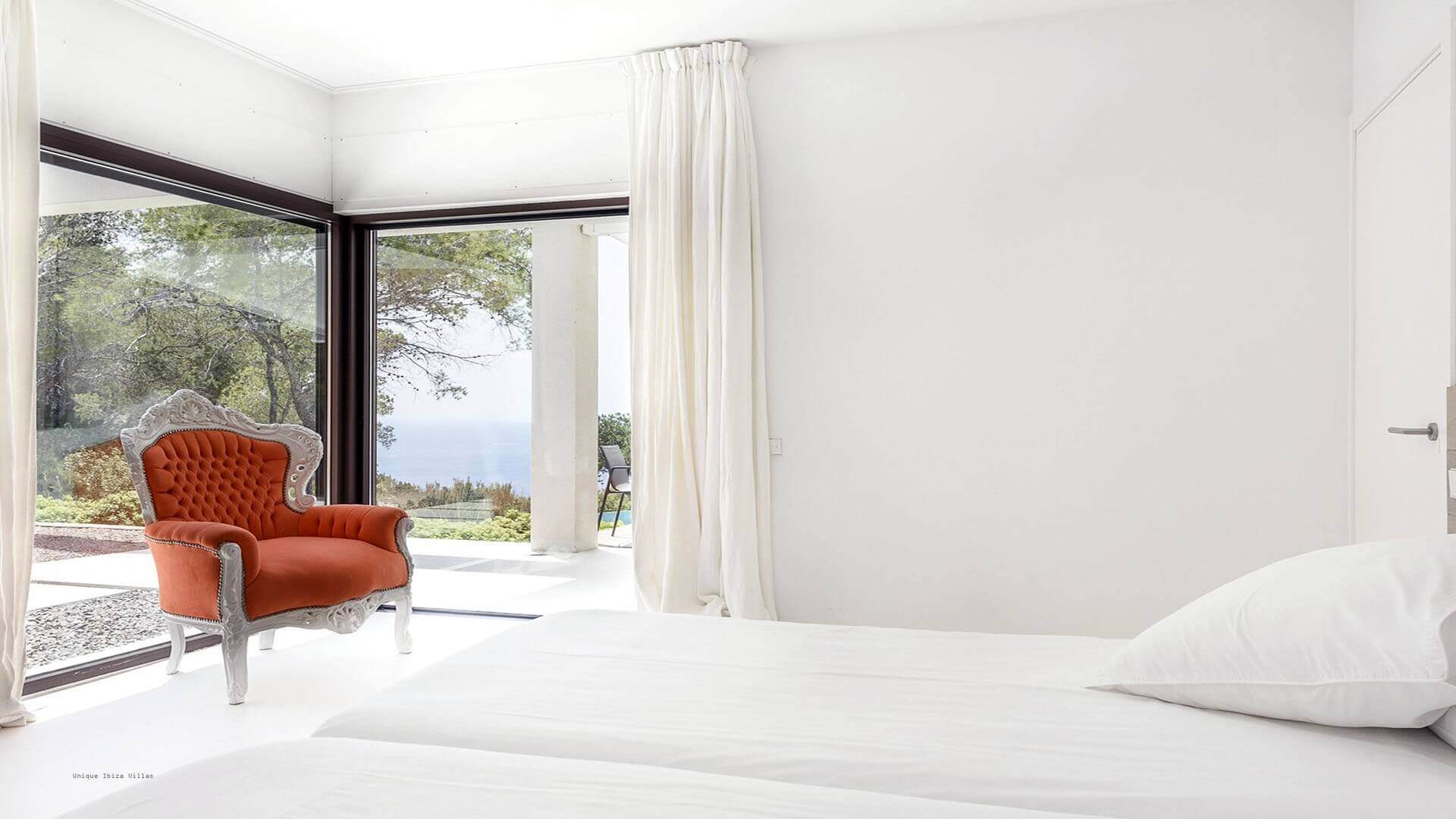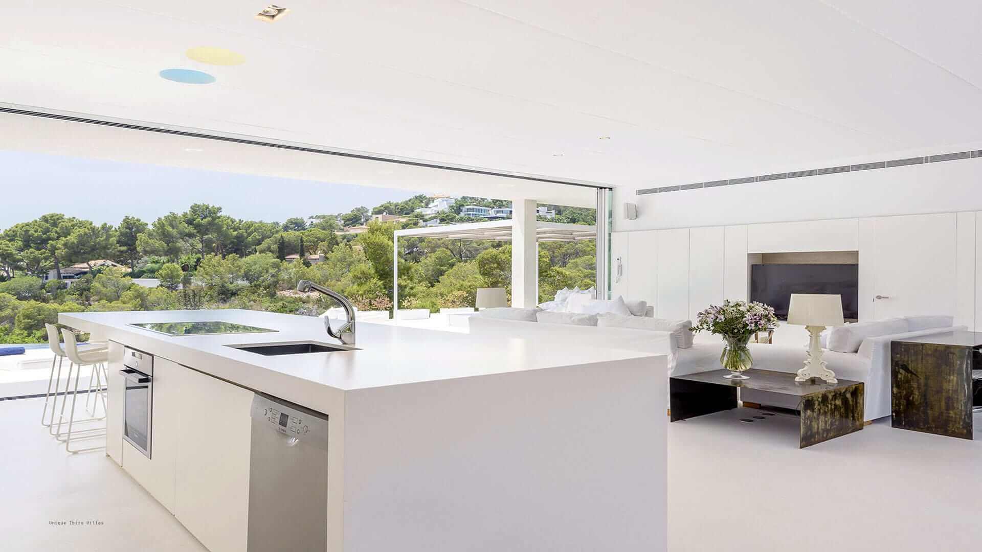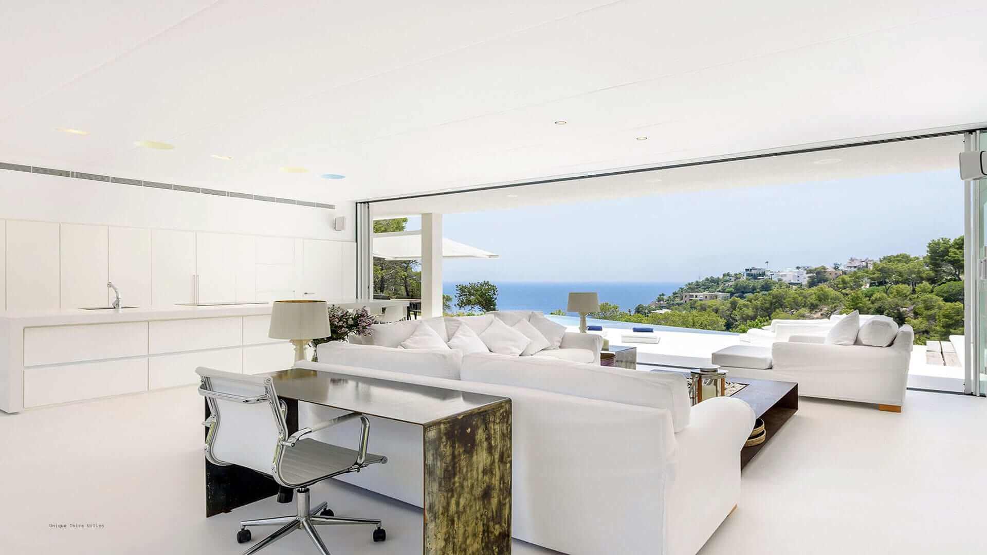 This modern all white 4-bedroom prestige Ibiza villa offers sea views and a partial sunset view over the hills to the west coast