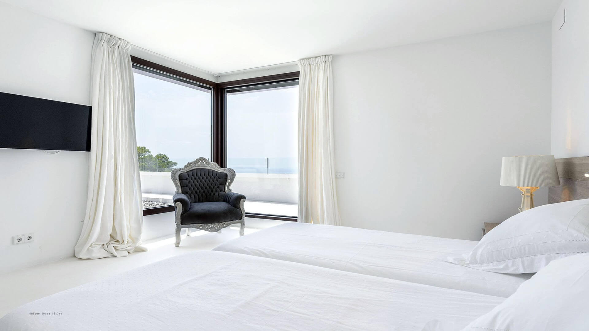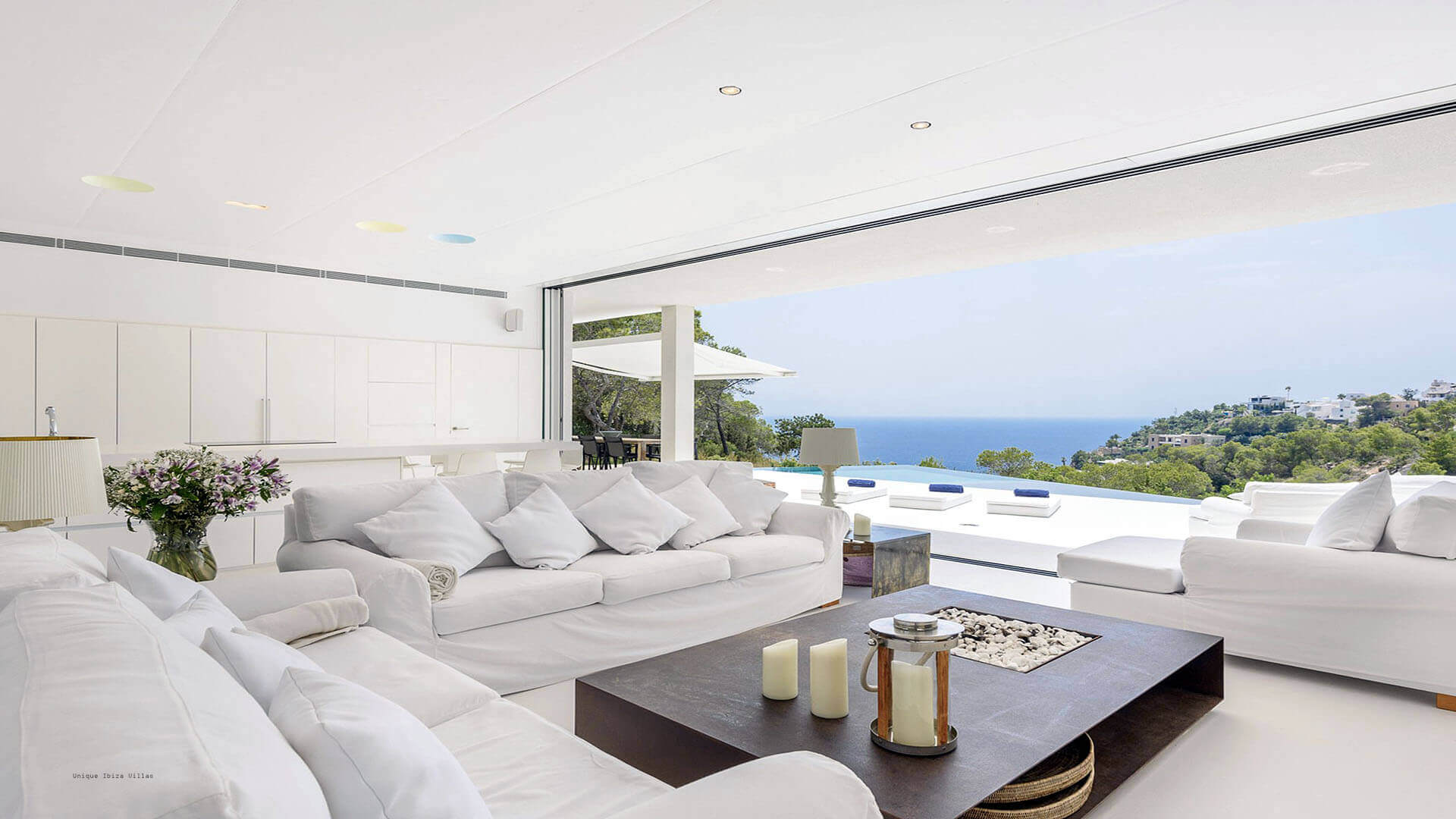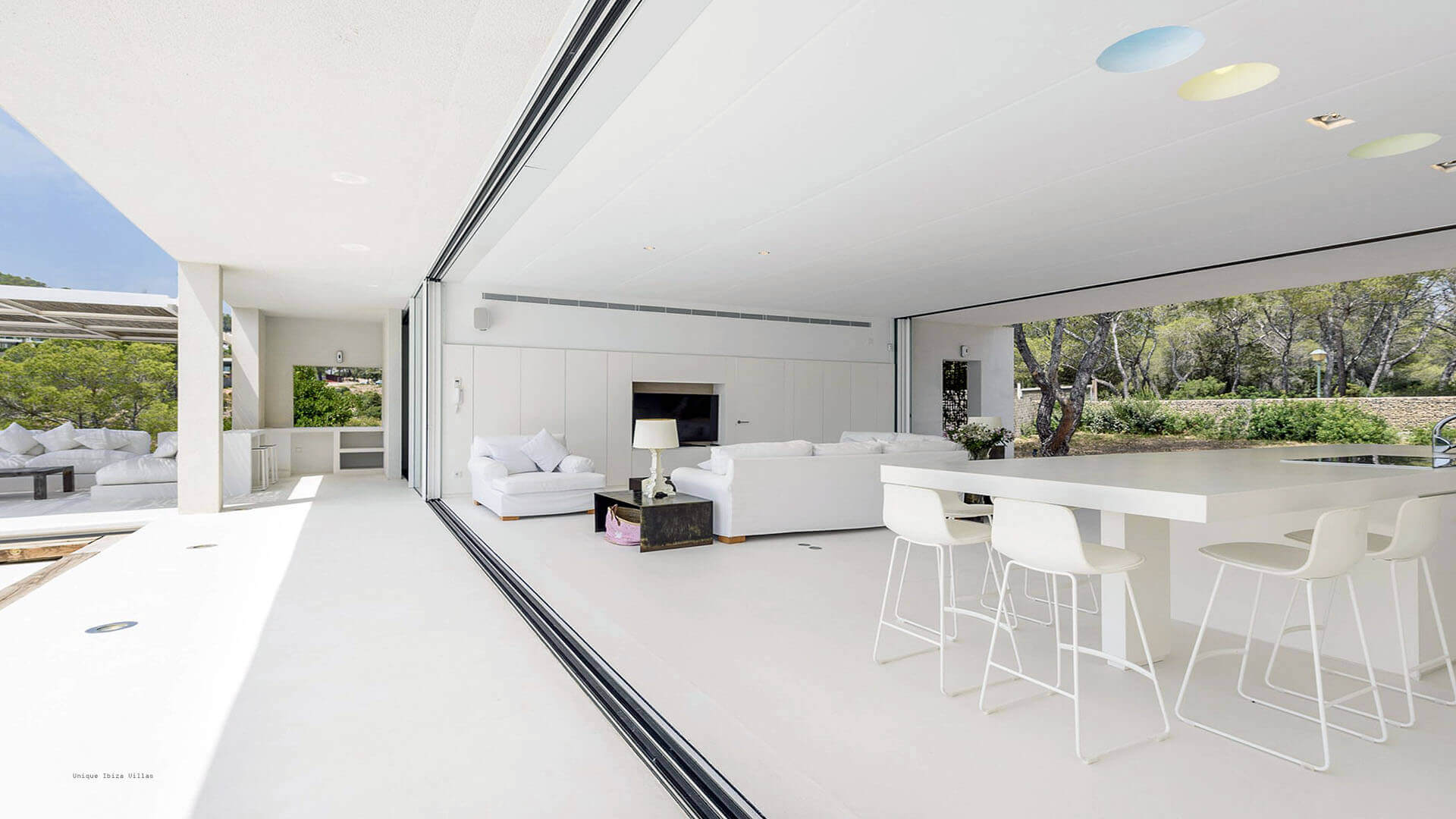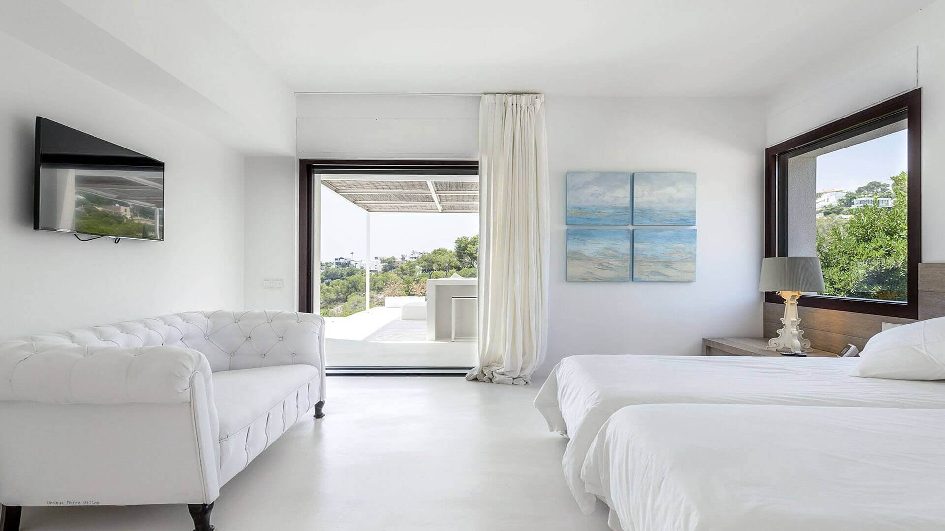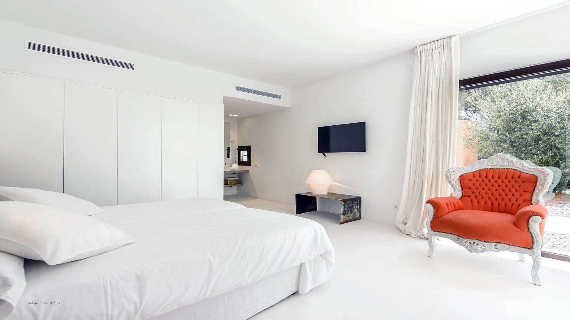 This modern all white 4-bedroom prestige Ibiza villa offers sea views and a partial sunset view over the hills to the west coast