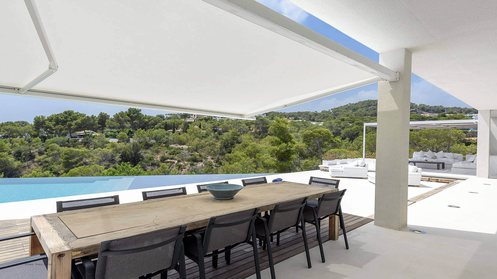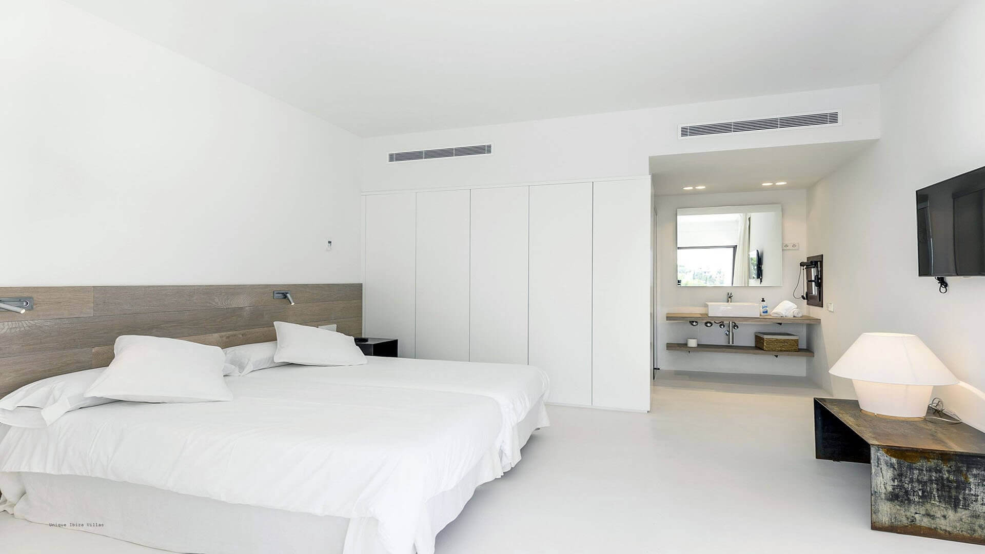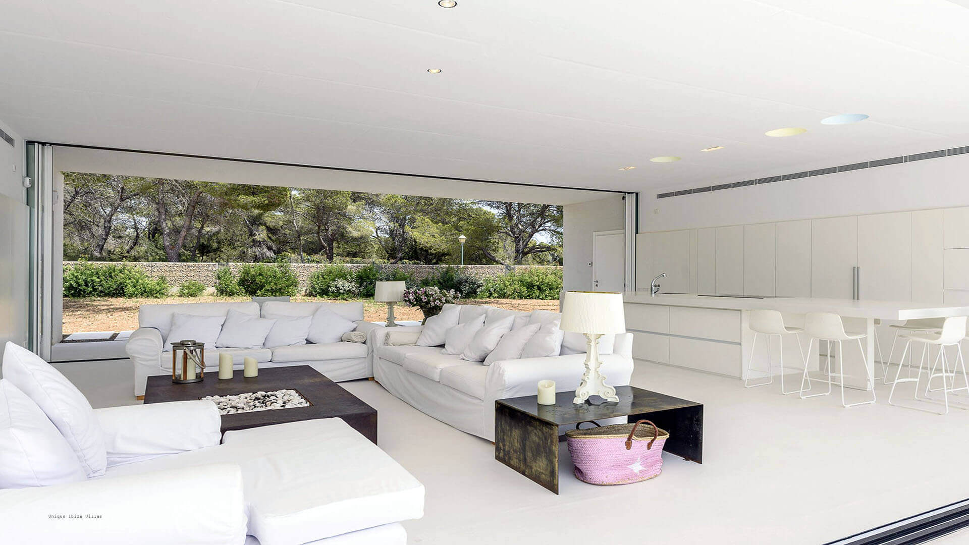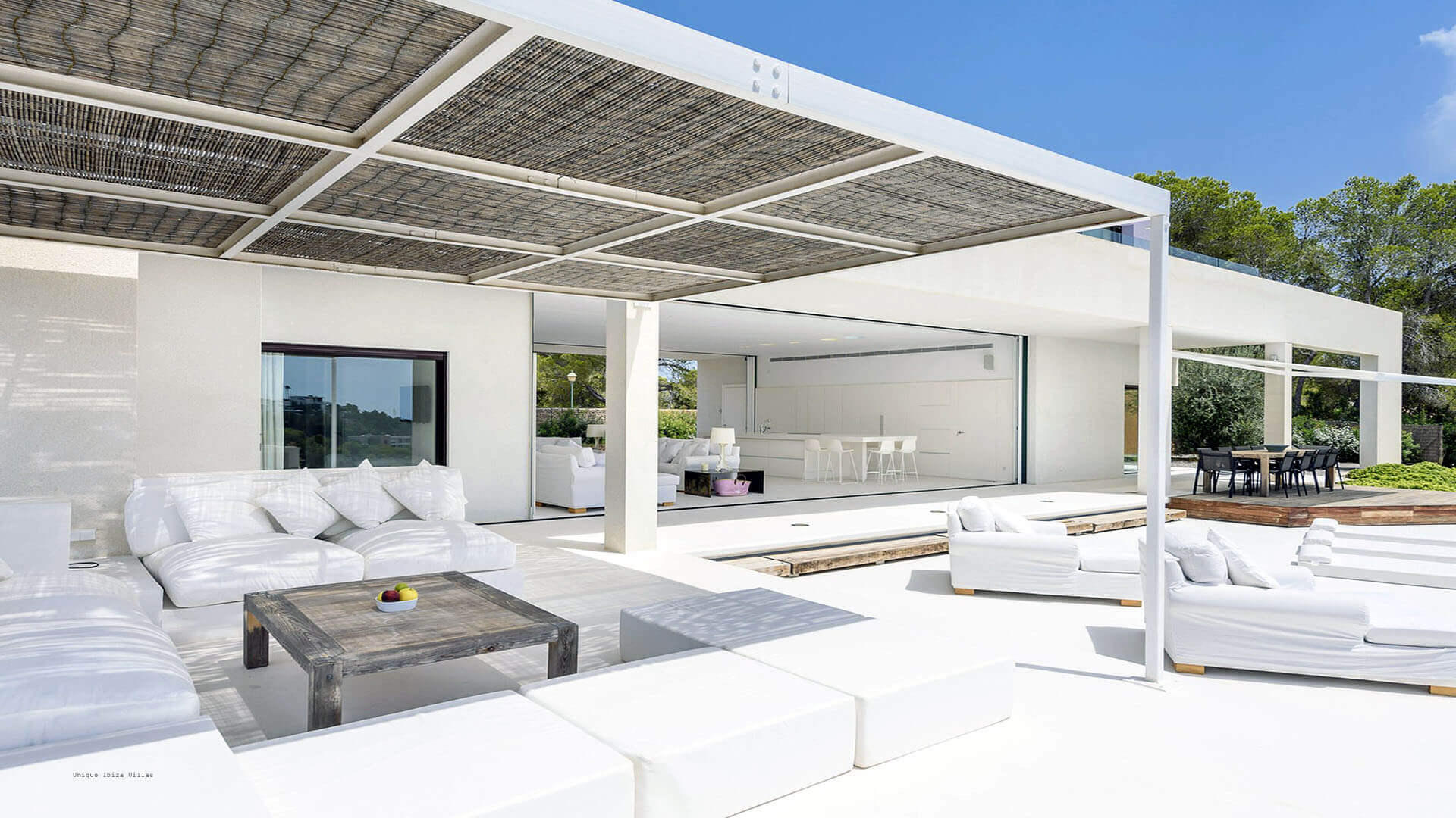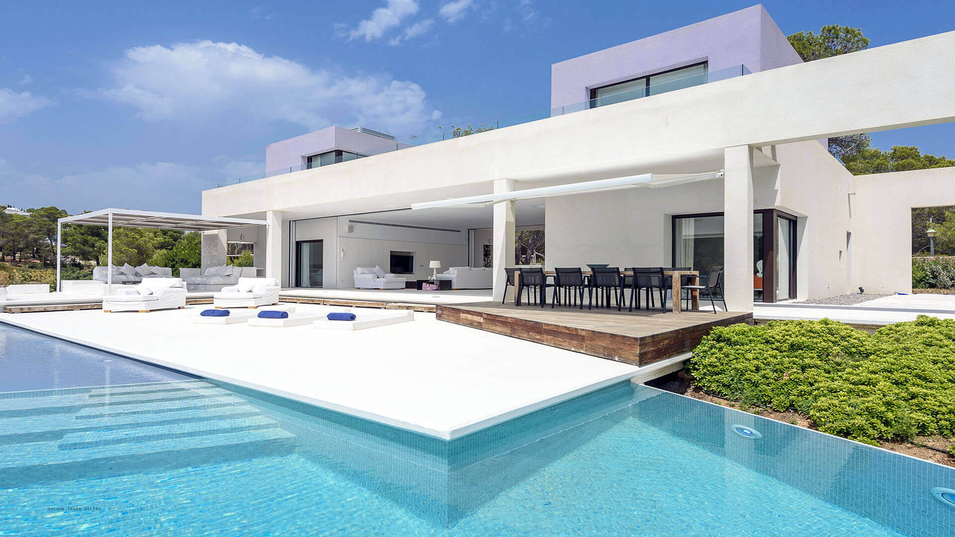 This modern all white 4-bedroom prestige Ibiza villa offers sea views and a partial sunset view over the hills to the west coast