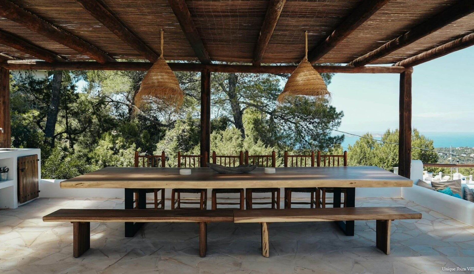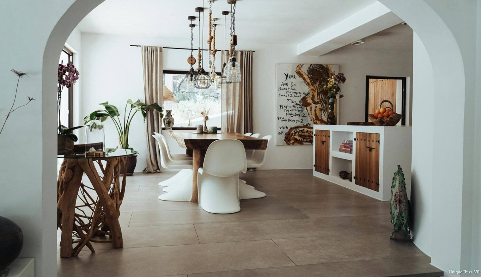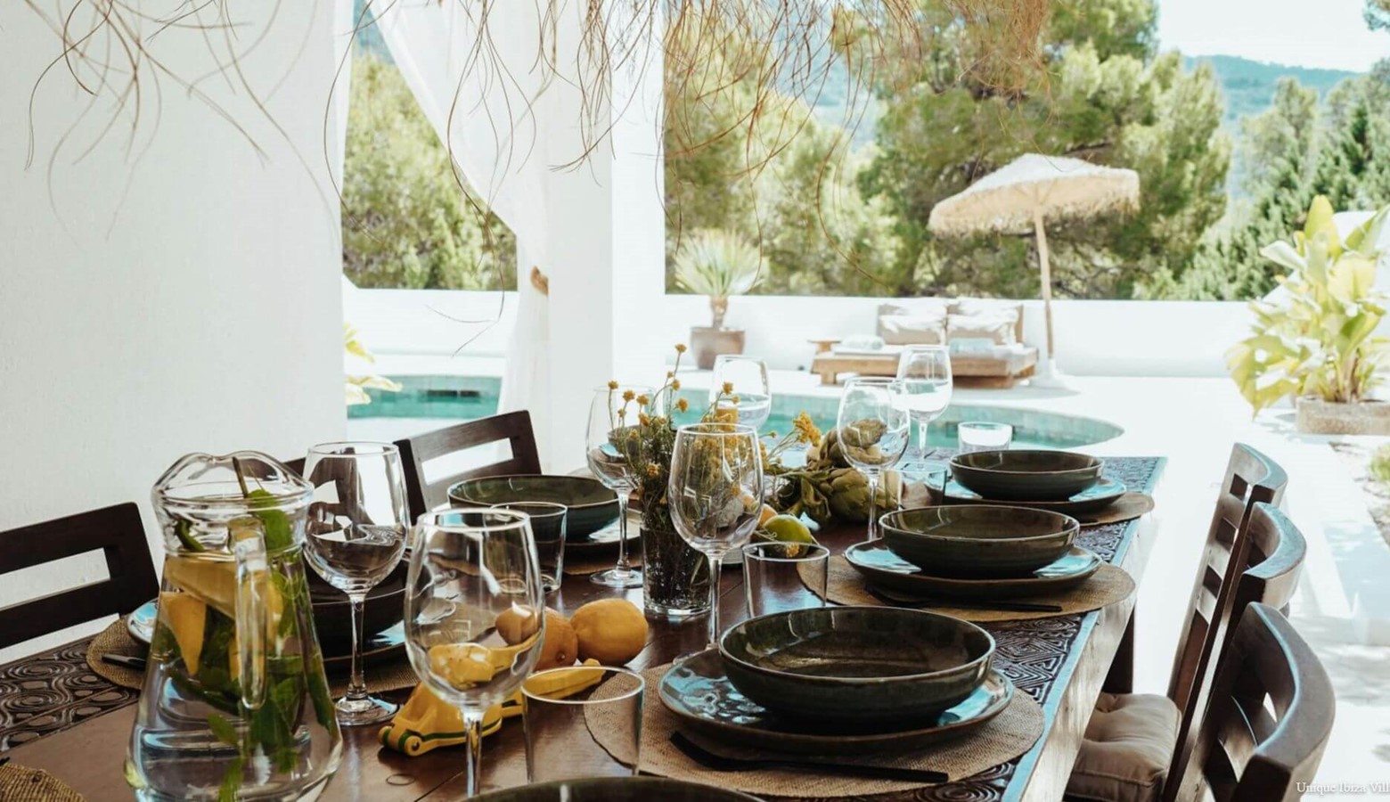 Dining area with 5 meters long dining table; views directly to Es Vedra so ideal for sunset dinners