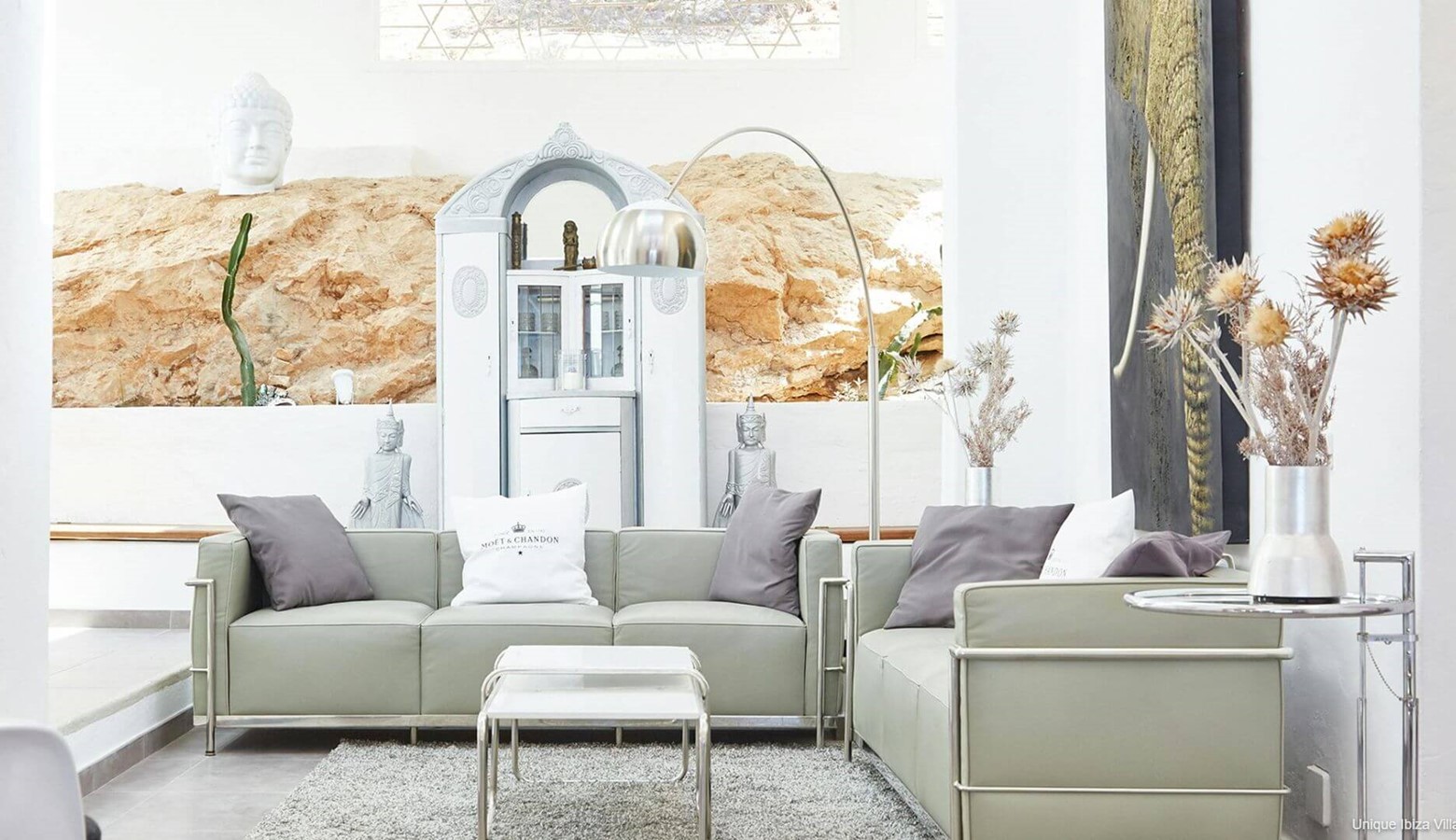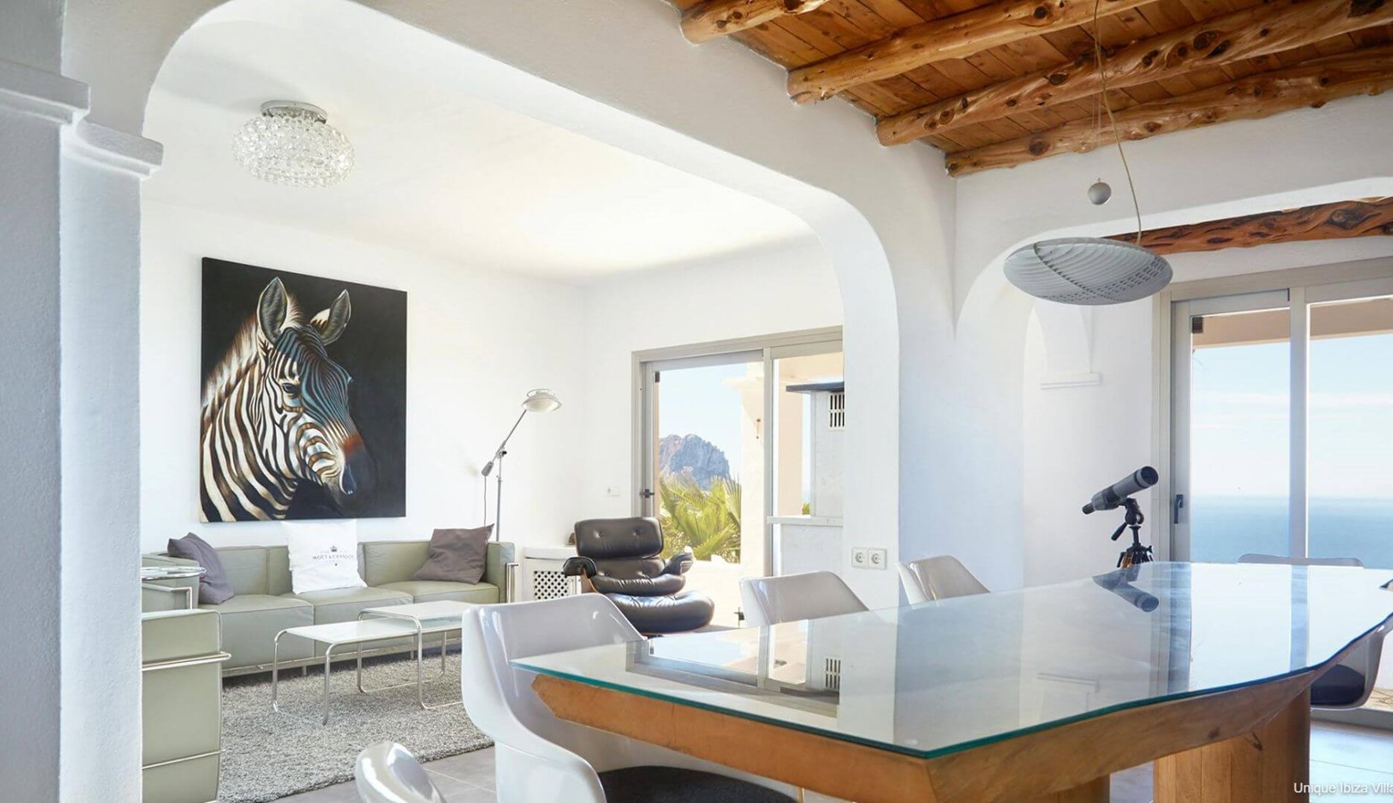 Living area with exposed rock and door leading to the terrace, sea views, Es Vedra views and to one of the swimming pools