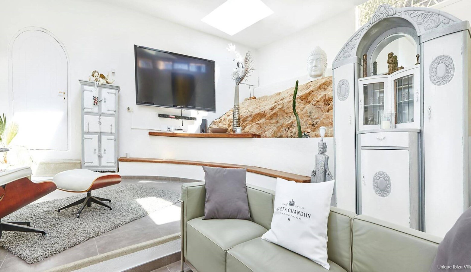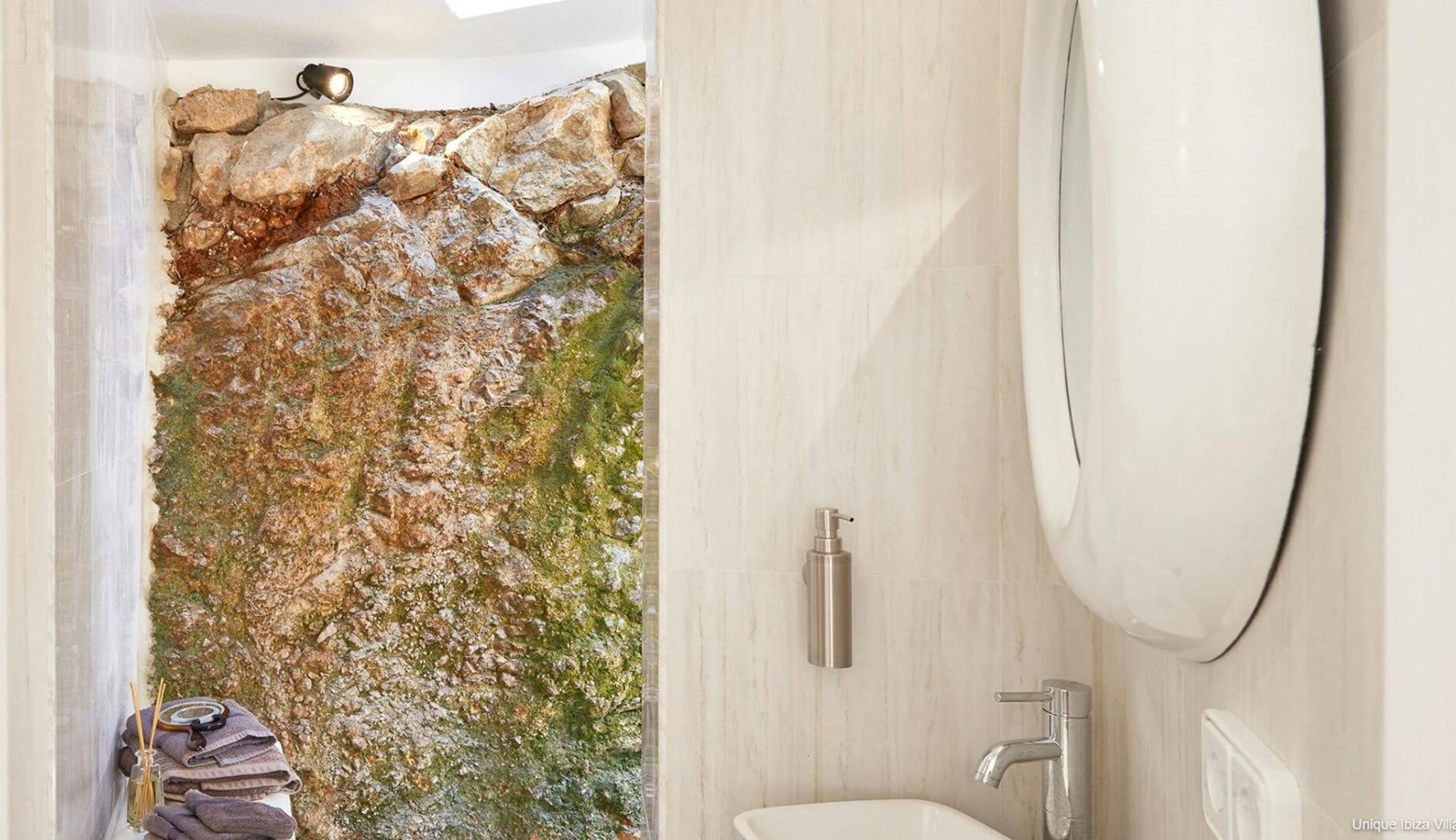 The villa is located on the west coast of Ibiza close to the small beach at Cala Carbo and the larger beach at Cala d'Hort; built into the hillside with the rock used as a feature in the main living area and one of the bathrooms