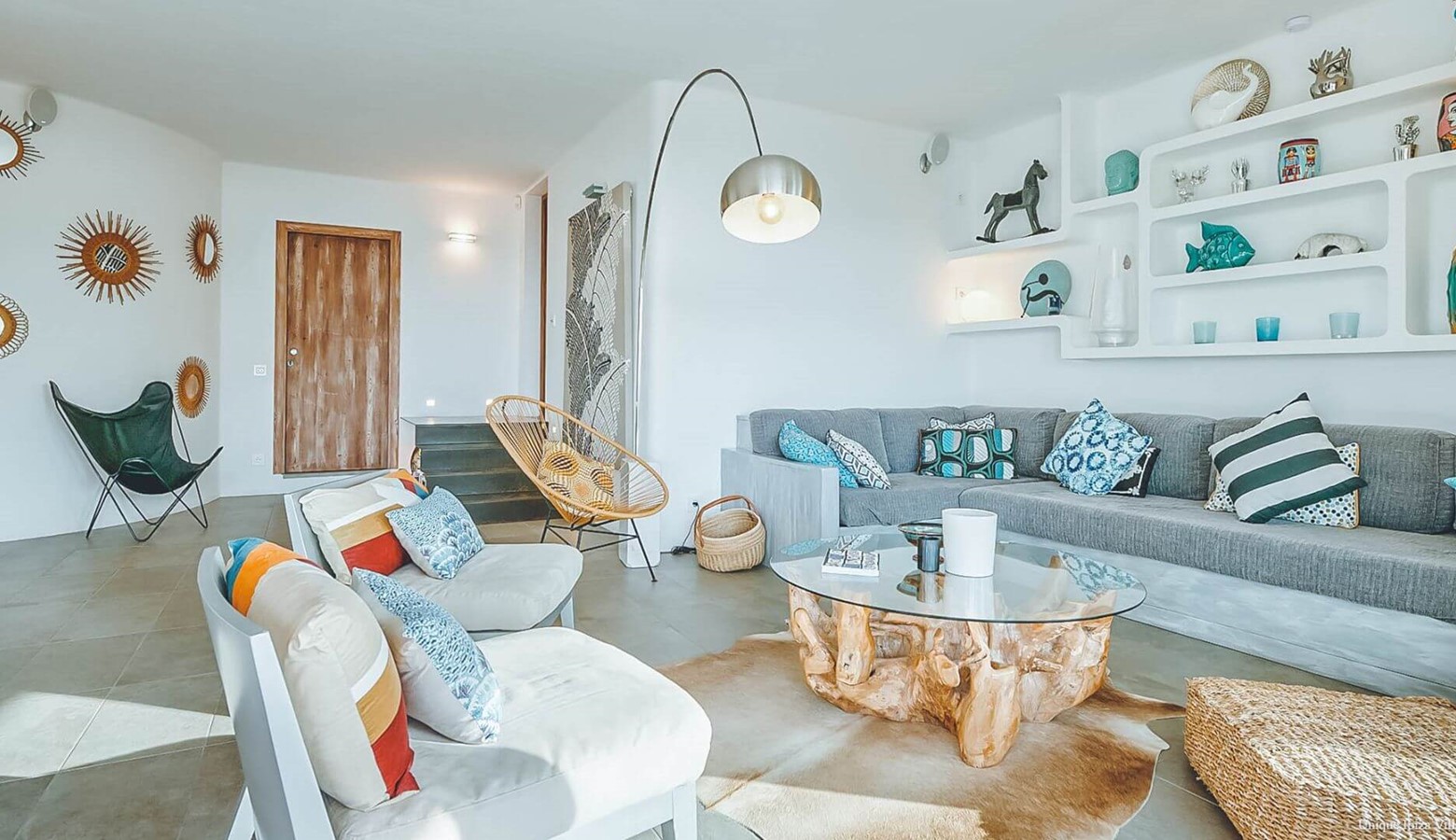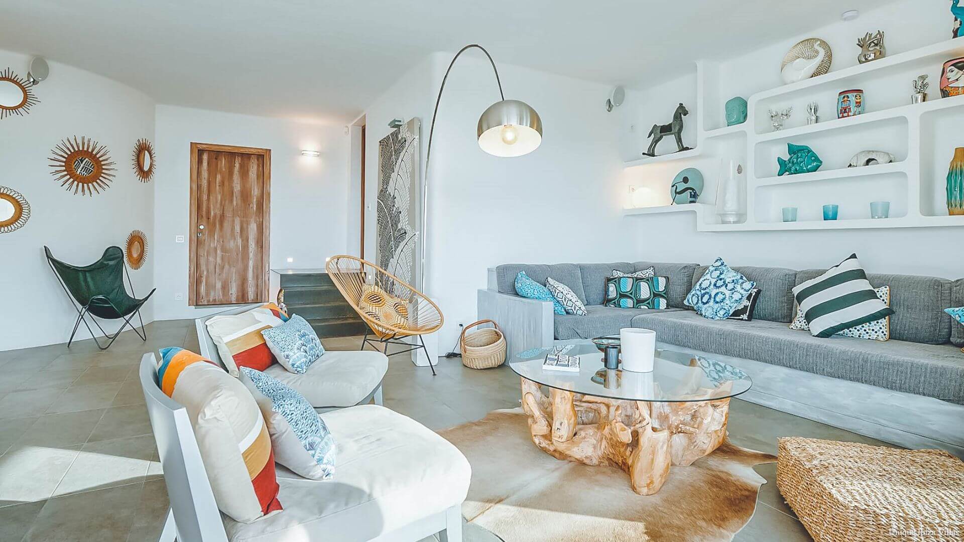 Living and dining area with whitewashed walls, corner sofa, tastefully decorated with nautical themed art adorning the walls