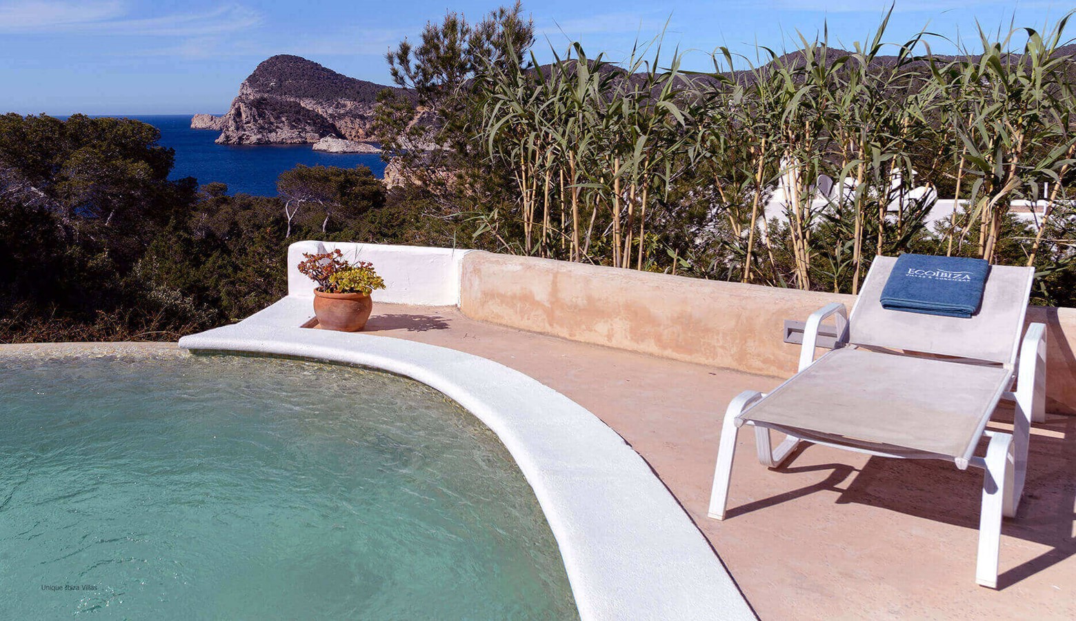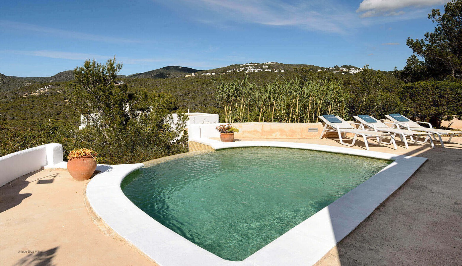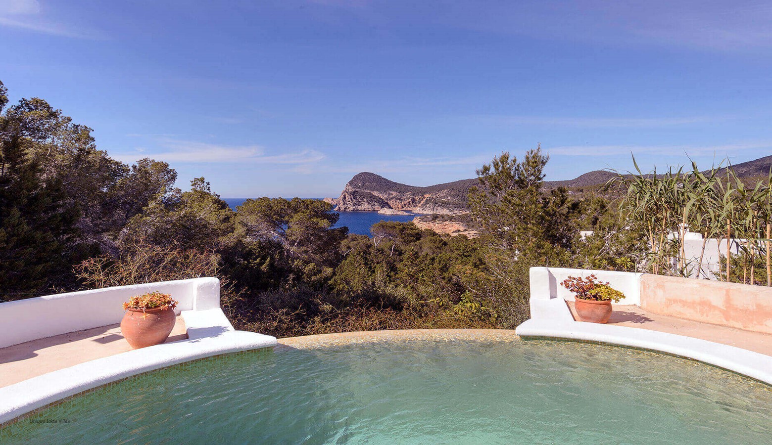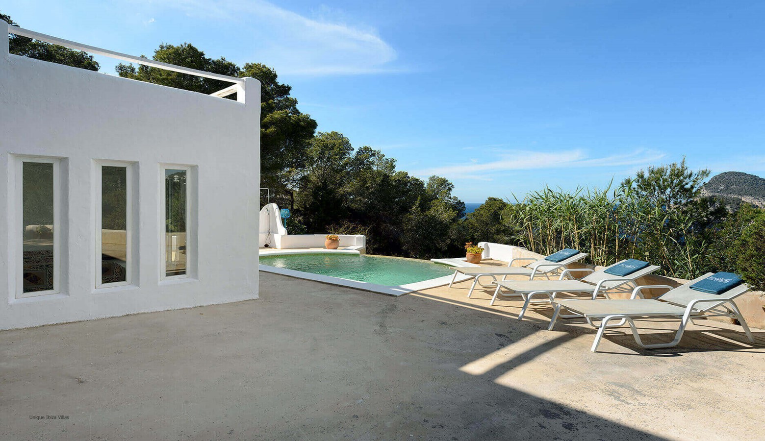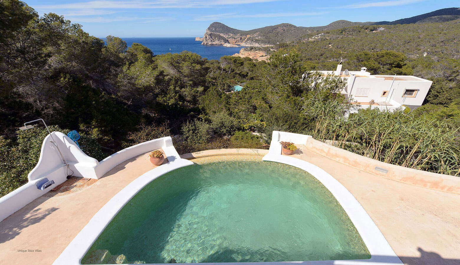 The plunge pool measure 5 metres x 4 metres with infinity edge and panoramic views to the pine covered bay of Cala Salada and the beautiful blue waters of the sea. Cala Salada is one of the best sunset viewing points on the island and you do get a spectacular vantage point from this villa.