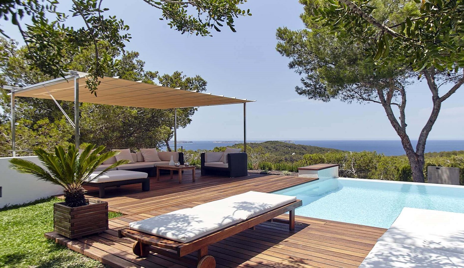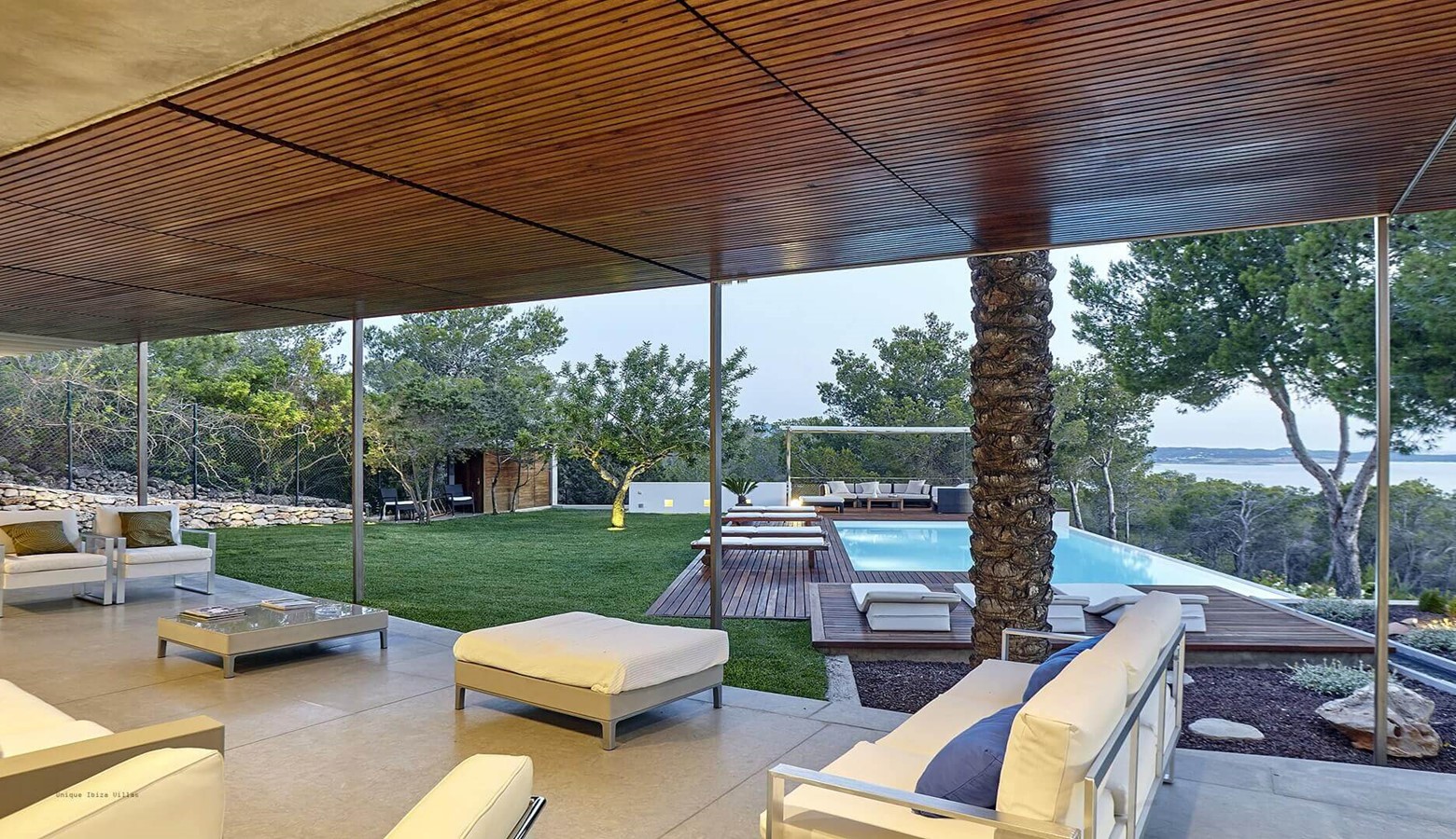 Villa Sol Post is a modern architect designed villa with 5 bedrooms with incredible panoramic  sea views and even more spectacular sunset views from the gardens & pool area. The villa is located close to the area and beach of Cala Salada and near to the beaches of Cala Gracio and Cala Gracioneta. The busy resort of San Antonio is close by but if you choose not to go there then you will not even know it is there, however San Antonio does have some iconic places to visit including Pikes, Cafe Mambo and the area around the Marina has some excellent restaurants.