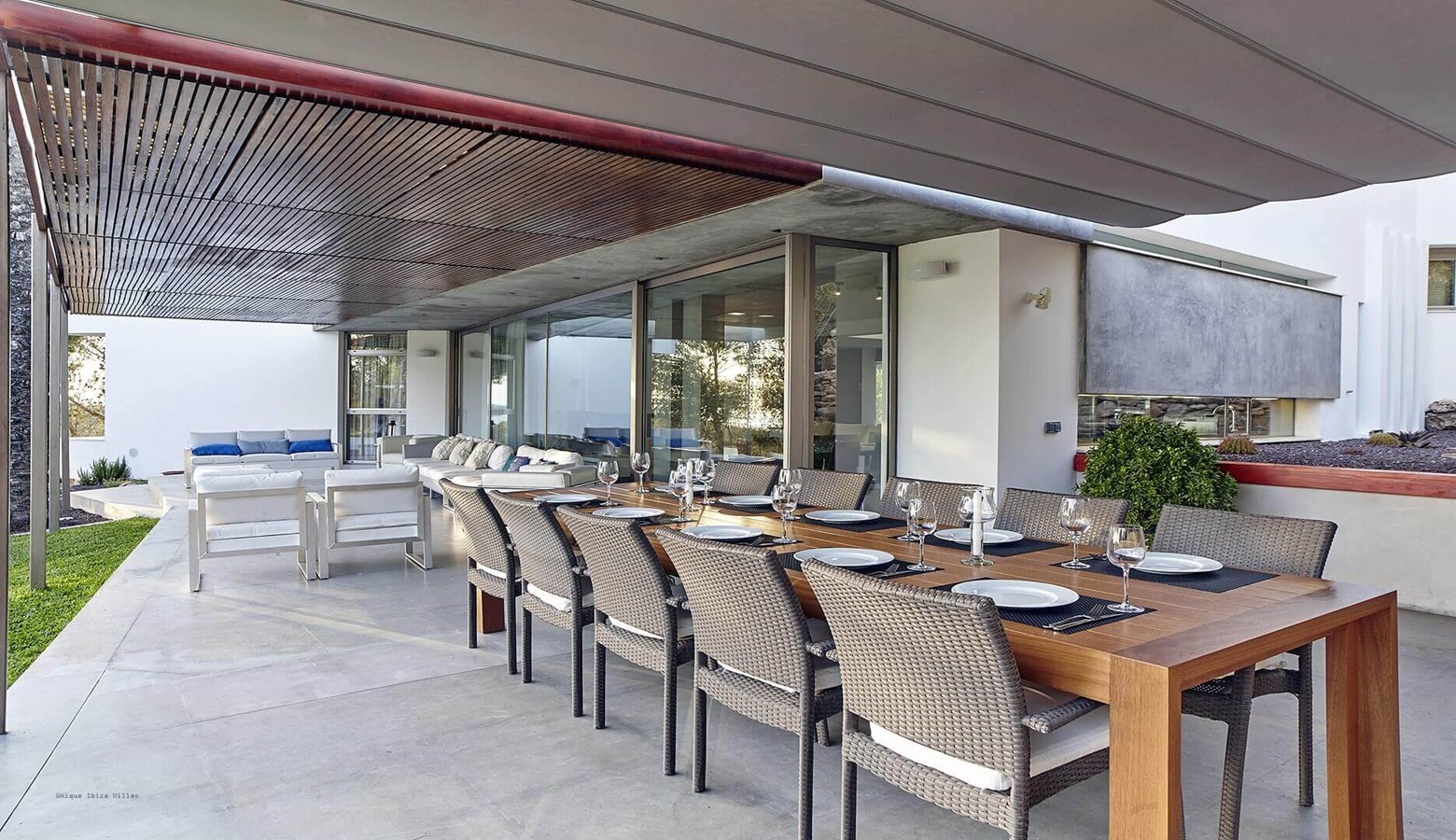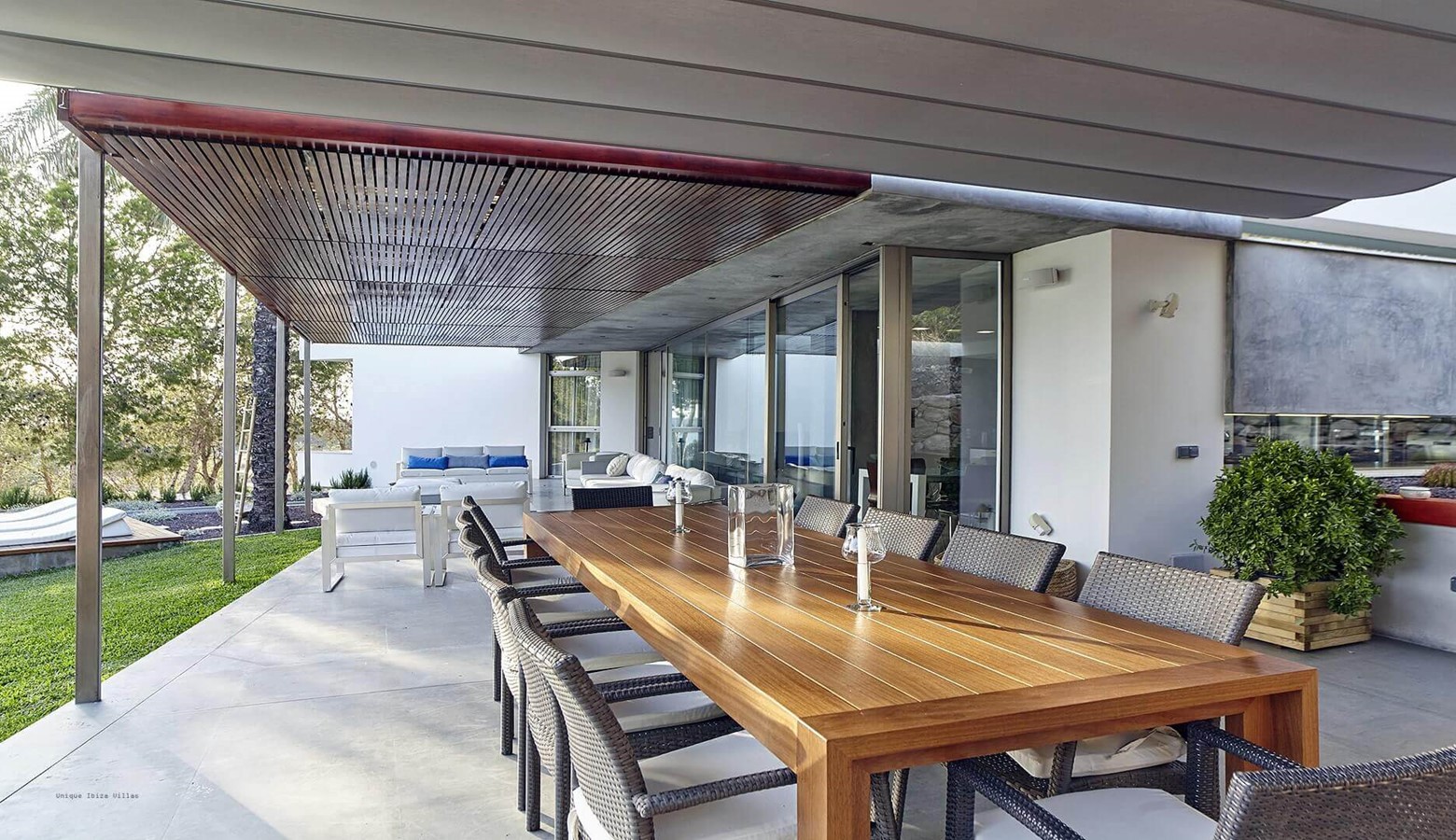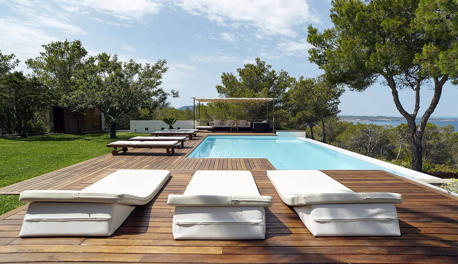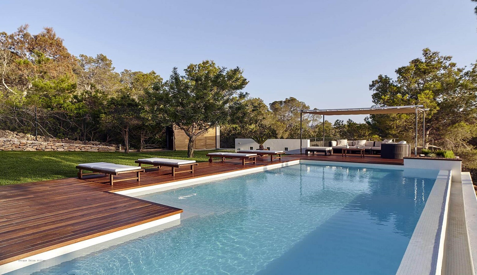 There is a covered dining & seating area that is accessed from the main living area on the ground floor which leads to the large swimming pool and at the far end of the garden is a simple chill out area with sofas.