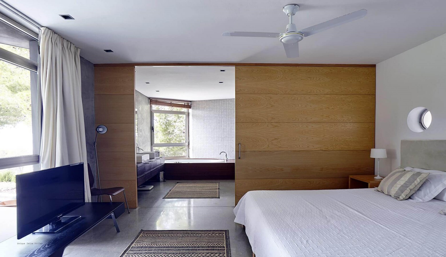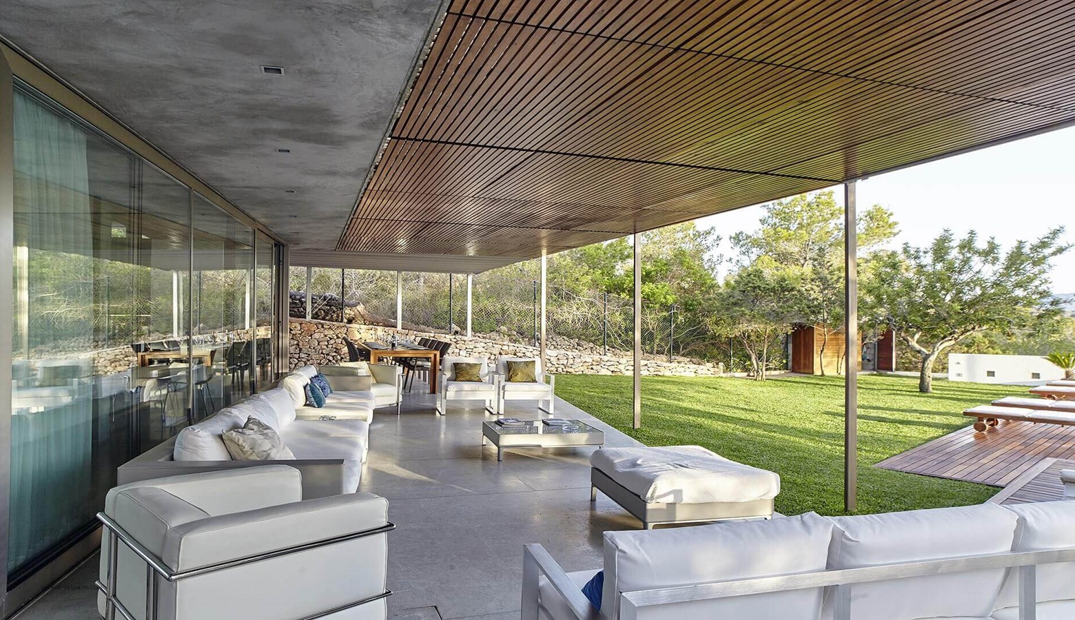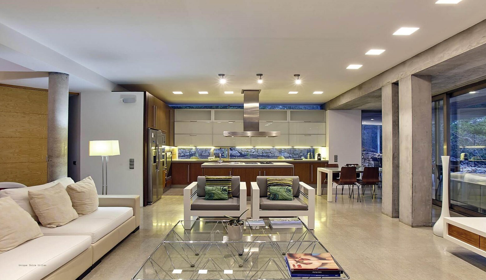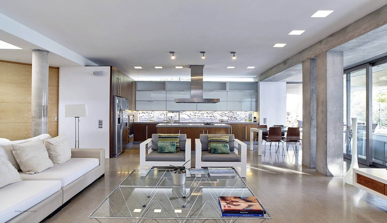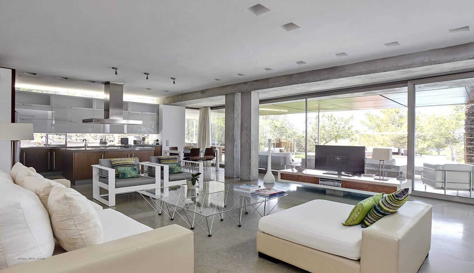 The living area is a mix of whitewashed walls and polished concrete, and floor to ceiling windows leading to the gardens and pool