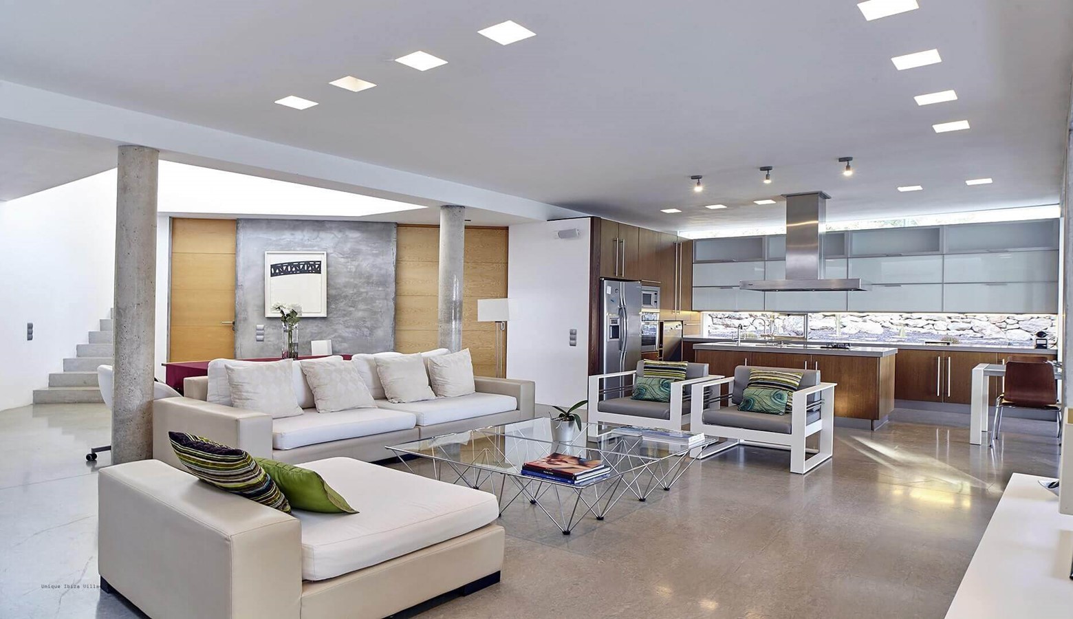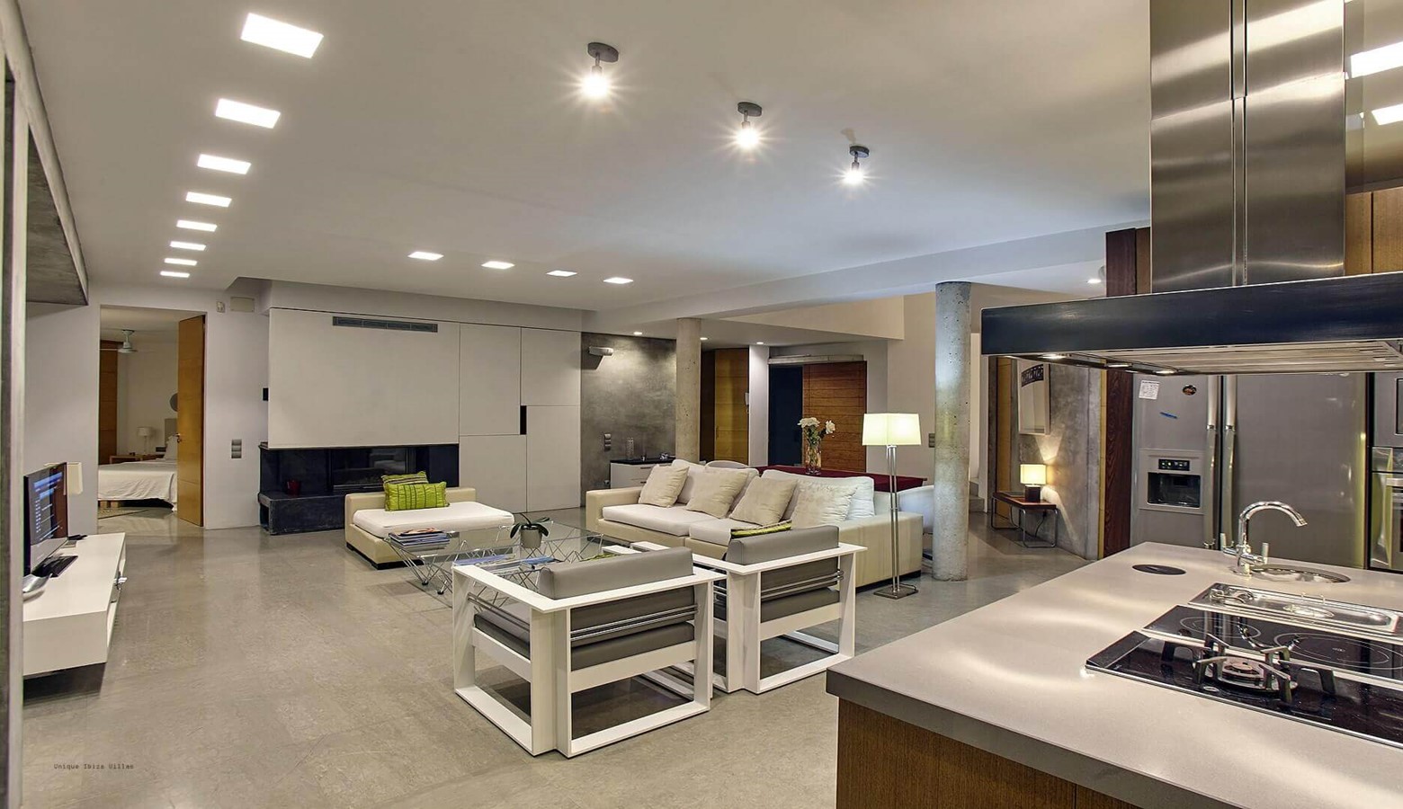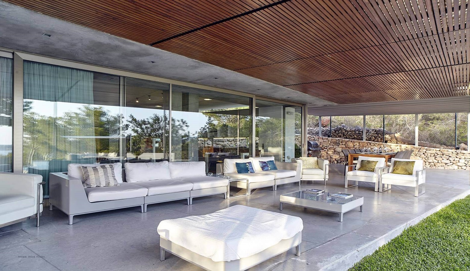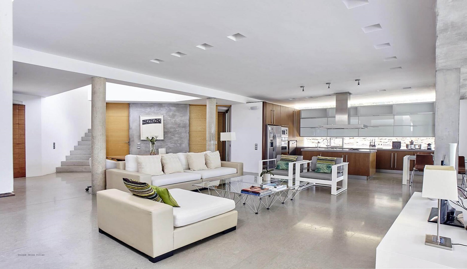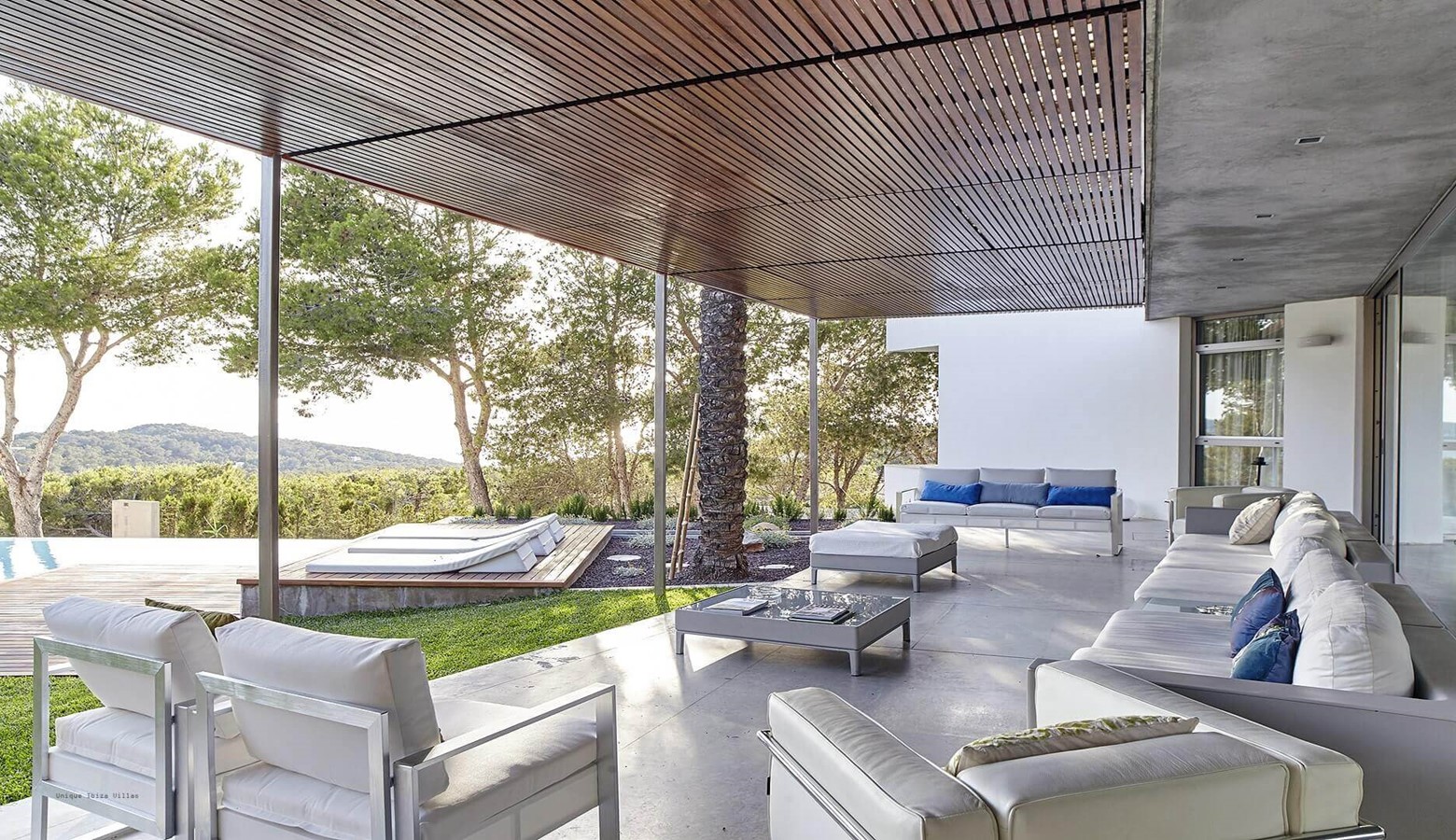 The living area is a mix of whitewashed walls and polished concrete, and floor to ceiling windows leading to the gardens and pool