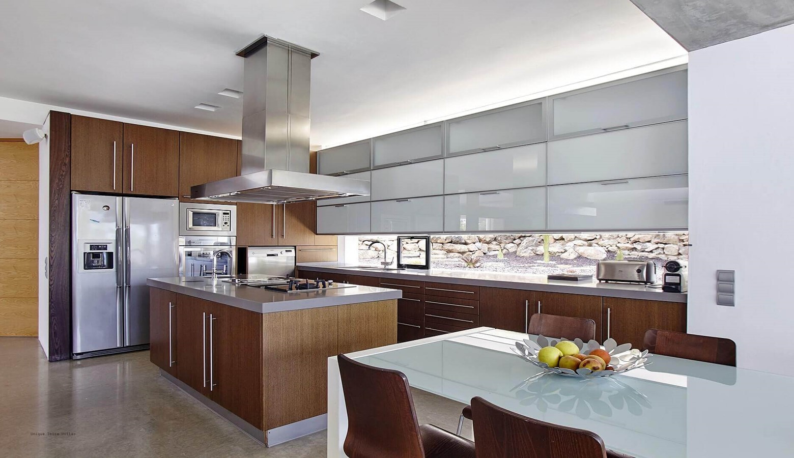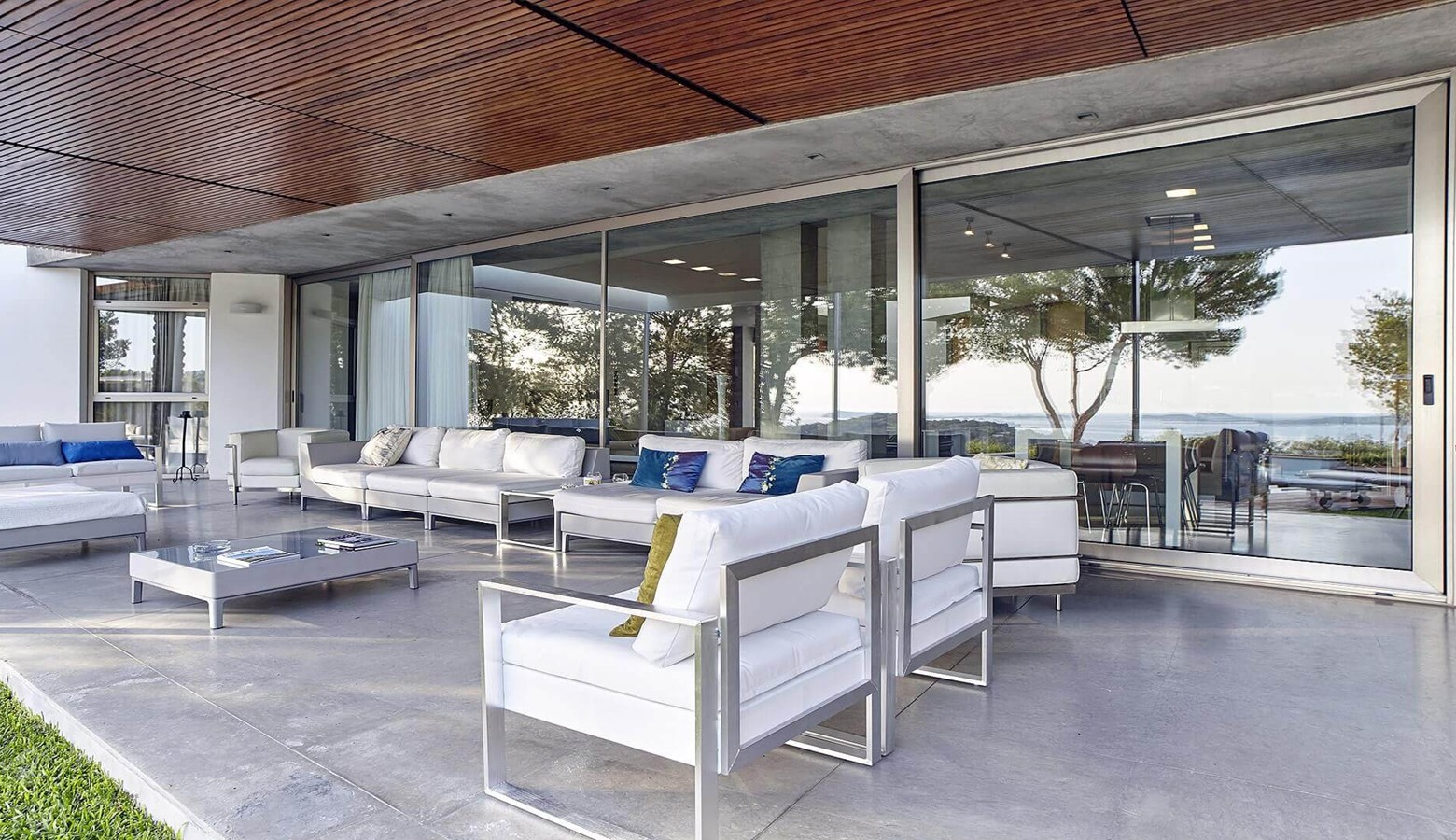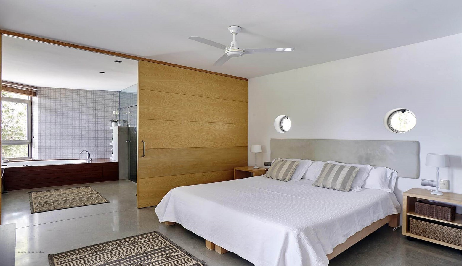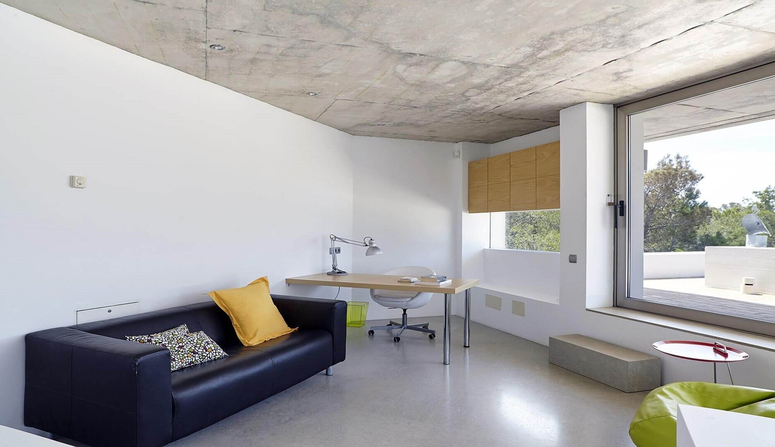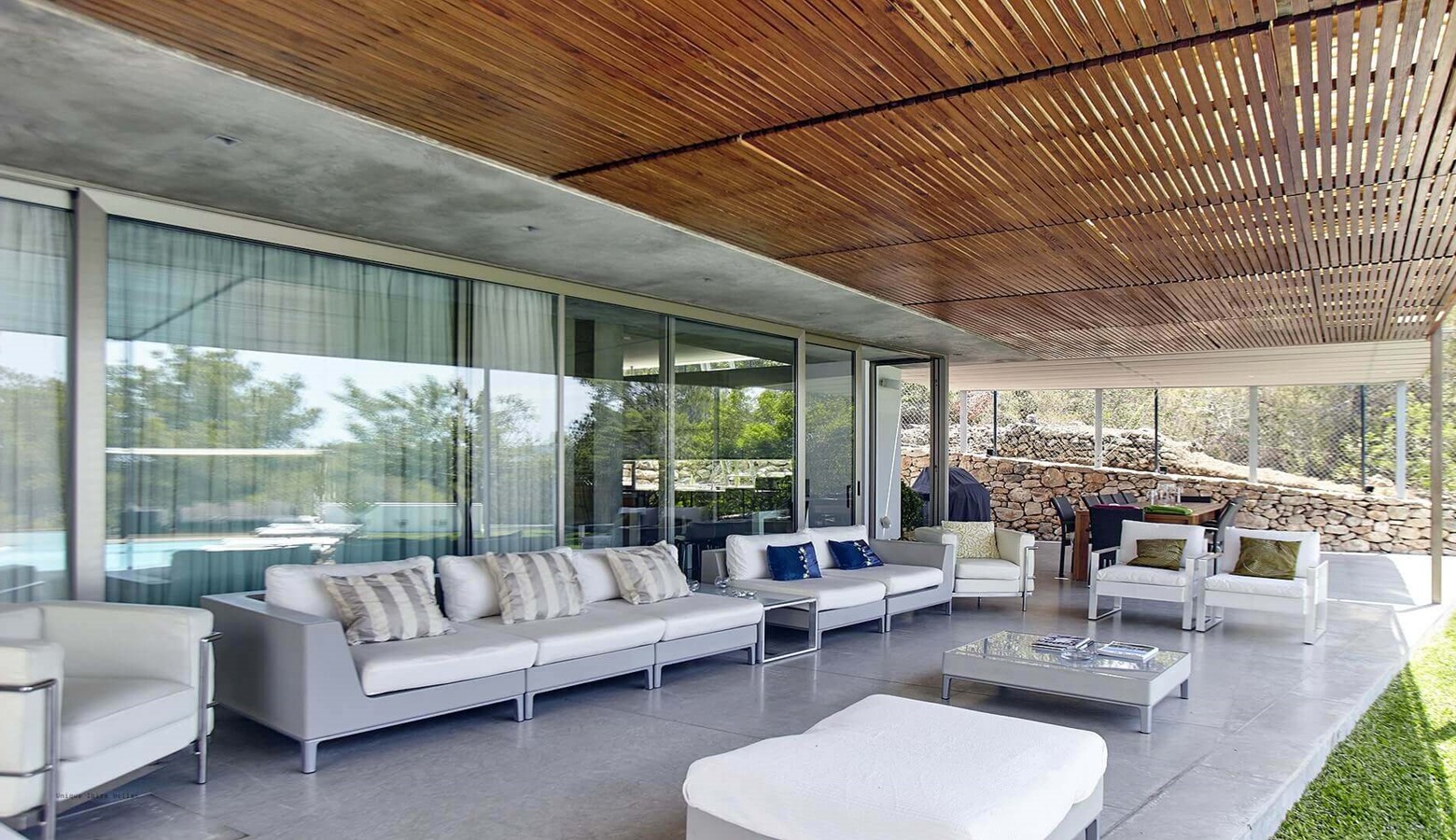 The living area is a mix of whitewashed walls and polished concrete, and floor to ceiling windows leading to the gardens and pool