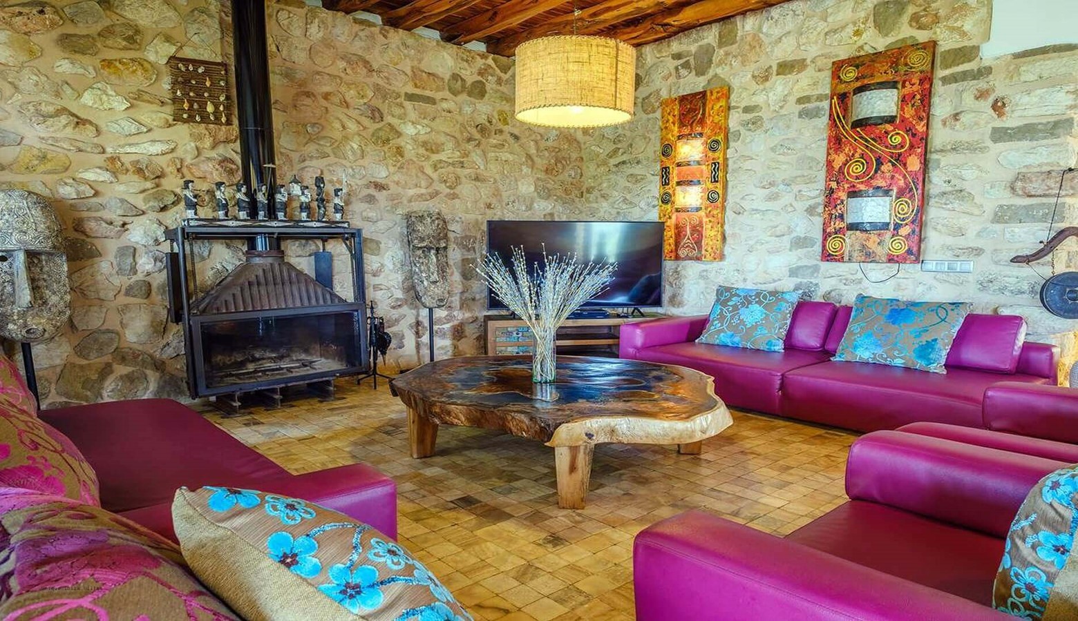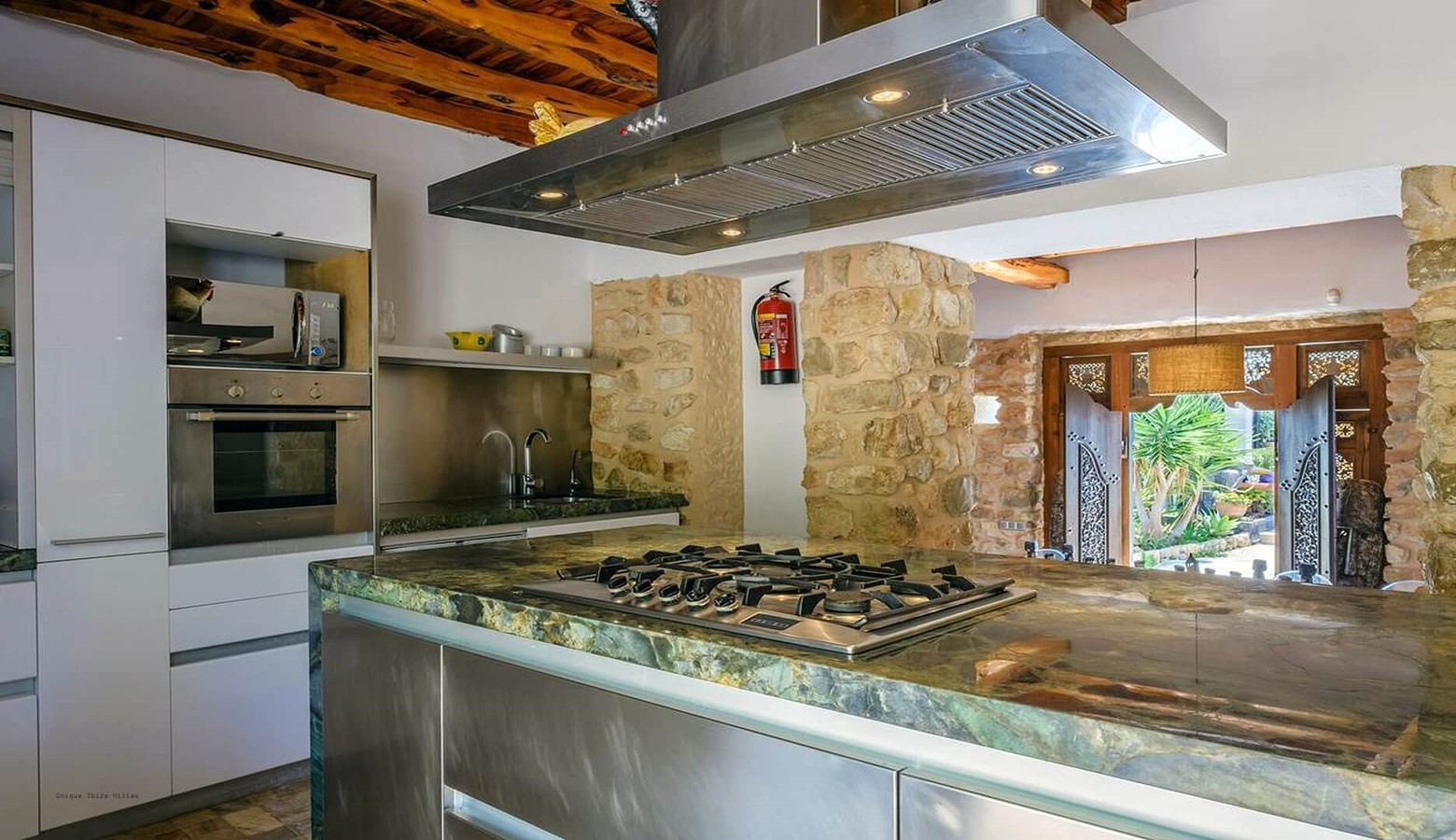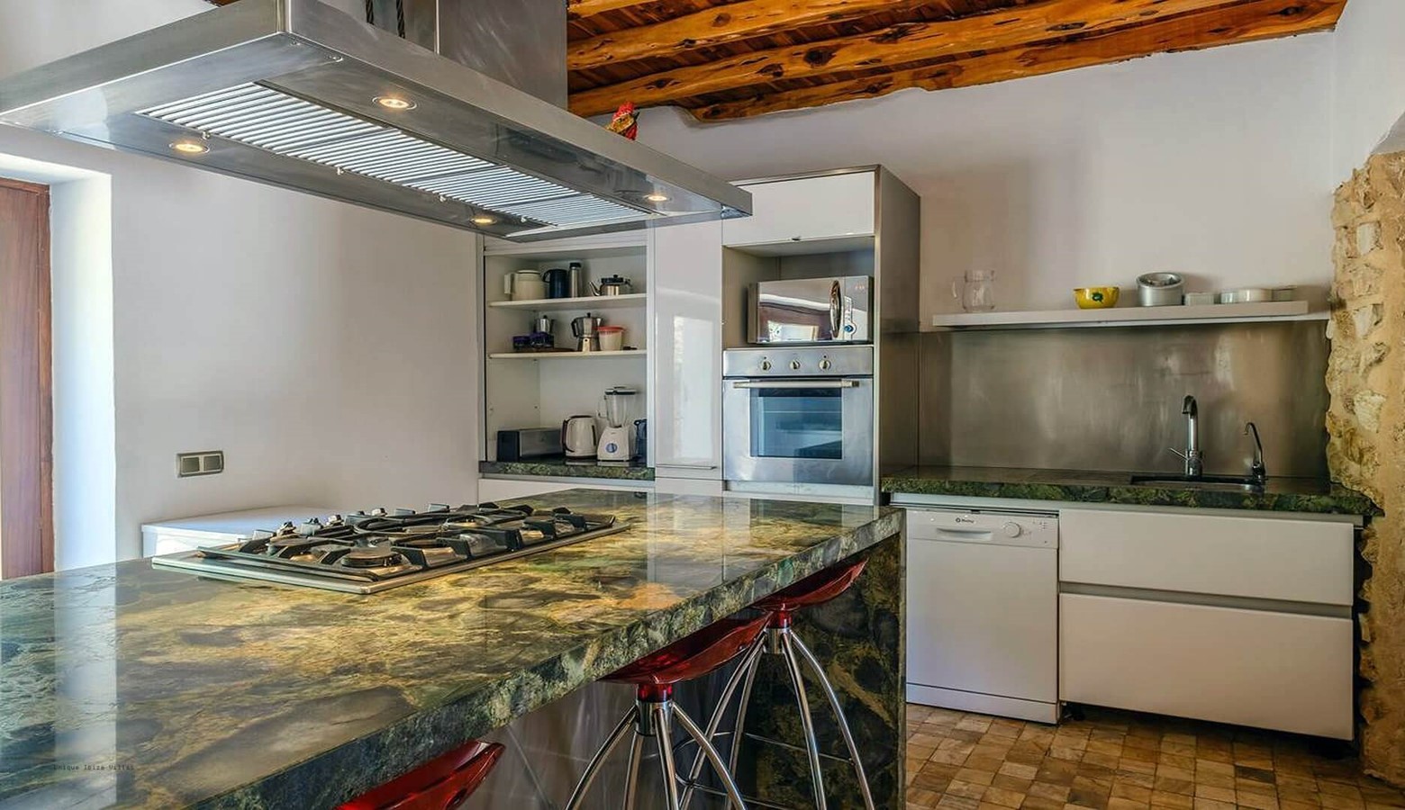 Fully equipped and functional kitchen Sabina wood ceiling and exposed brick walls with gas hob and over, breakfast bar, fridge freezer, microwave, coffee machine etc