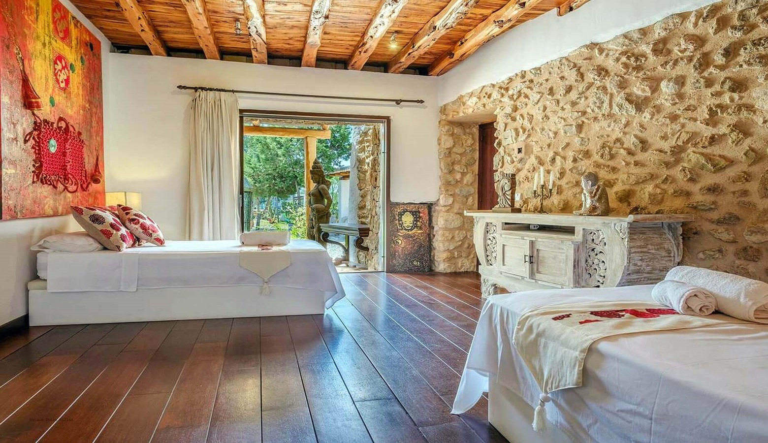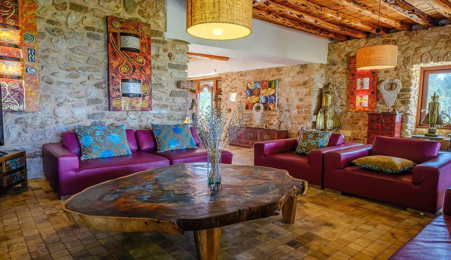 Villa Kumharas is a 5 bedroom villa with sea & sunset views located close to the beaches of Cala Salada and Cala Saladeta on the west coast of Ibiza. Part of the original finca date back over 500 years and this restored house has remained loyal to the Ibicencan farmhouse style with exposed brick walls and Sabina wood ceilings in most rooms