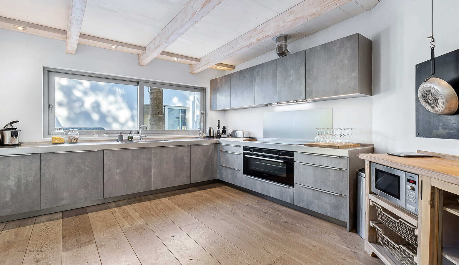 Modern kitchen and large living / dining area which leads to the outside dining / pool