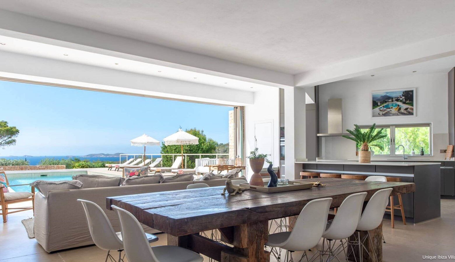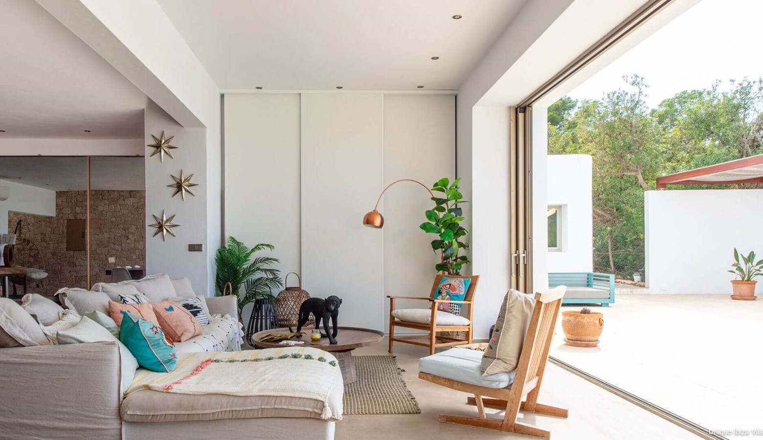 Large living area with modern decor and white washed walls that open to the terrace / pool area / outside dining; the perfect spot for sea & sunset views