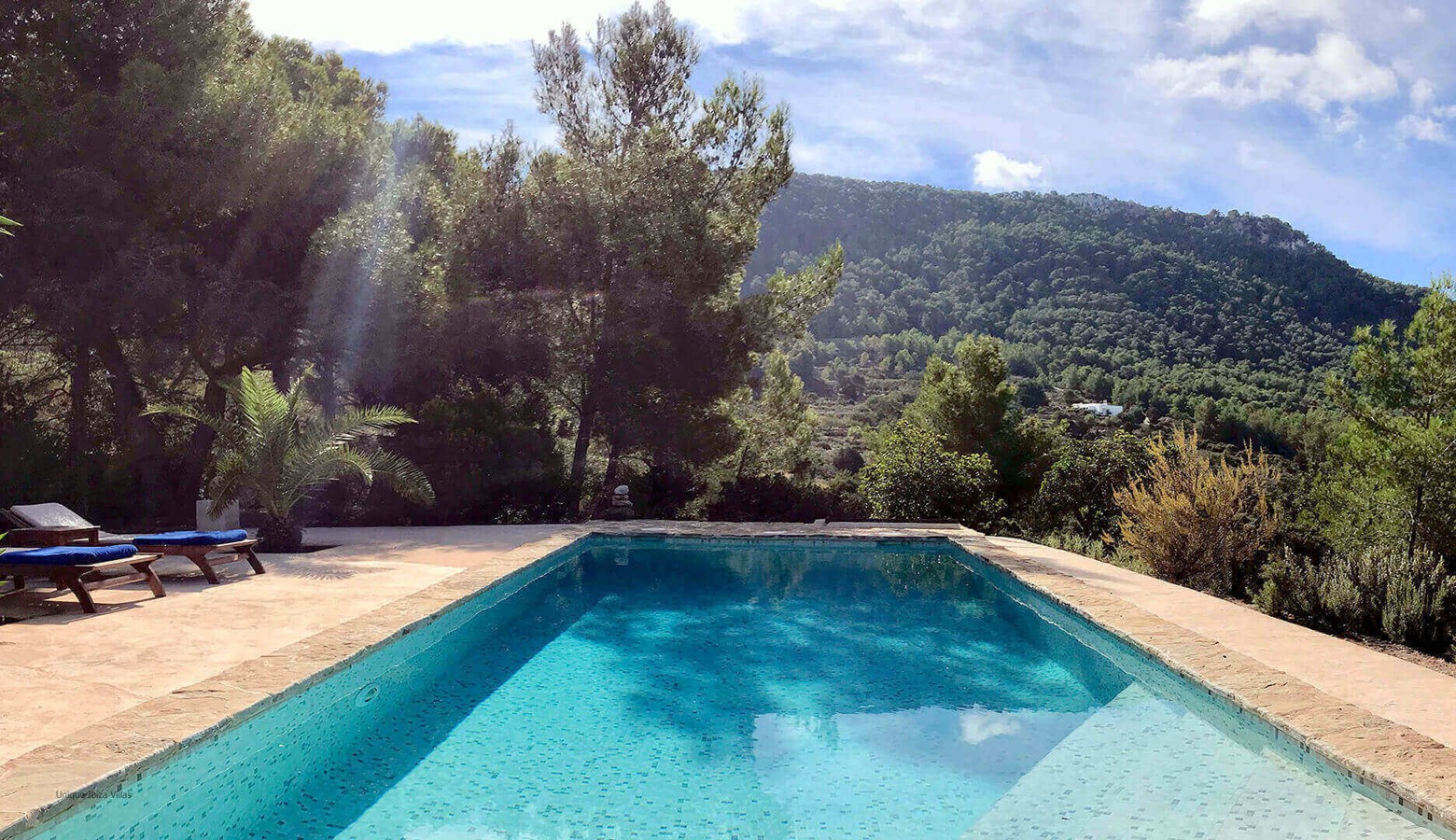 Villa Petunia is reached along a country track and is nestled amongst the pine tree covered hills, with distant sea views and from where you also have views to the iconic Es Vedra island. The nearest beach is the relaxed and family friendly sandy beach at Cala Vadella only about 3 kilometres away, which is also well known for experiencing fantastic sunsets throughout most of the year; Villa Petunia is west facing so you will also experience the sunset through the trees, particularly from the upper floor of the house.