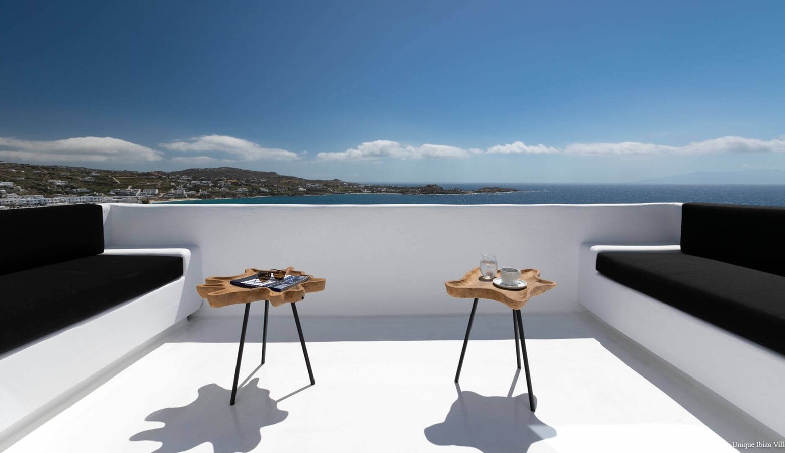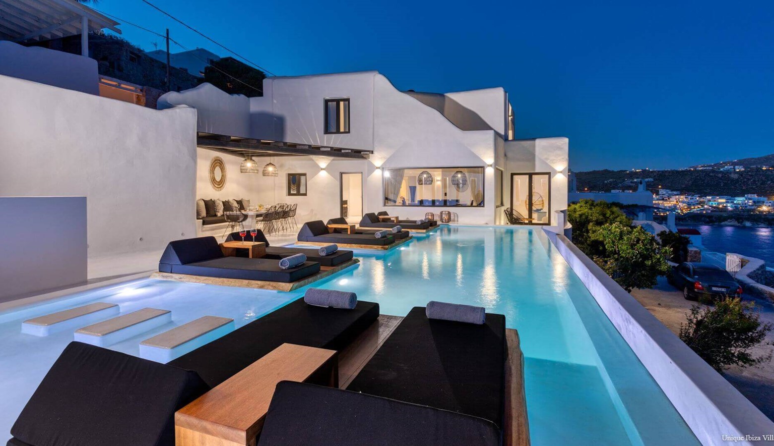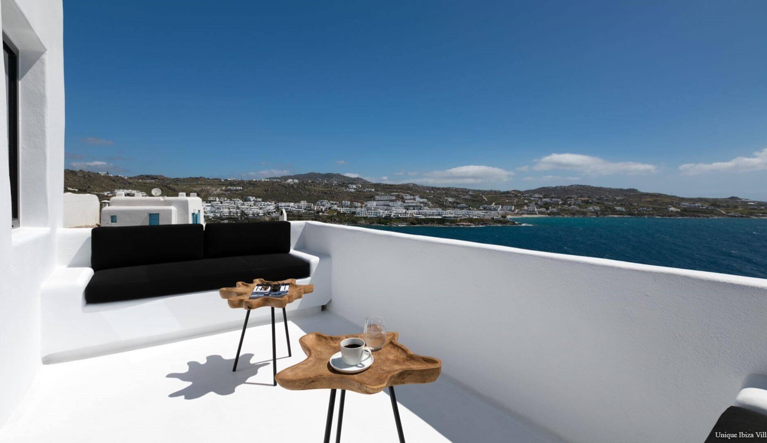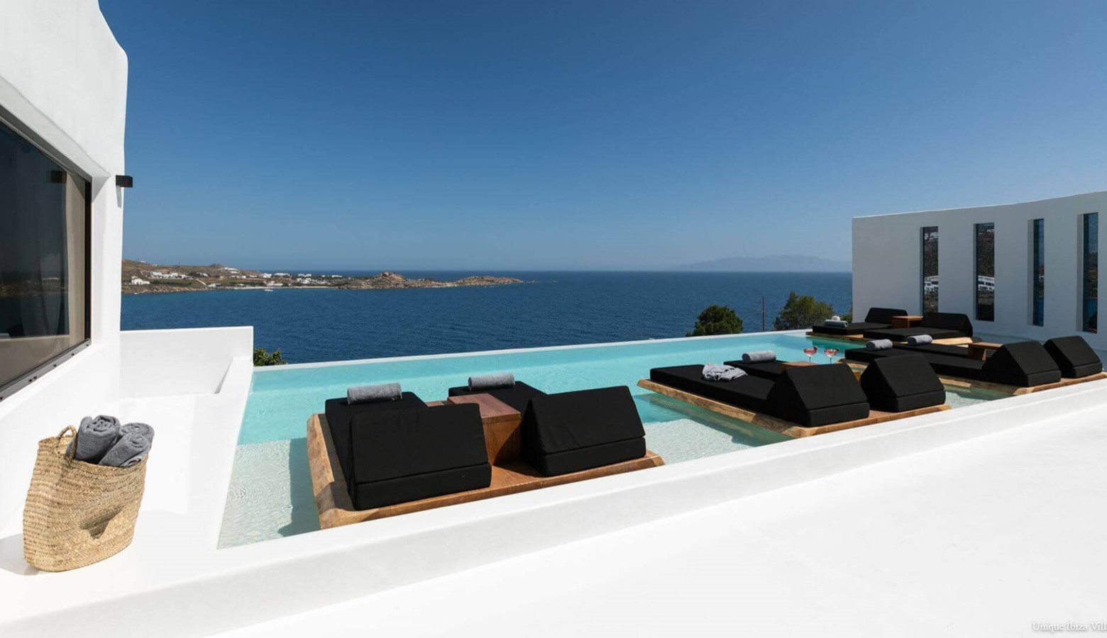 Villa Black Diamond I is 5 bedroom (sleeps 10) high end luxury modern villa with sea views (and views towards the neighbouring islands of Naxos & Paros) in the area of Agios Lazarus and overlooking (a 3 kilometres drive) to Psarou beach (home to Nammos Restaurant).